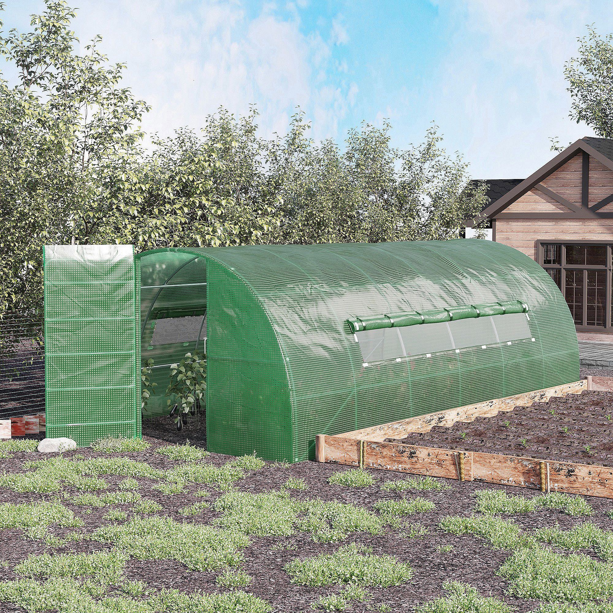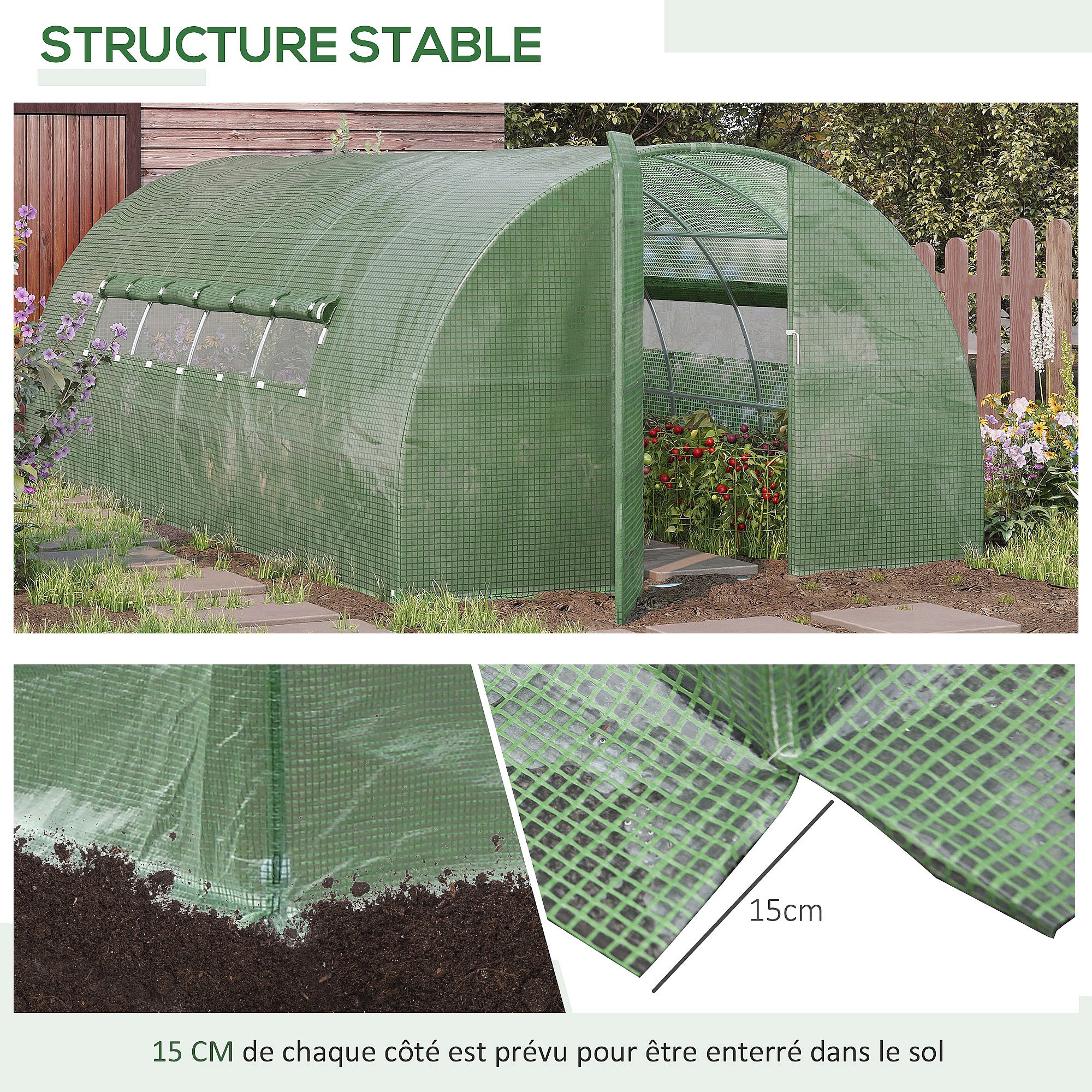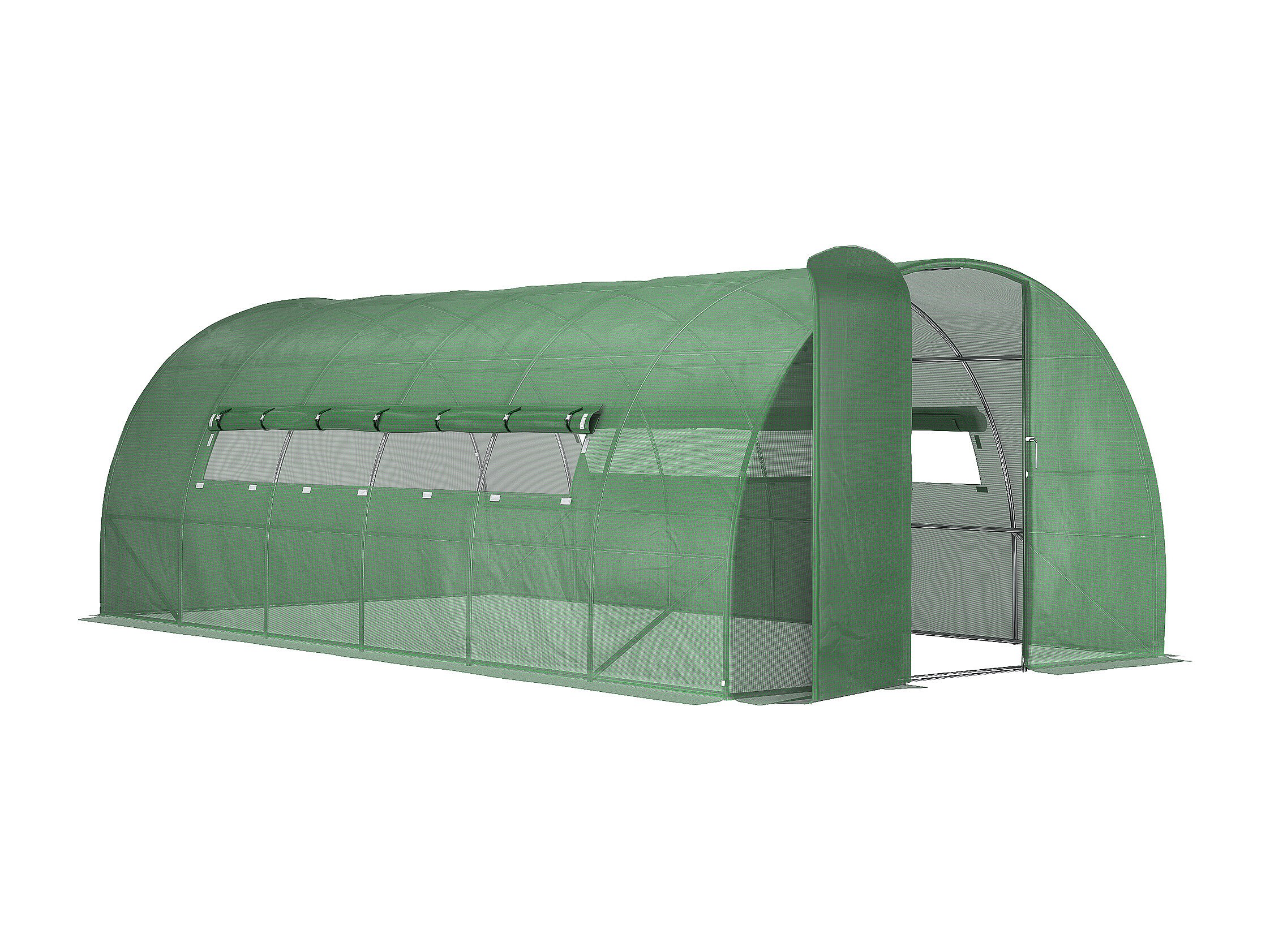 Serre de jardin tunnel 16,64 m² acier galvanisé renforcé diamètre 2,4 cm + PE haute densité fenêtres porte vert