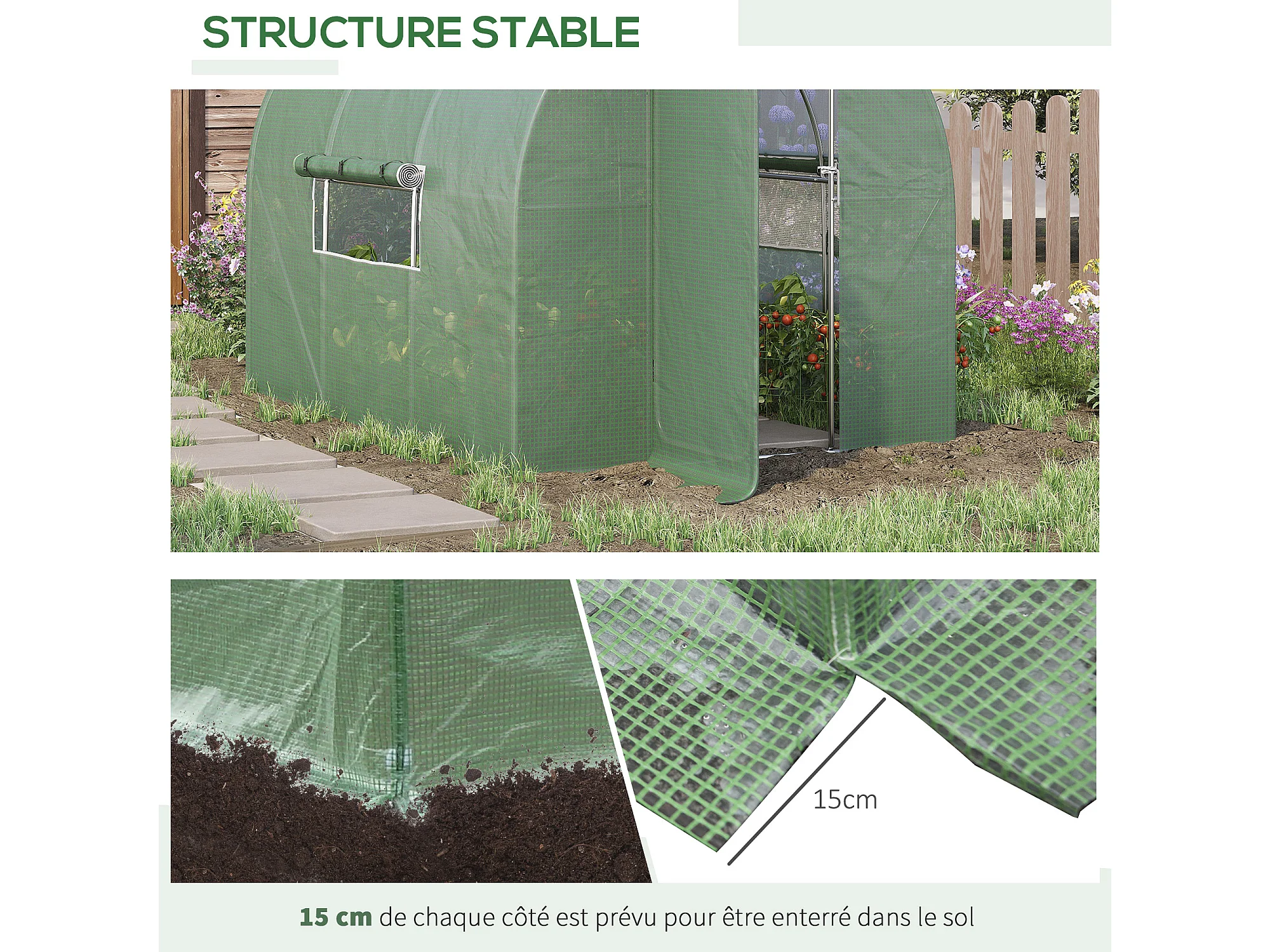 Serre de jardin tunnel surface sol 4,5 m² dim. 3L x 1,5l x 2H m châssis tubulaire renforcé porte zippée 2 fenêtres enroulables vert