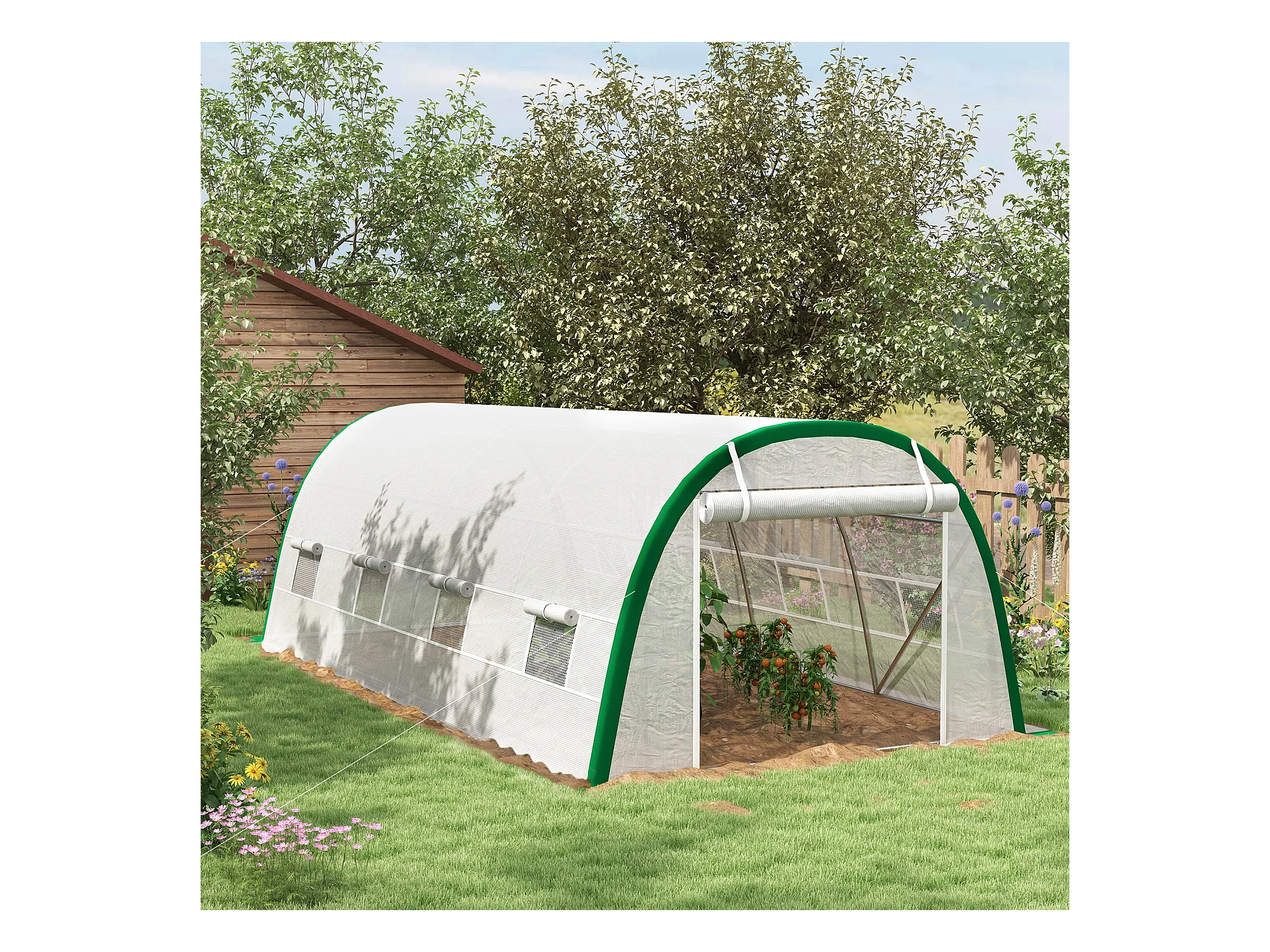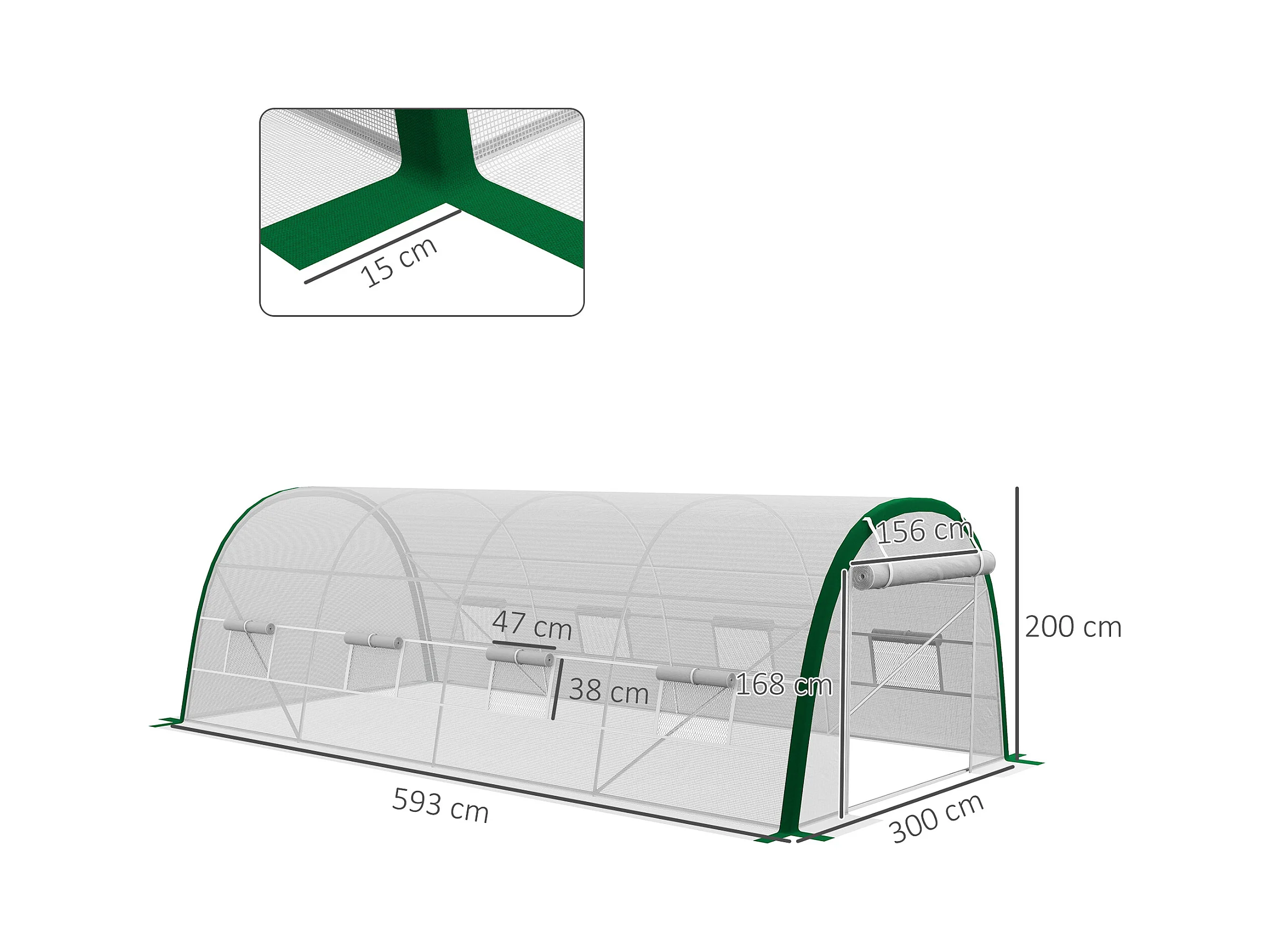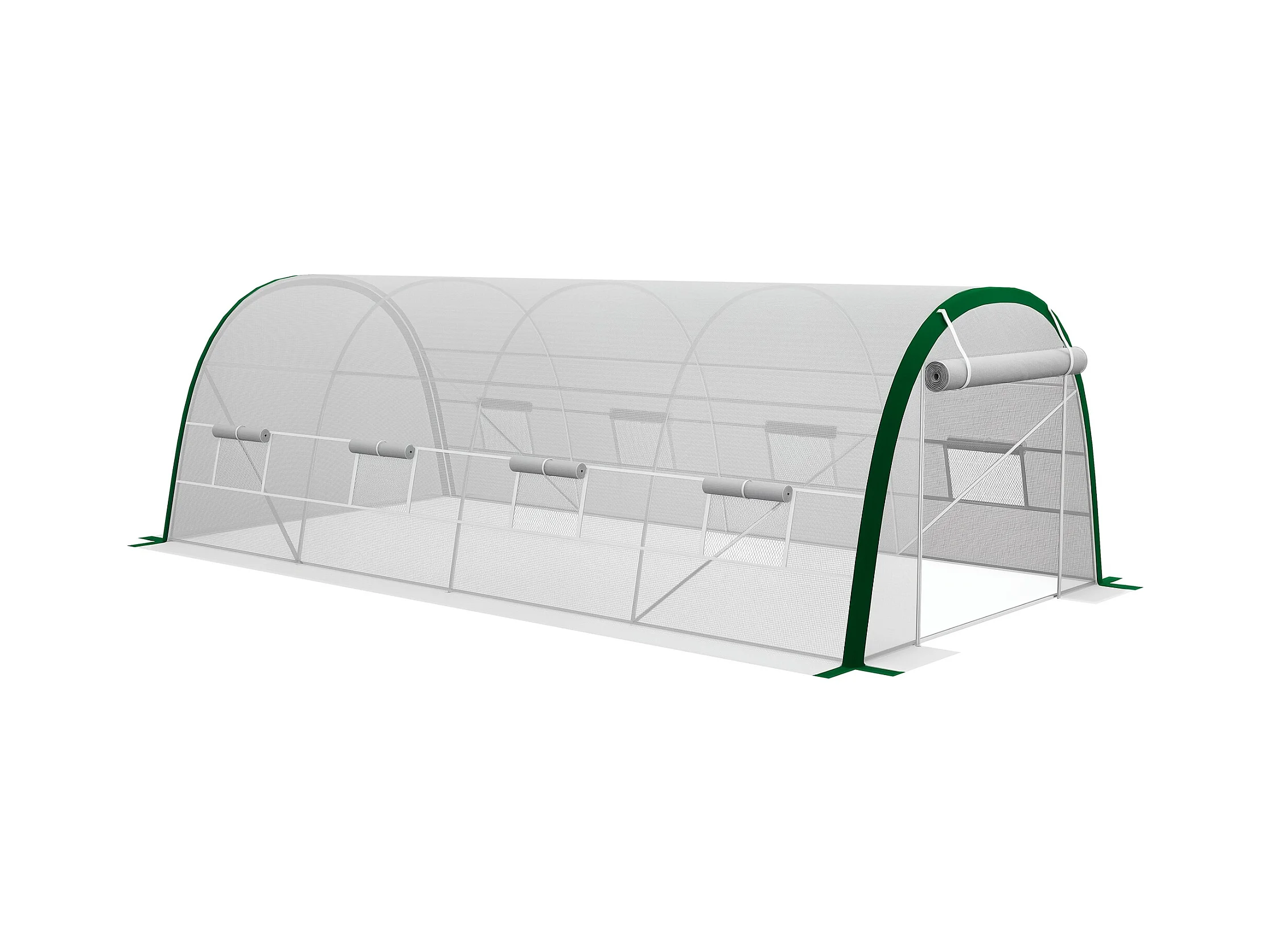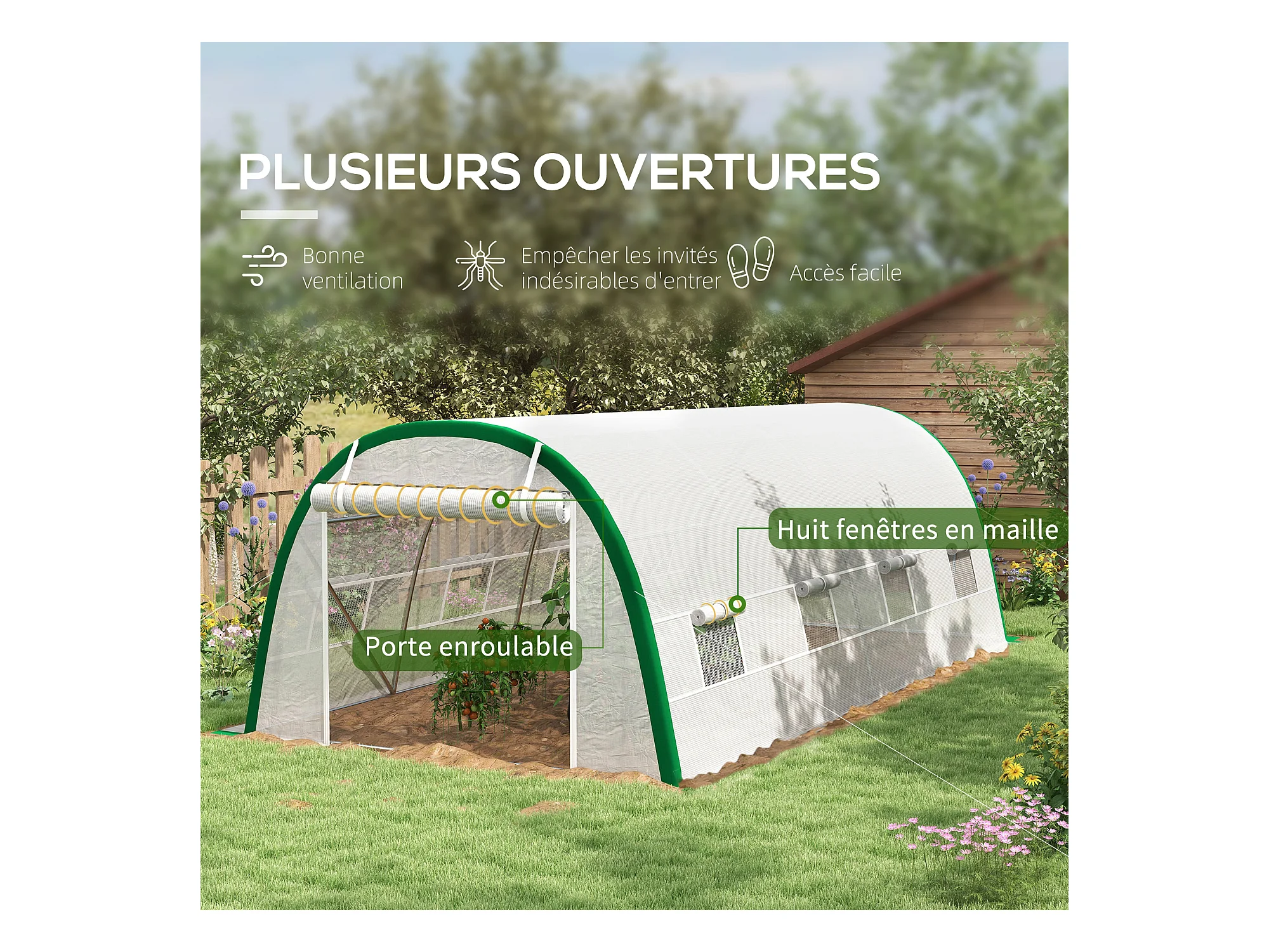 Serre de jardin tunnel surface sol 18 m² châssis tubulaire acier galvanisé renforcé 24 mm 8 fenêtres PE maillé blanc vert