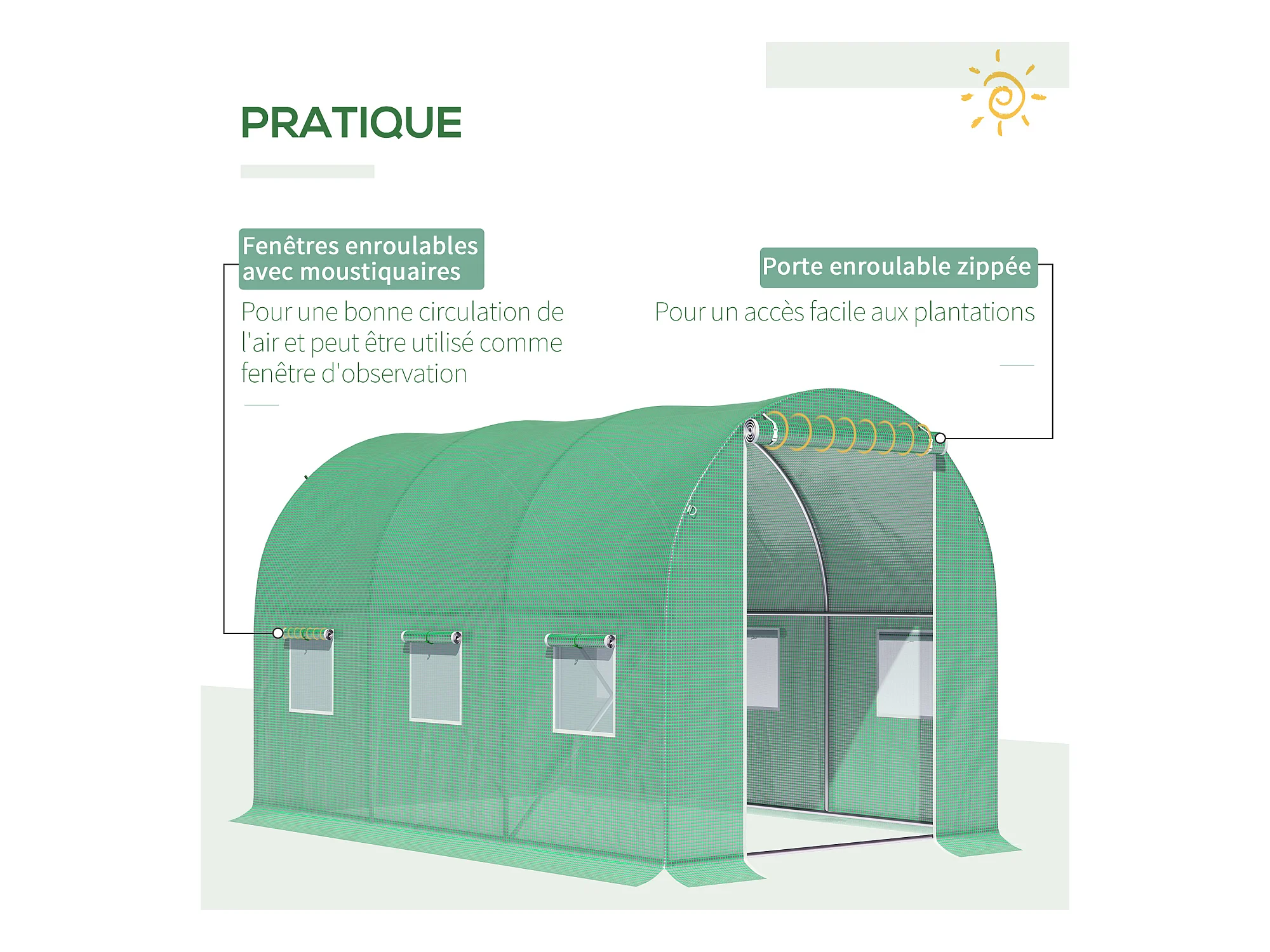 Serre de jardin tunnel surface sol 6 m² 3L x 2l x 2H m châssis tubulaire renforcé porte zippée 6 fenêtres enroulables vert