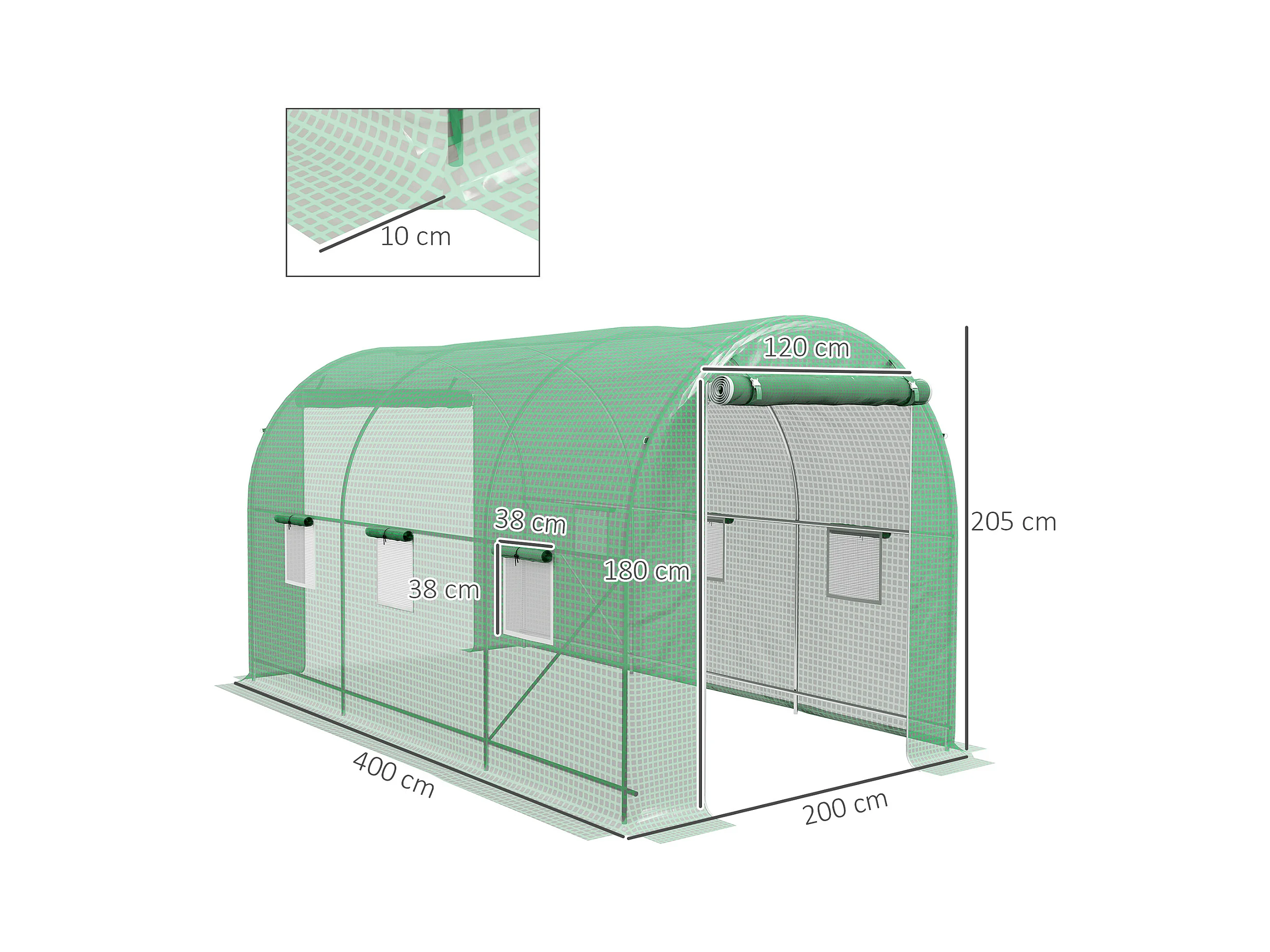 Serre de jardin tunnel surface sol 8 m² 4L x 2l x 2,05H m châssis tubulaire renforcé porte zippée 6 fenêtres enroulables vert