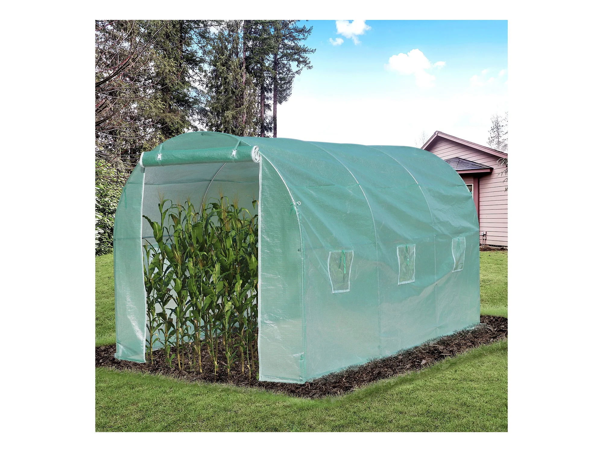Serre de jardin tunnel surface sol 6 m² 3L x 2l x 2,10H m châssis tubulaire renforcé porte zippée 4 fenêtres enroulables vert