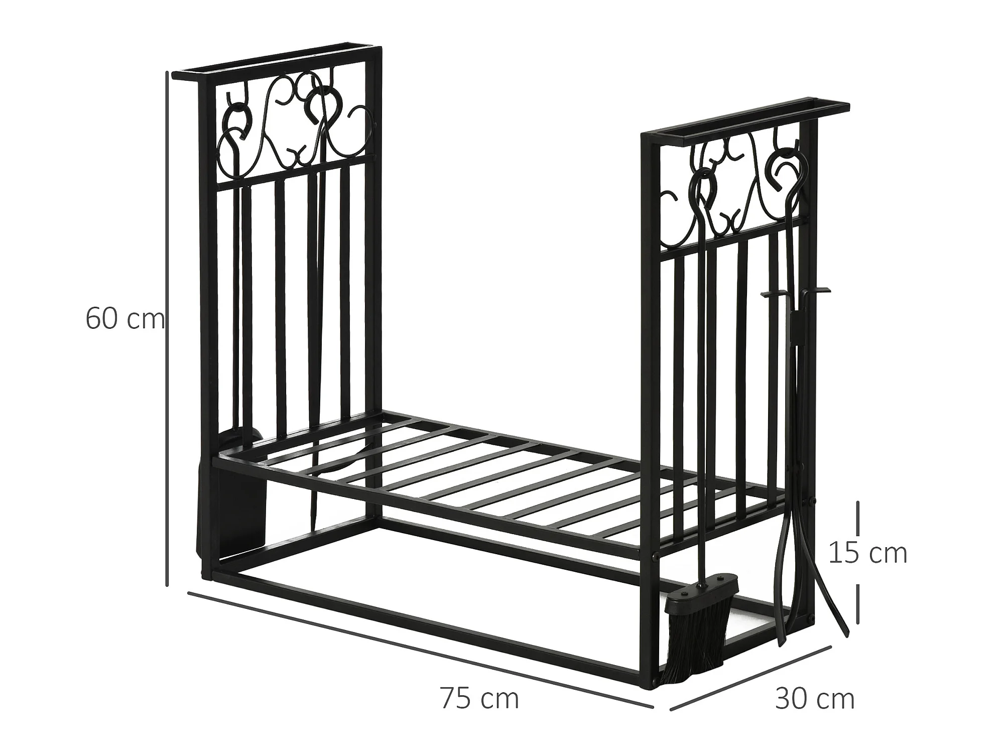 Serviteur de cheminée - porte bûches - range bûches multi accessoires étagère 75L x 30l x 60H cm acier noir