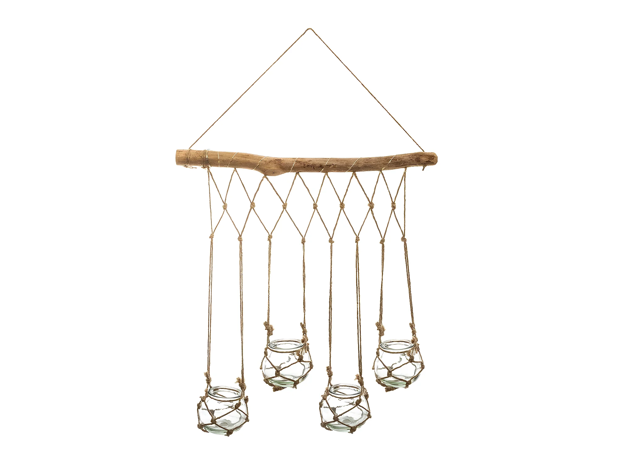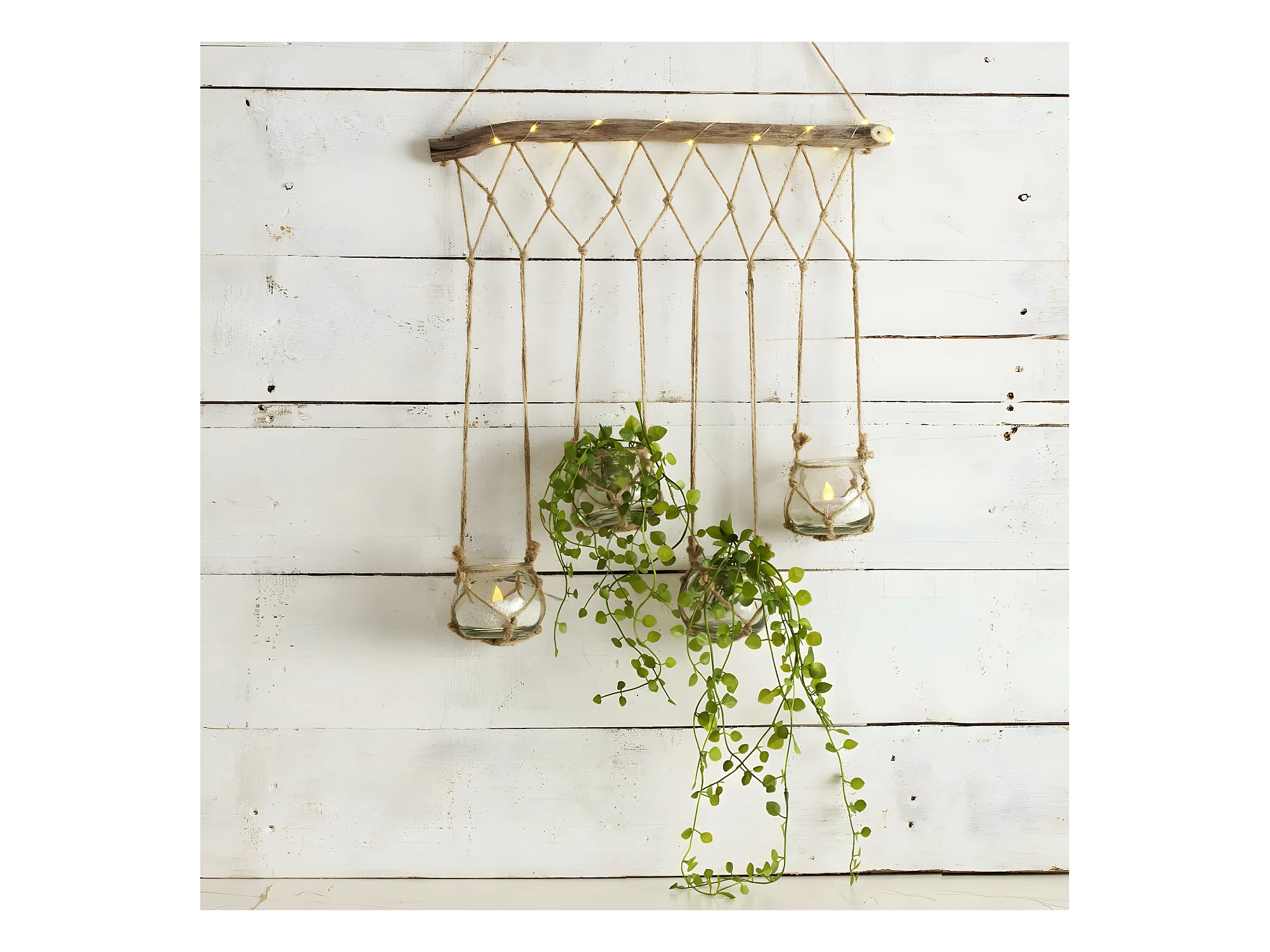 Set 4 Soliflores en Verre avec Suspension corde et Bois de sapin avec éclairage LED