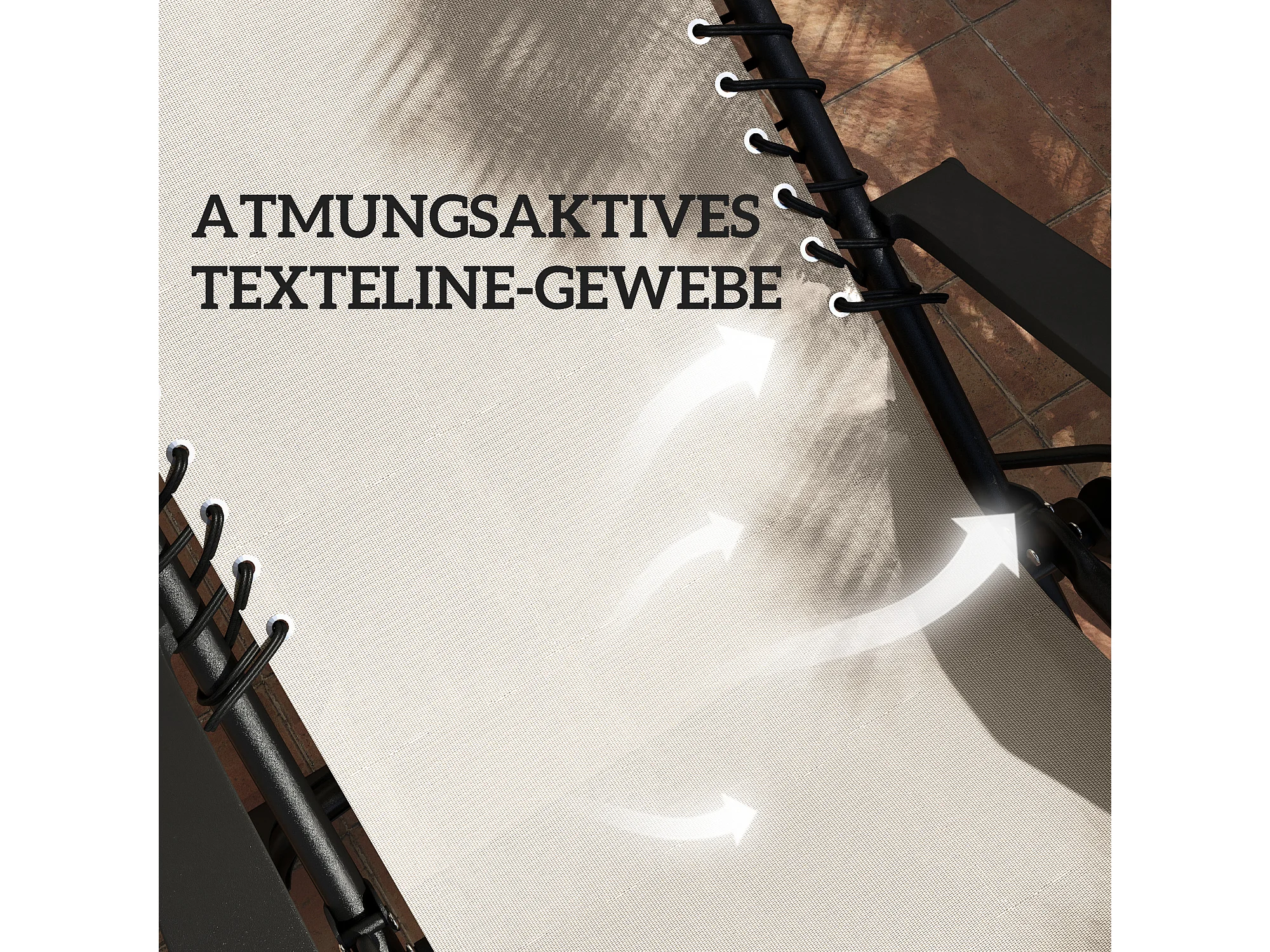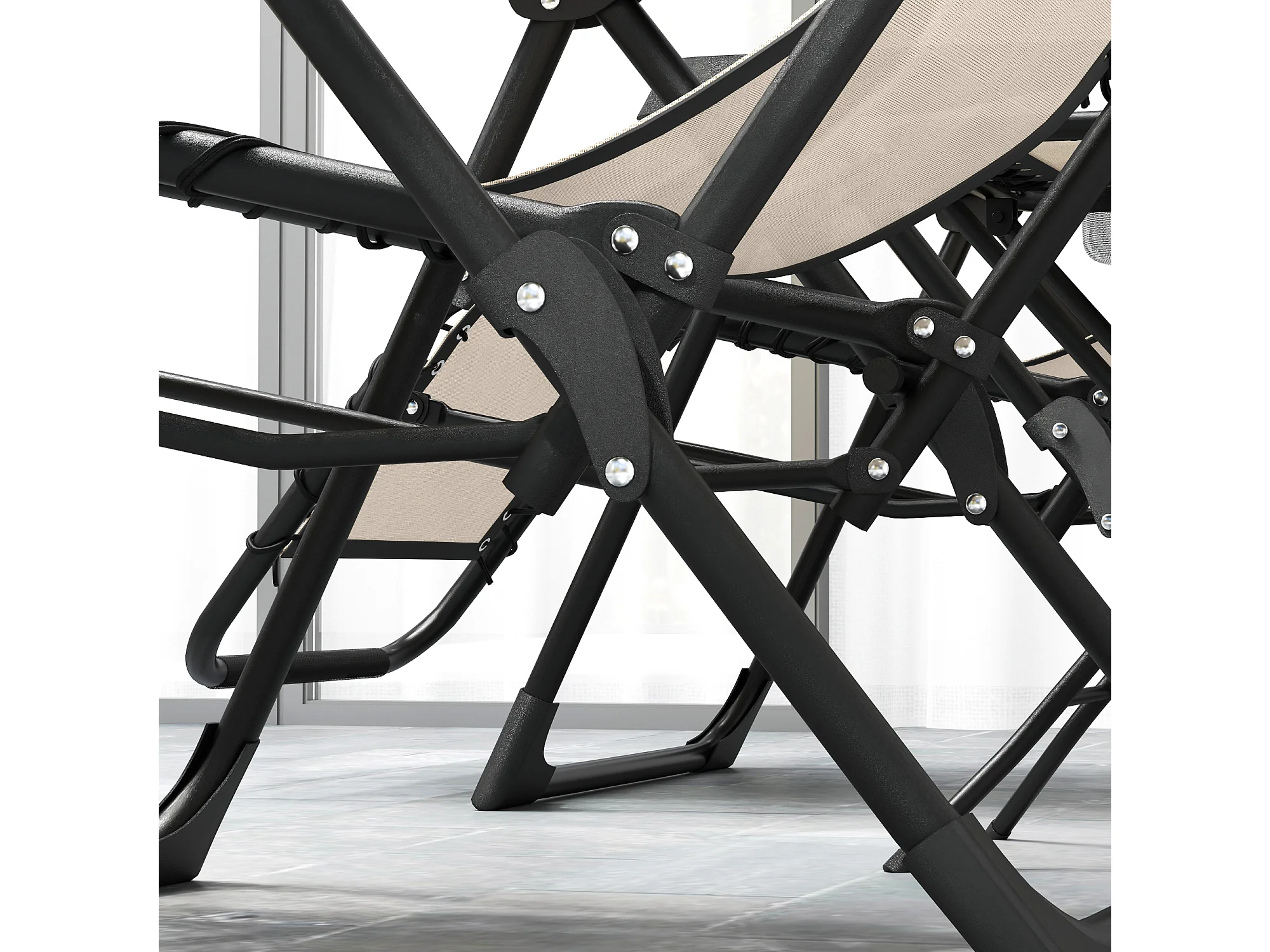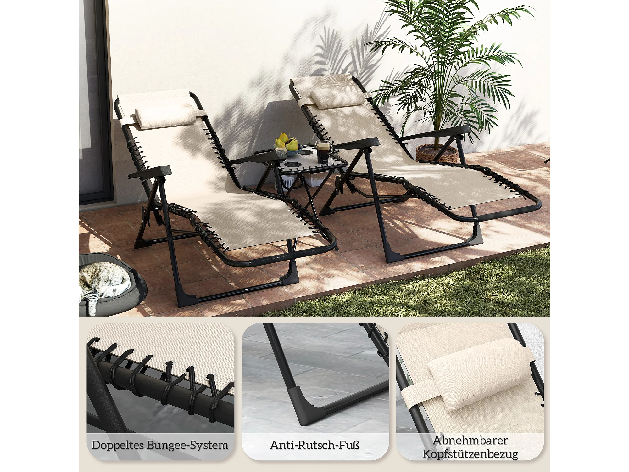 Set bain de soleil pliant 3 pièces, 2 fauteuils avec coussins, table avec porte-gobelets, métal, beige (90x65x110cm)