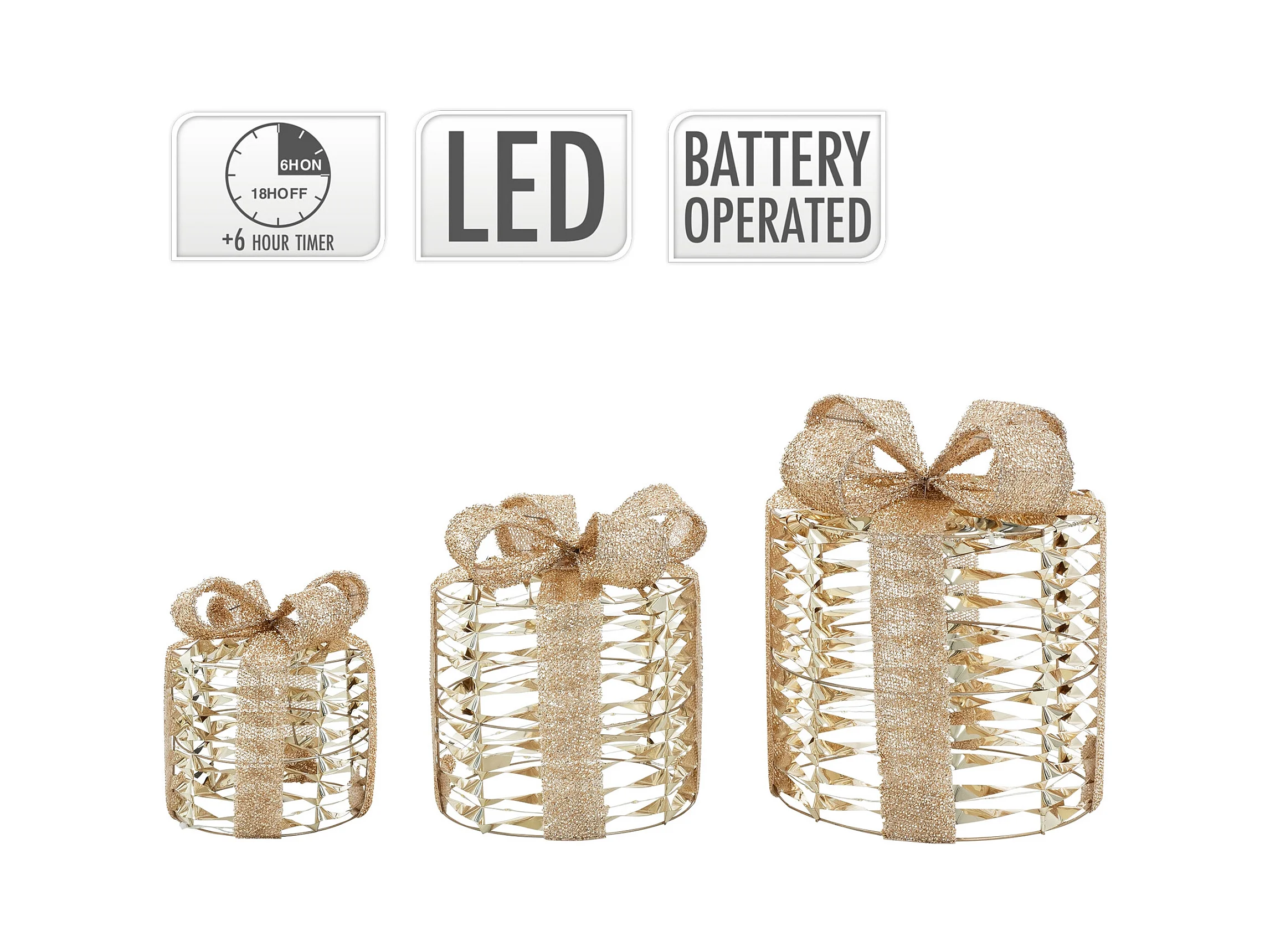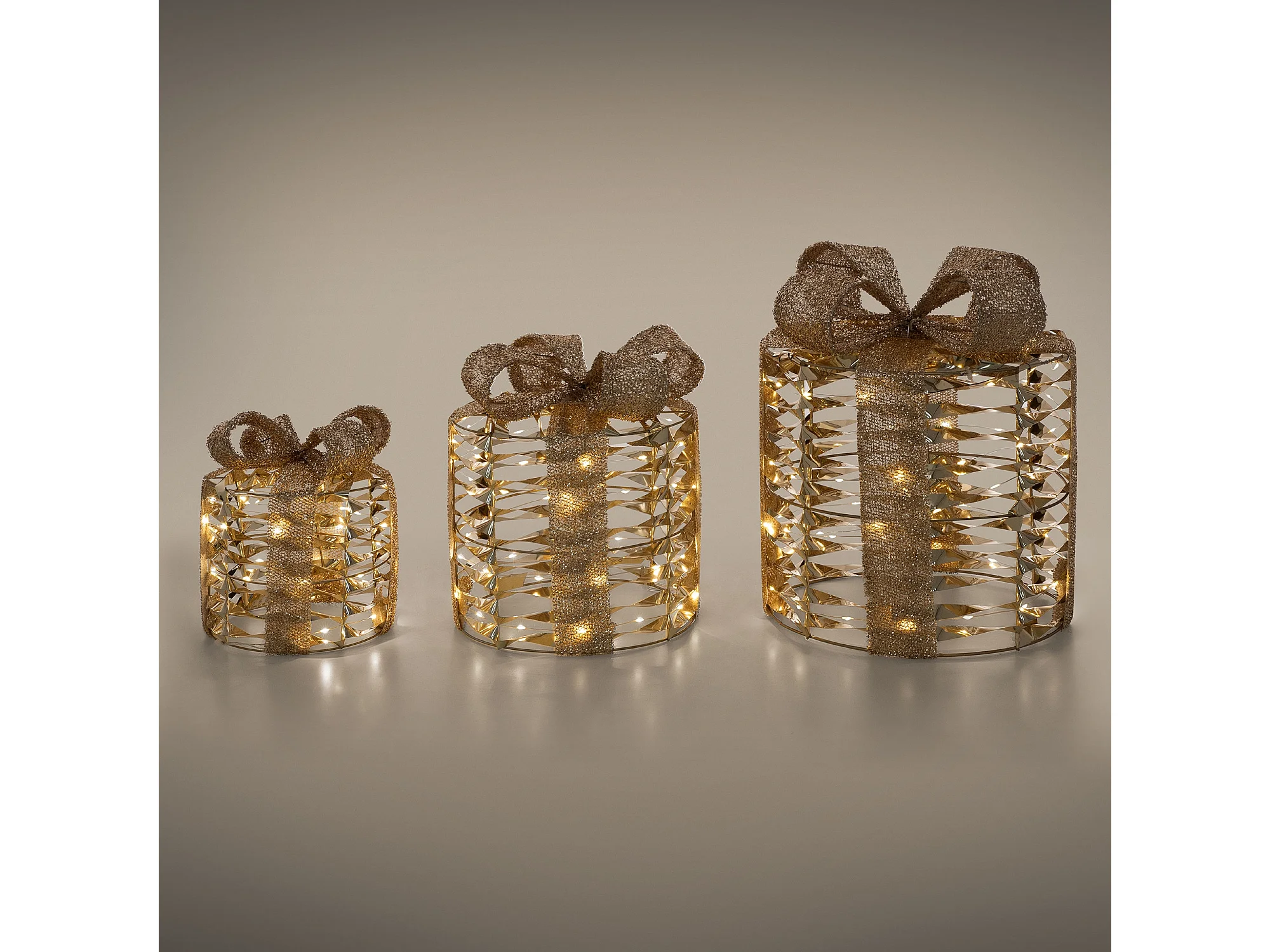Set de 3 boîtes cadeaux de noël à led dorées 135 led blanc chaud structure en fil métallique décoration saison fonctionne sur piles minuterie inclus