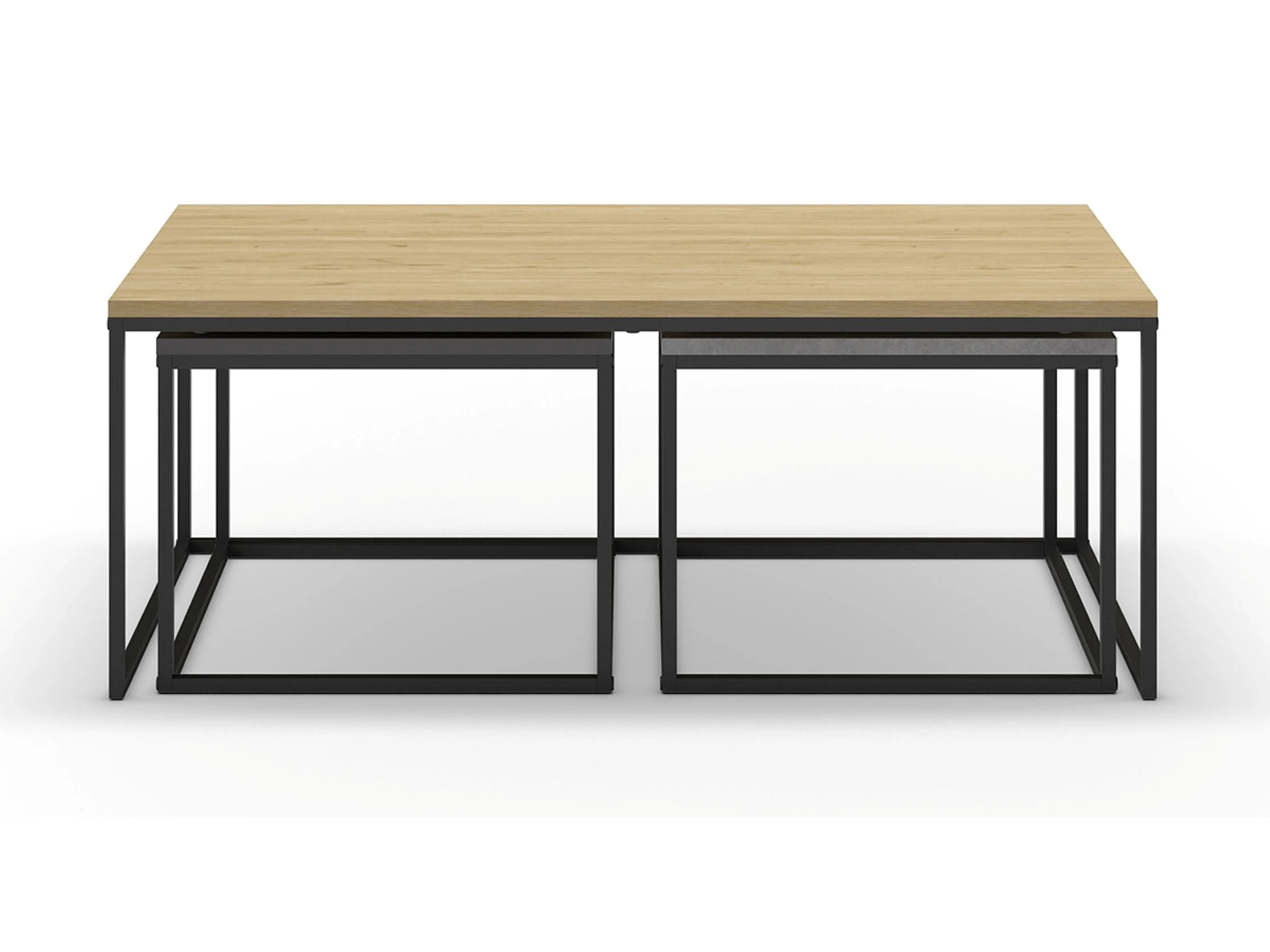 Set de 3 tables basses, tables de salon aspect bois coloris chêne, ciment et métal coloris noir