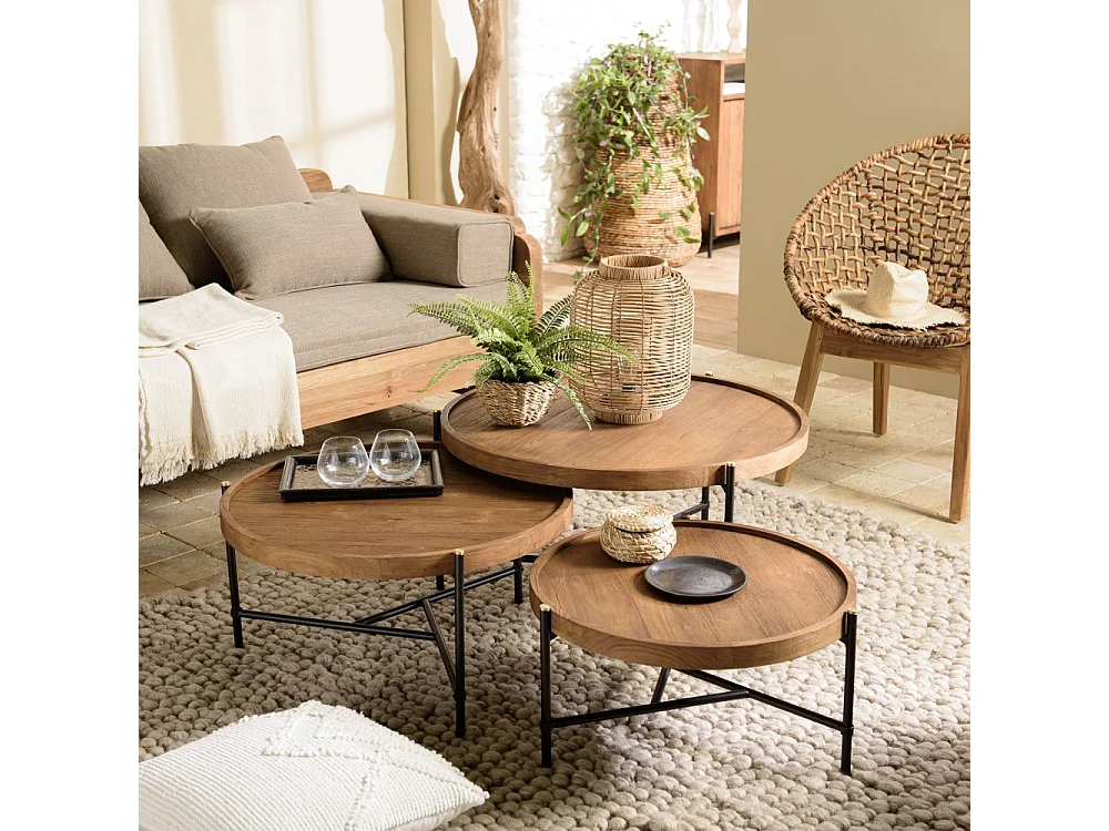 SIXTINE - Set de 3 tables basses tripodes rondes bois de teck recyclé