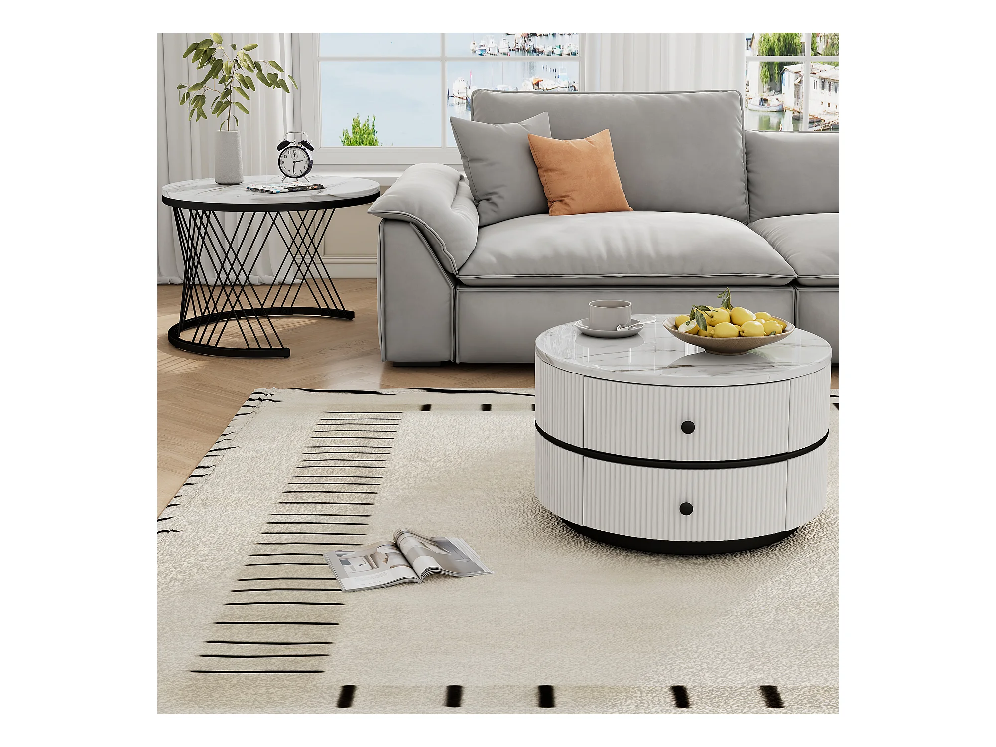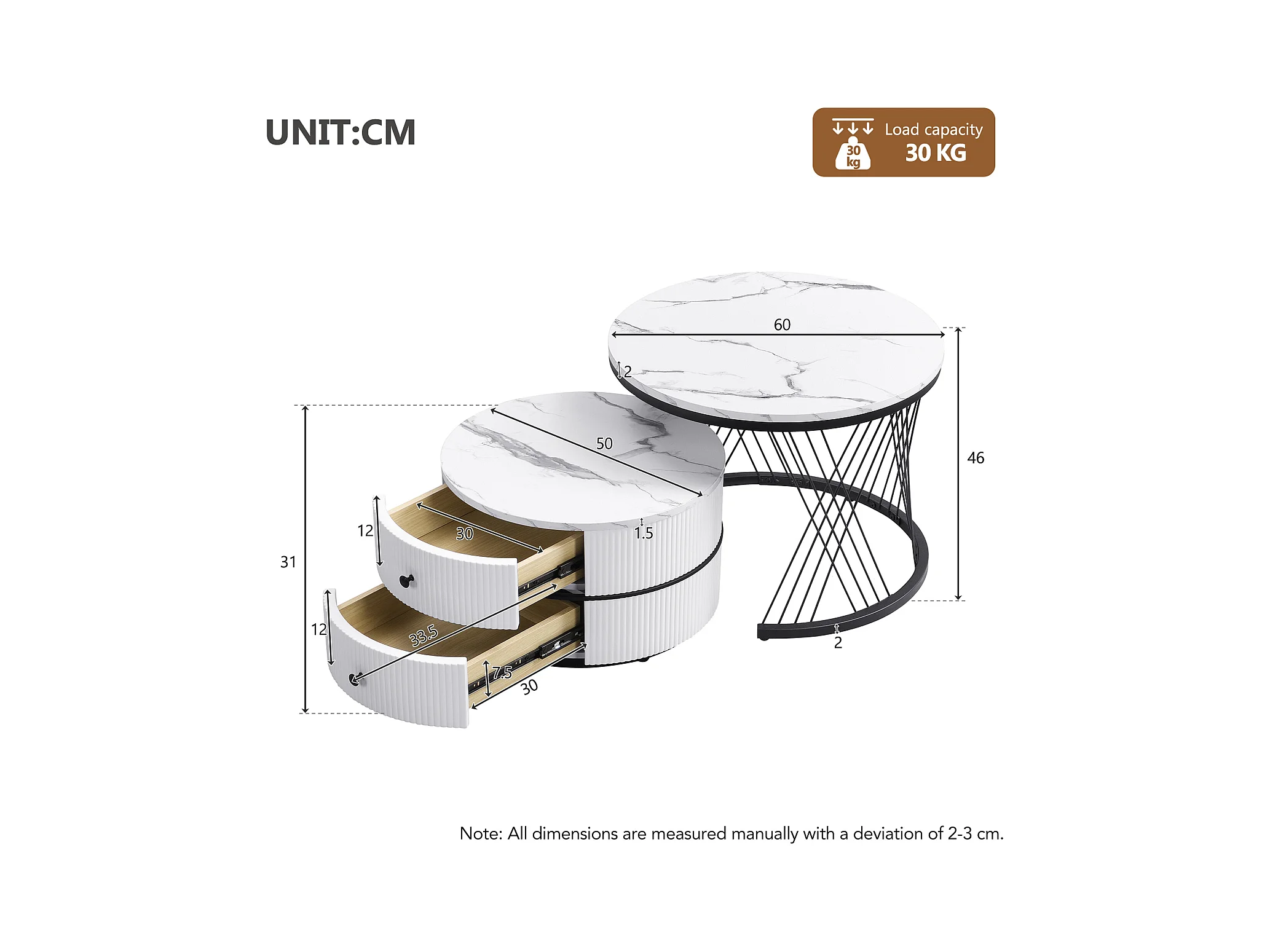Set de tables basses empilables 2 pièces, design élégant, finition effet marbre brillant, 2 tiroirs, capacité de charge jusqu'à 30 kg