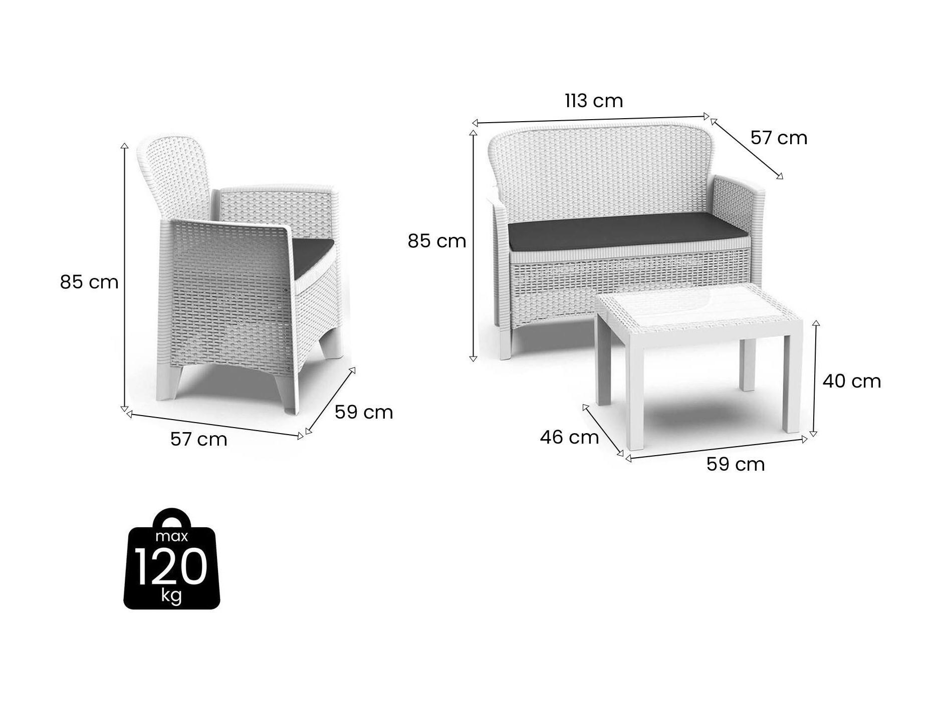 Set salon d'extérieur Debois, Salon de jardin composé de 2 fauteuils, 1 canapé et 1 table basse, Coin salon effet rotin avec coussins, 100% Made in Italy, Blanc