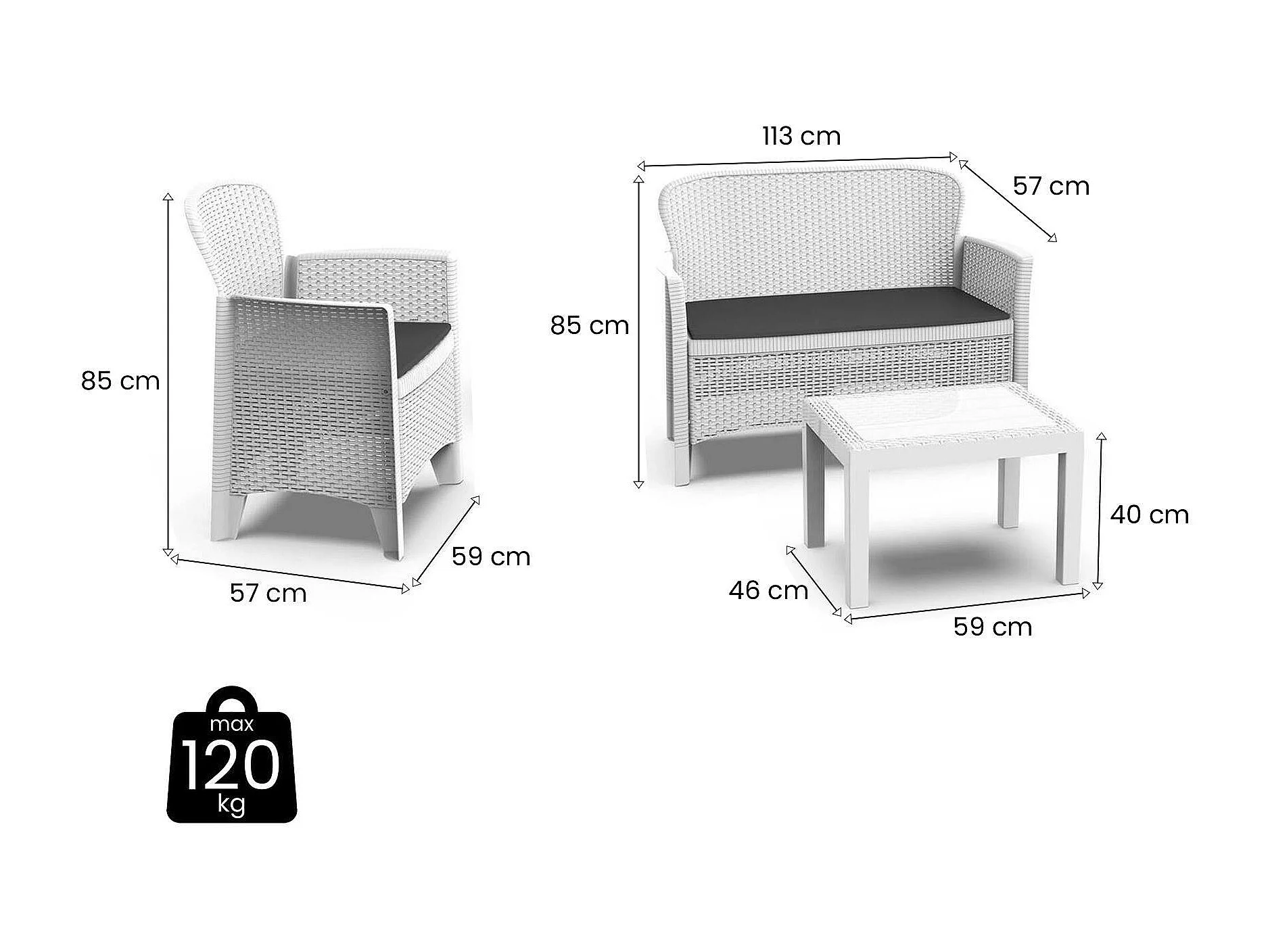 Set salon d'extérieur Debois, Salon de jardin composé de 2 fauteuils, 1 canapé et 1 table basse, Coin salon effet rotin avec coussins, 100% Made in Italy, Blanc