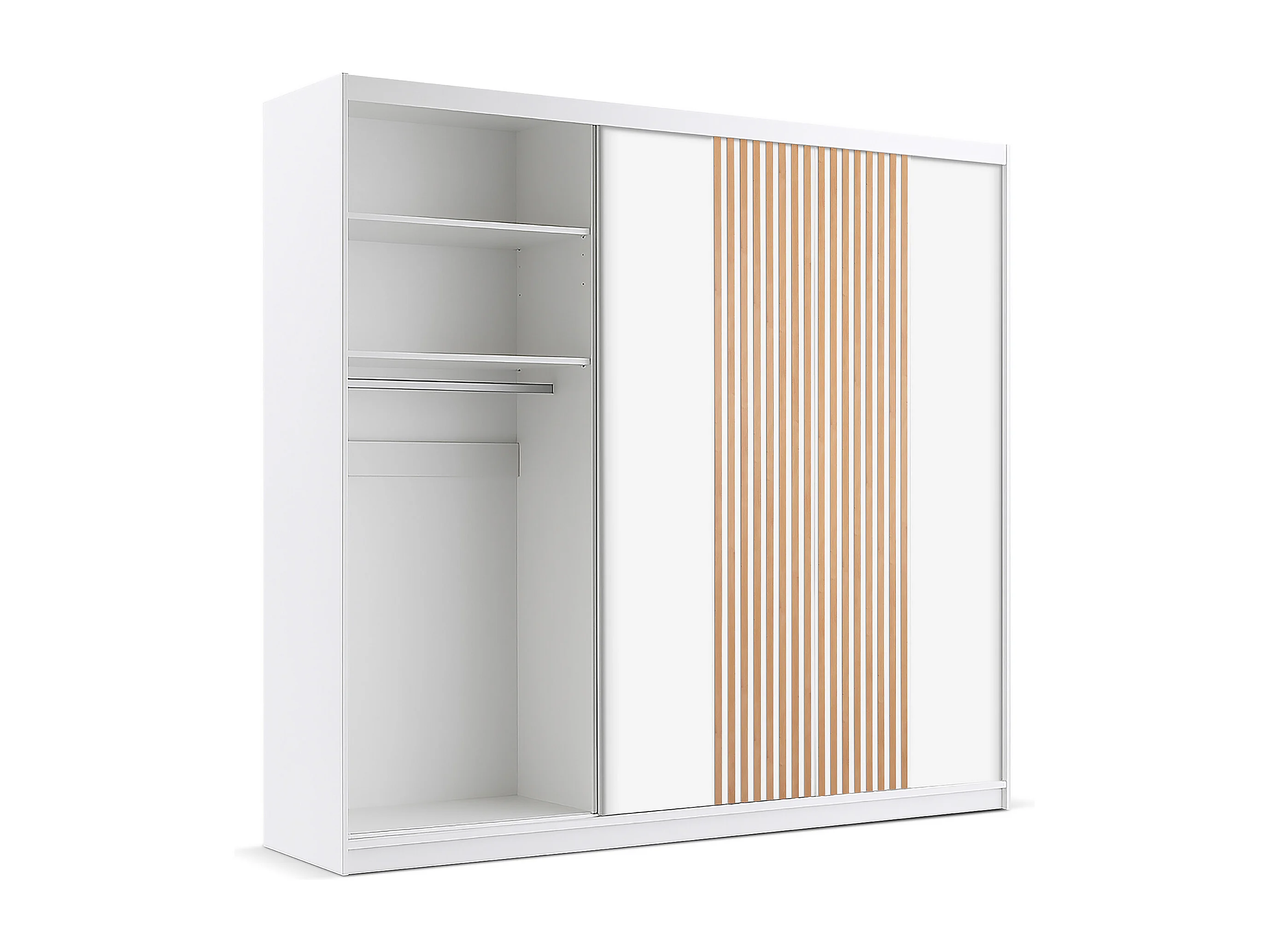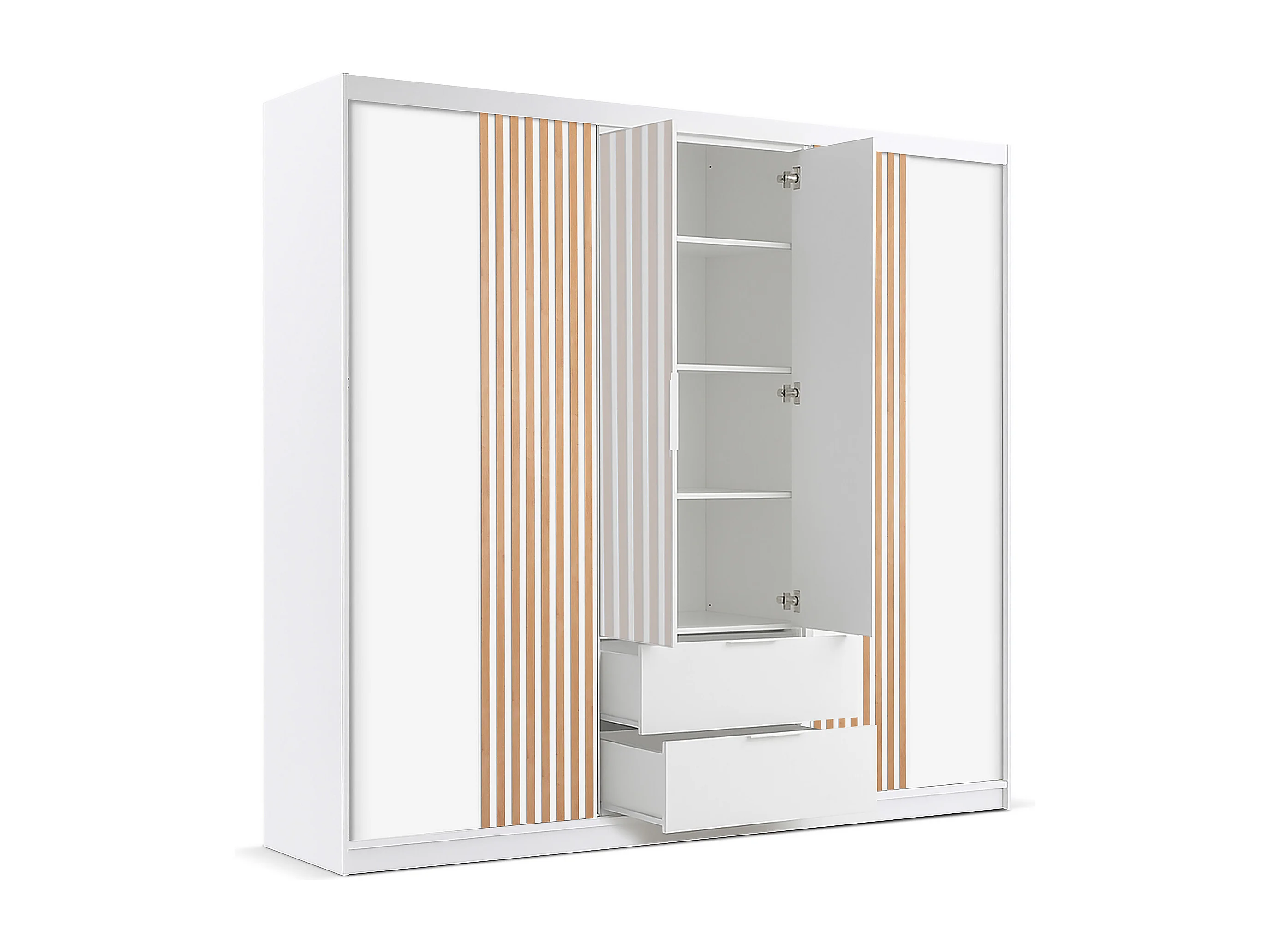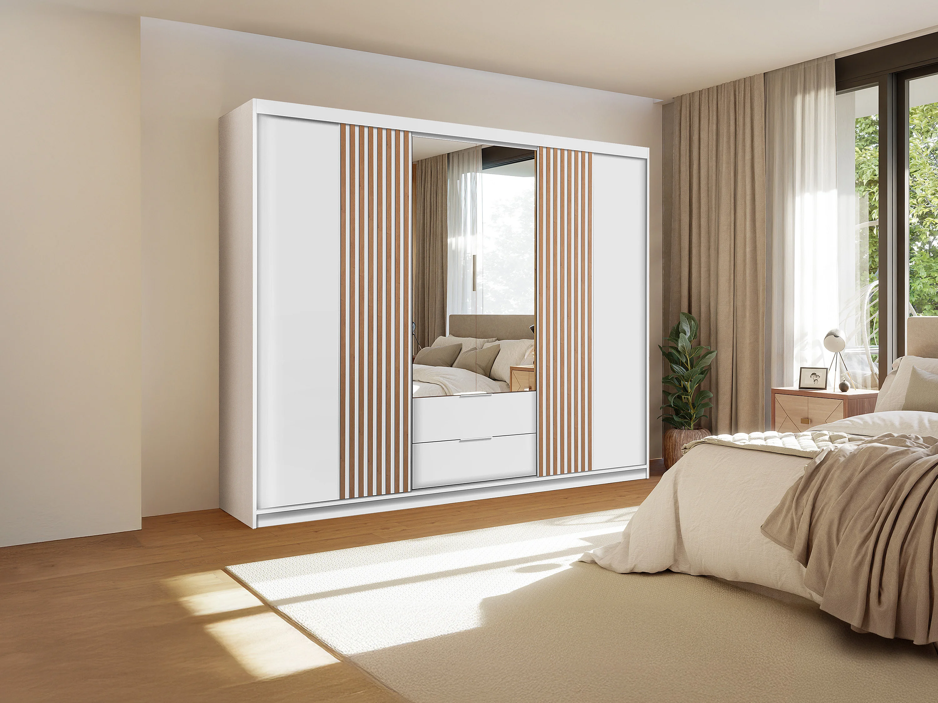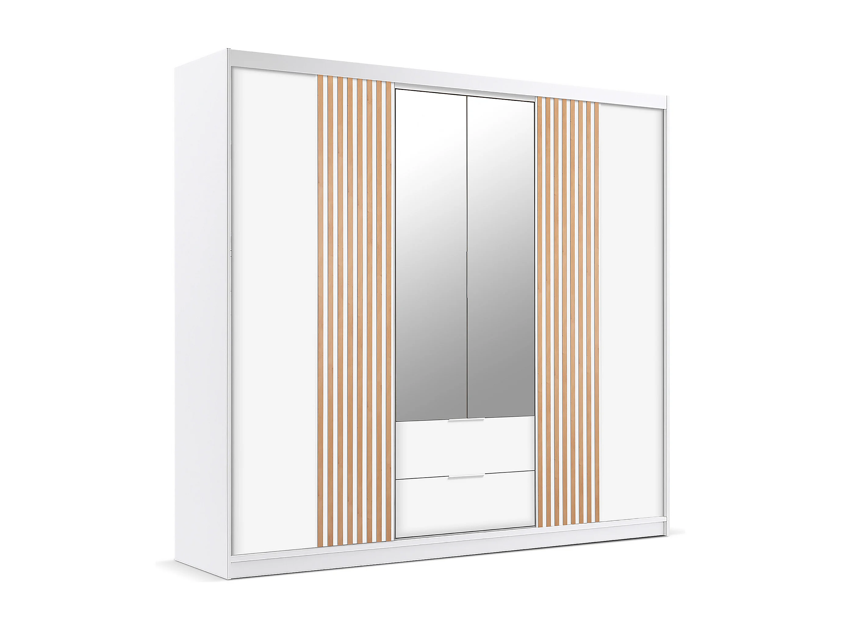 Armoire 4 portes et 2 tiroirs - Avec miroir - L250 cm - Blanc et naturel - SIDOVIA