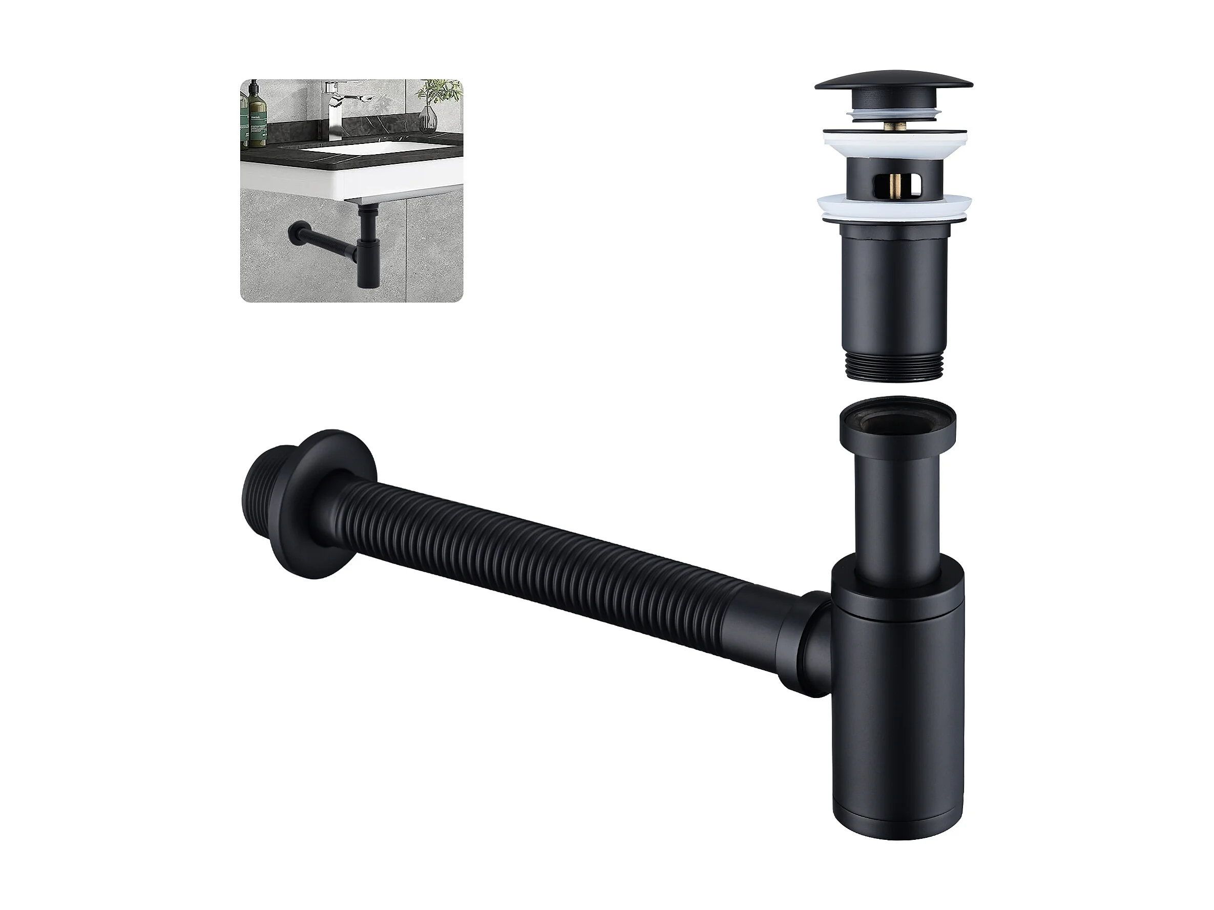 Siphon de Lavabo avec Bonde Siphon Universel et Bonde d'écoulement Salle de Bain pour Lavabo Noir Mat 1/4 x 30 mm Siphon Pop-up