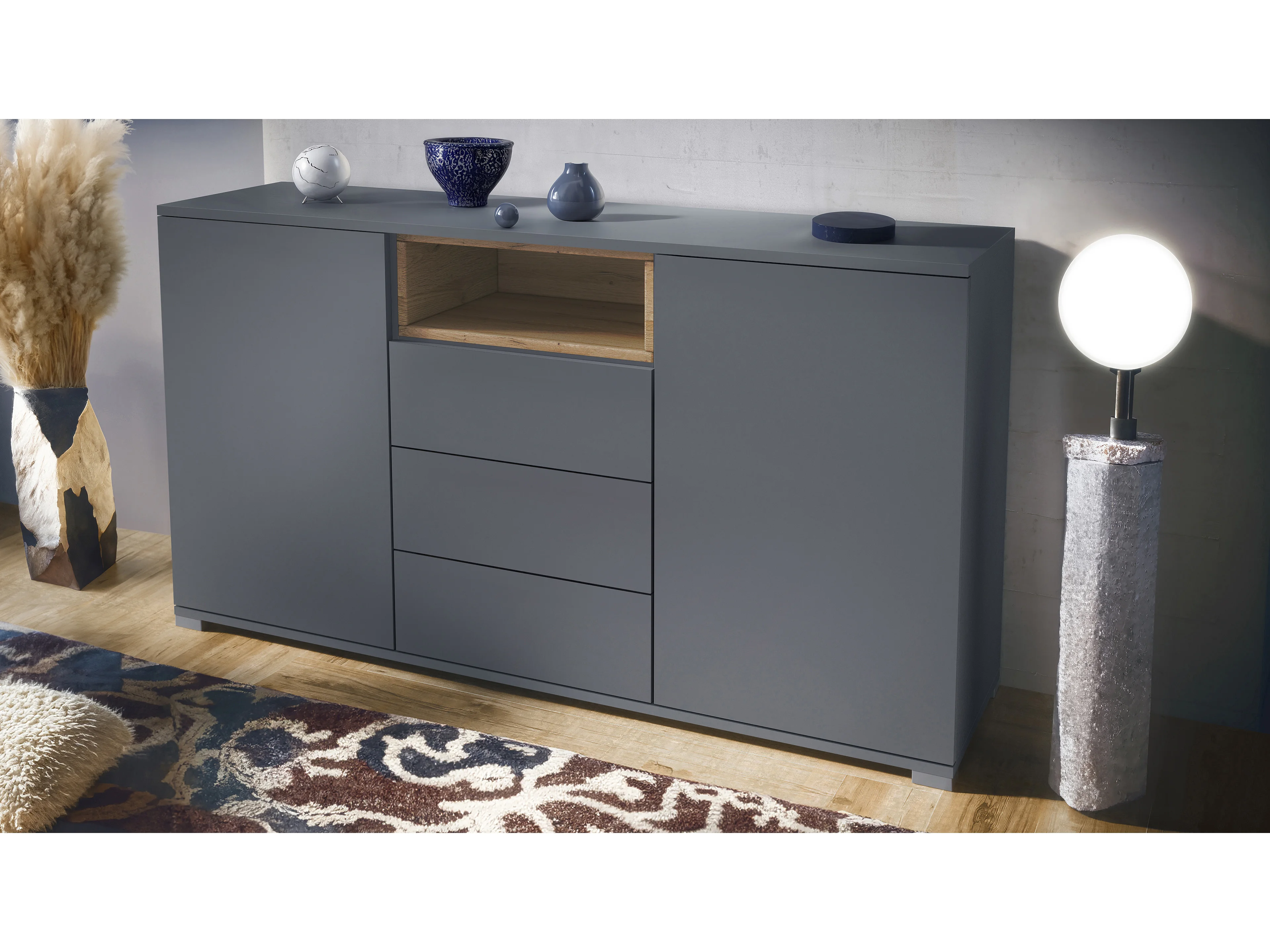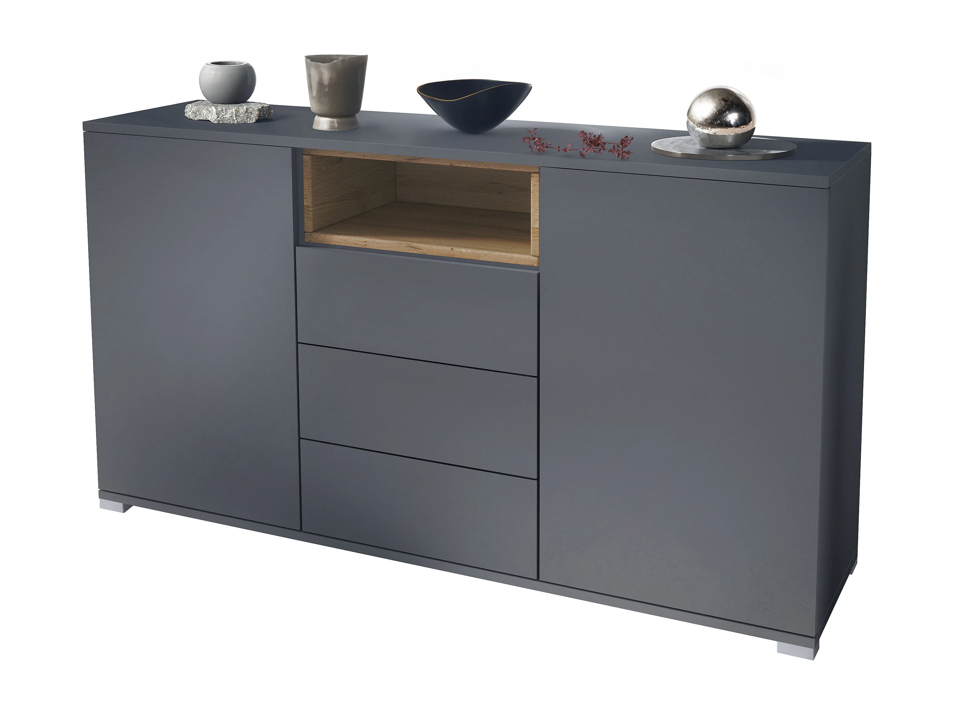 Skadu V2 Buffet, Commode avec 2 portes, 3 tiroirs et 1 compartiment ouvert, anthracite mat/chêne nature (138,5 x 75,5 x 35 cm)