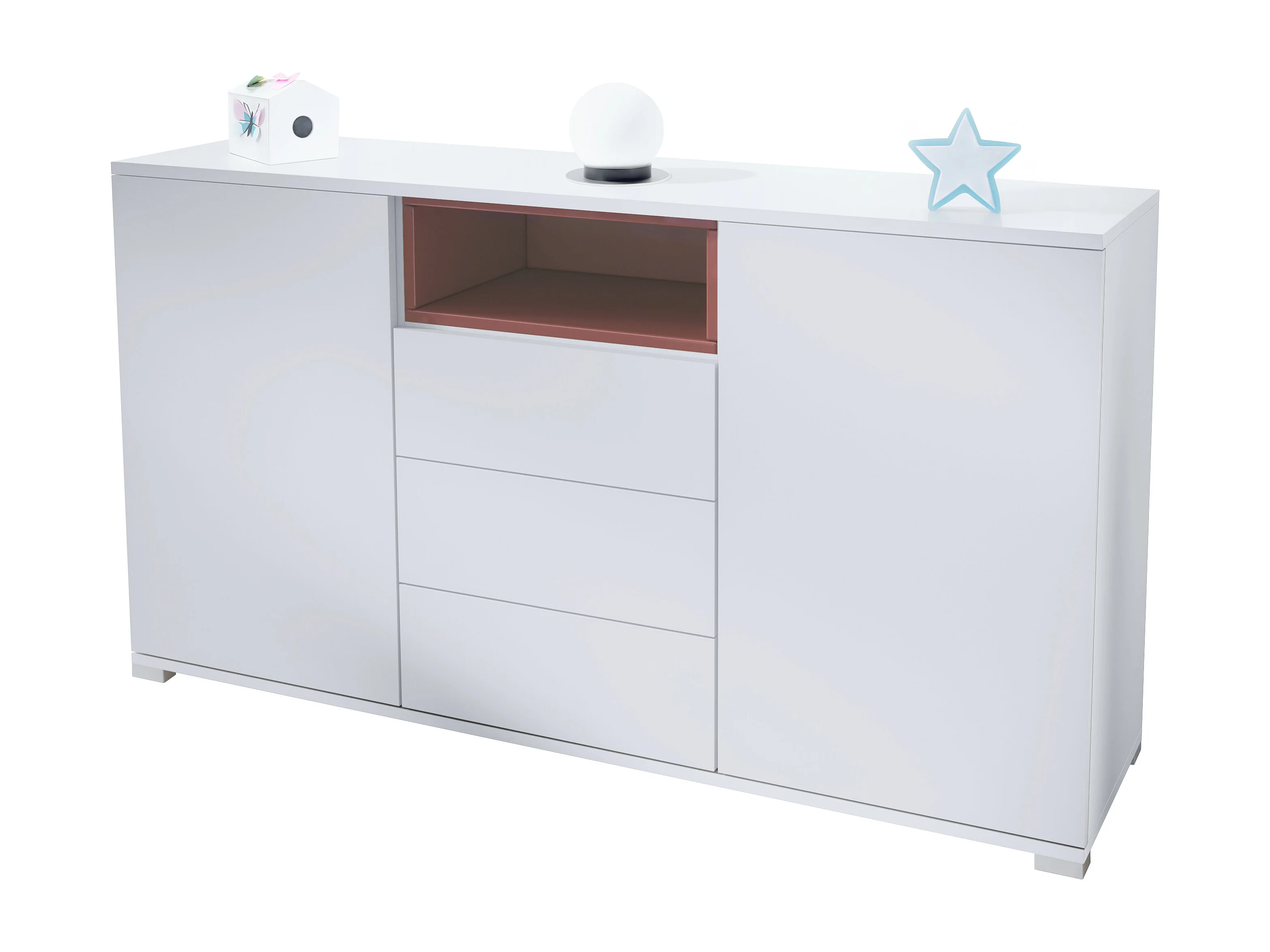 Skadu V2 Buffet, Commode avec 2 portes, 3 tiroirs et 1 compartiment ouvert, blanc mat/bordeaux haute brillance (138,5 x 75,5 x 35 cm)