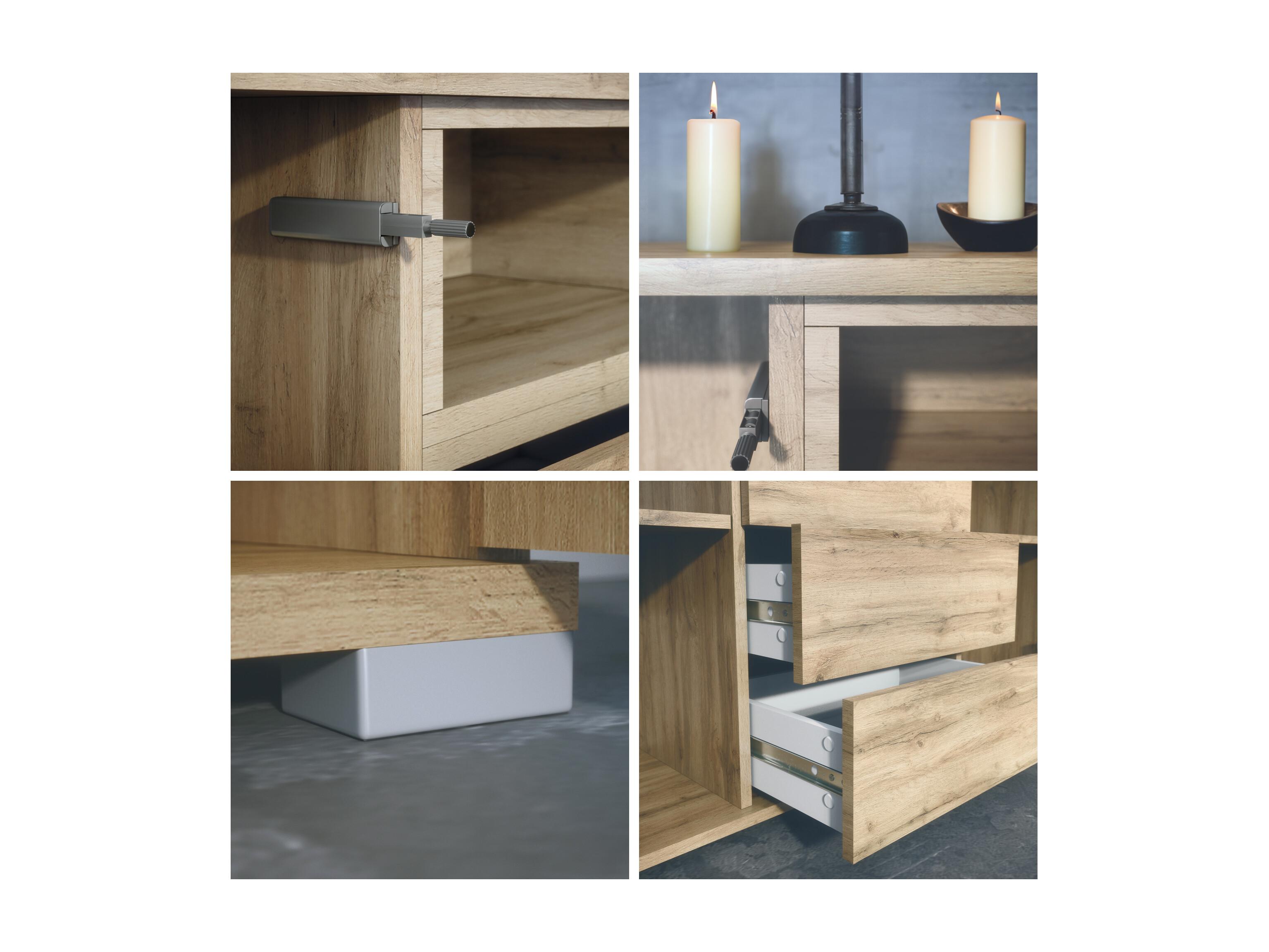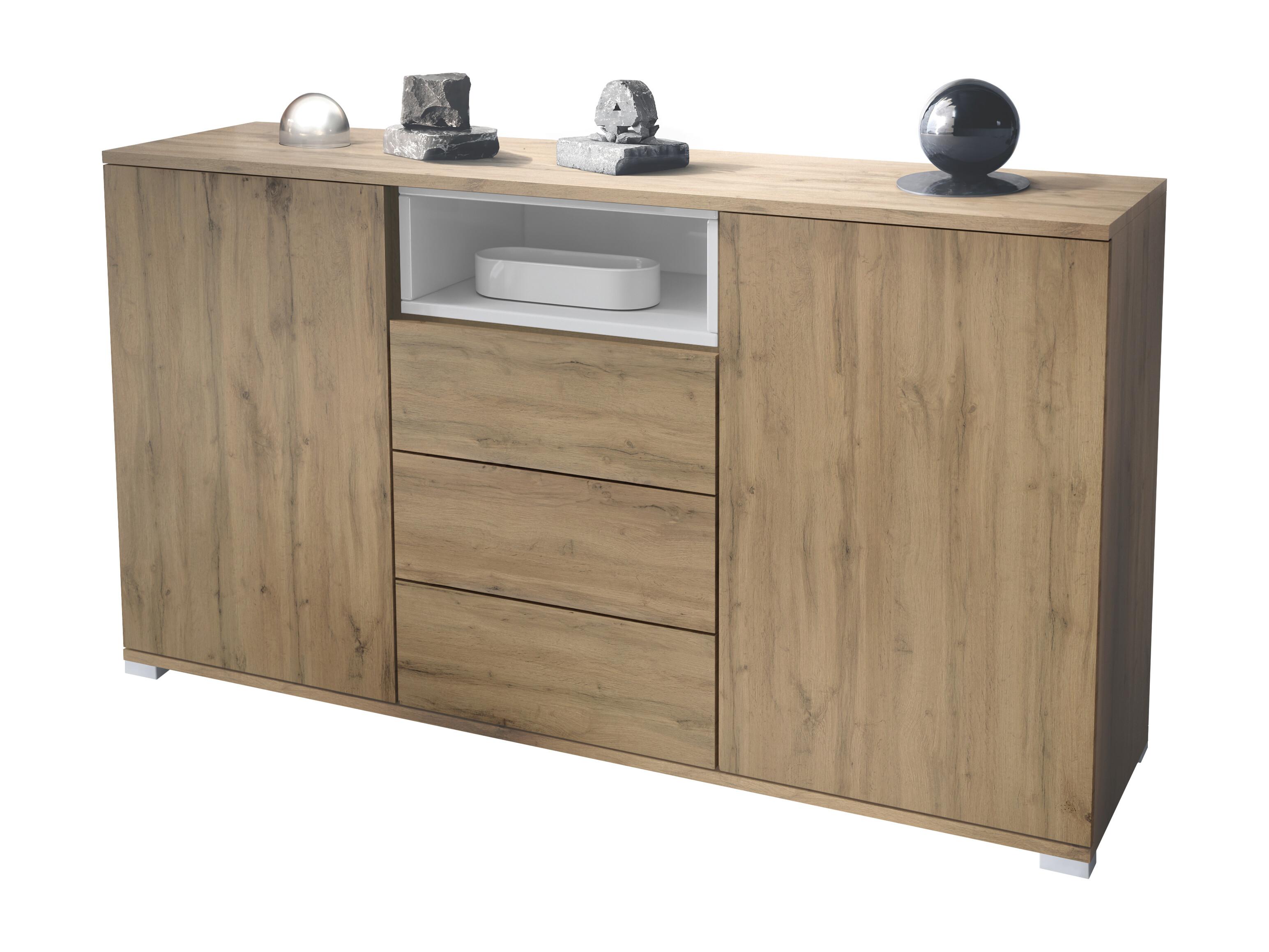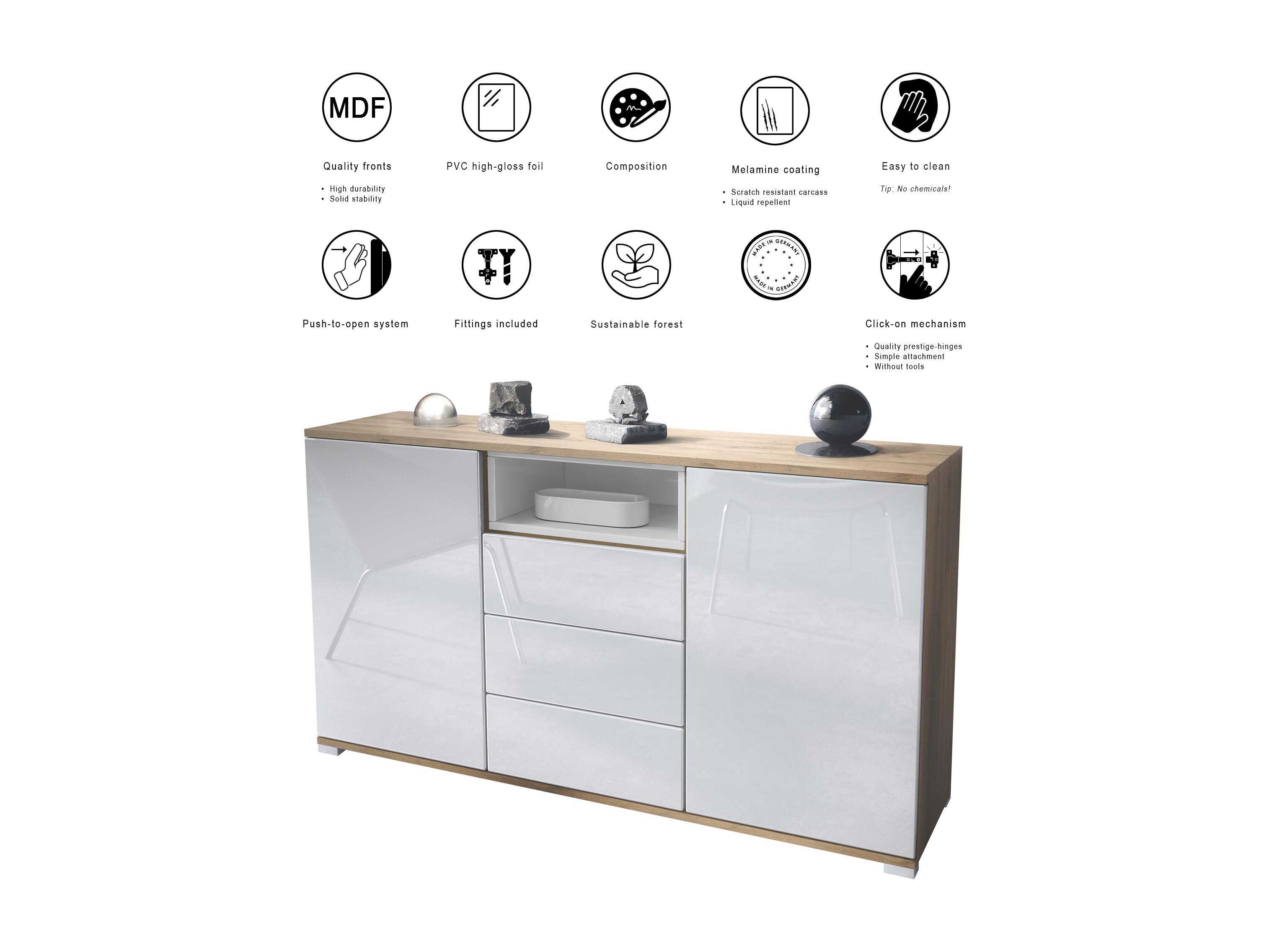 Skadu V2 Buffet, Commode avec 2 portes, 3 tiroirs et 1 compartiment ouvert, Chêne Evoke/blanc haute brillance (138,5 x 75,5 x 35 cm)