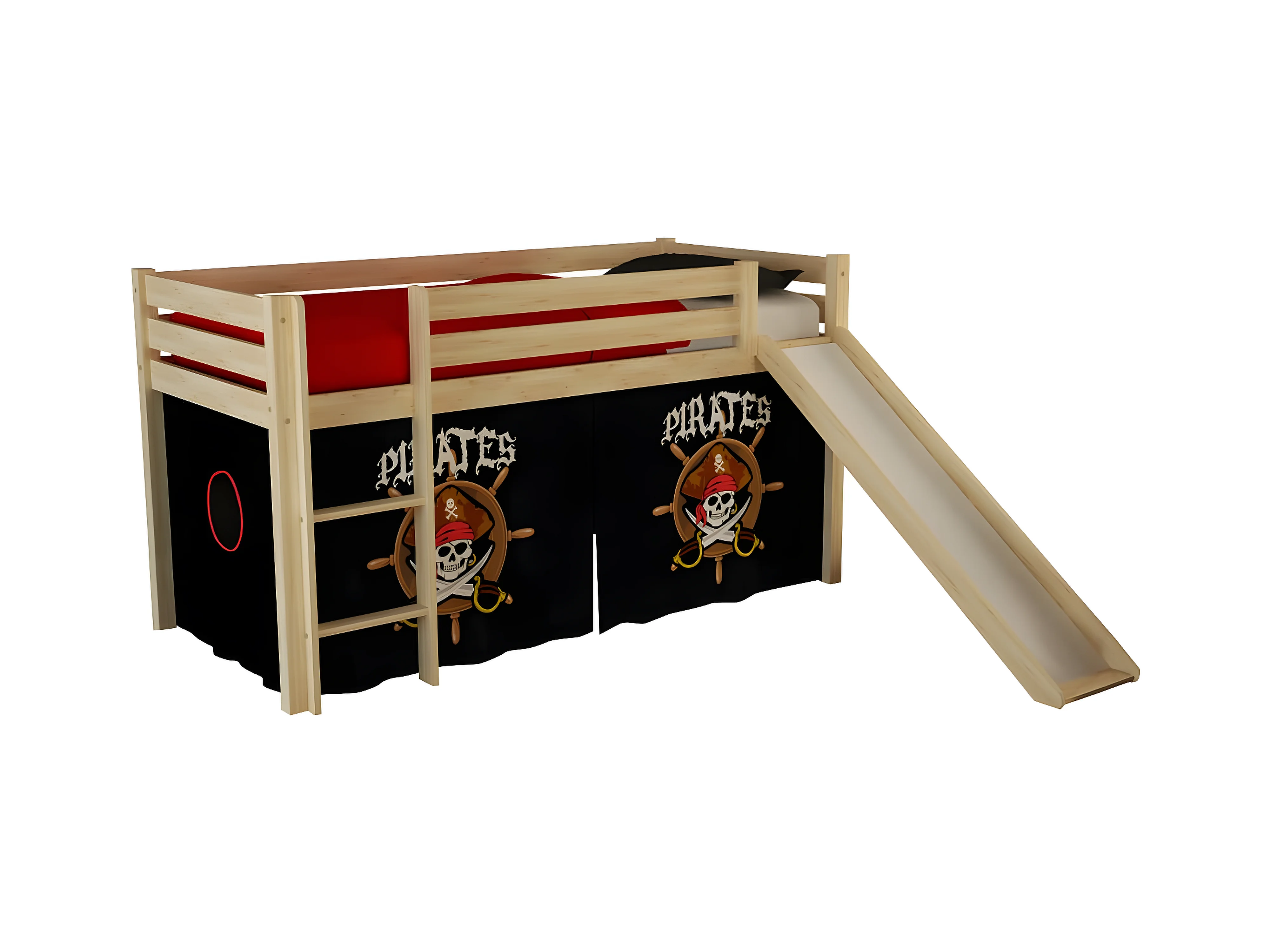 SLEEPY - Lit Mi-Haut Tobogan en Pin Naturel 90x200cm Housse Pirates
