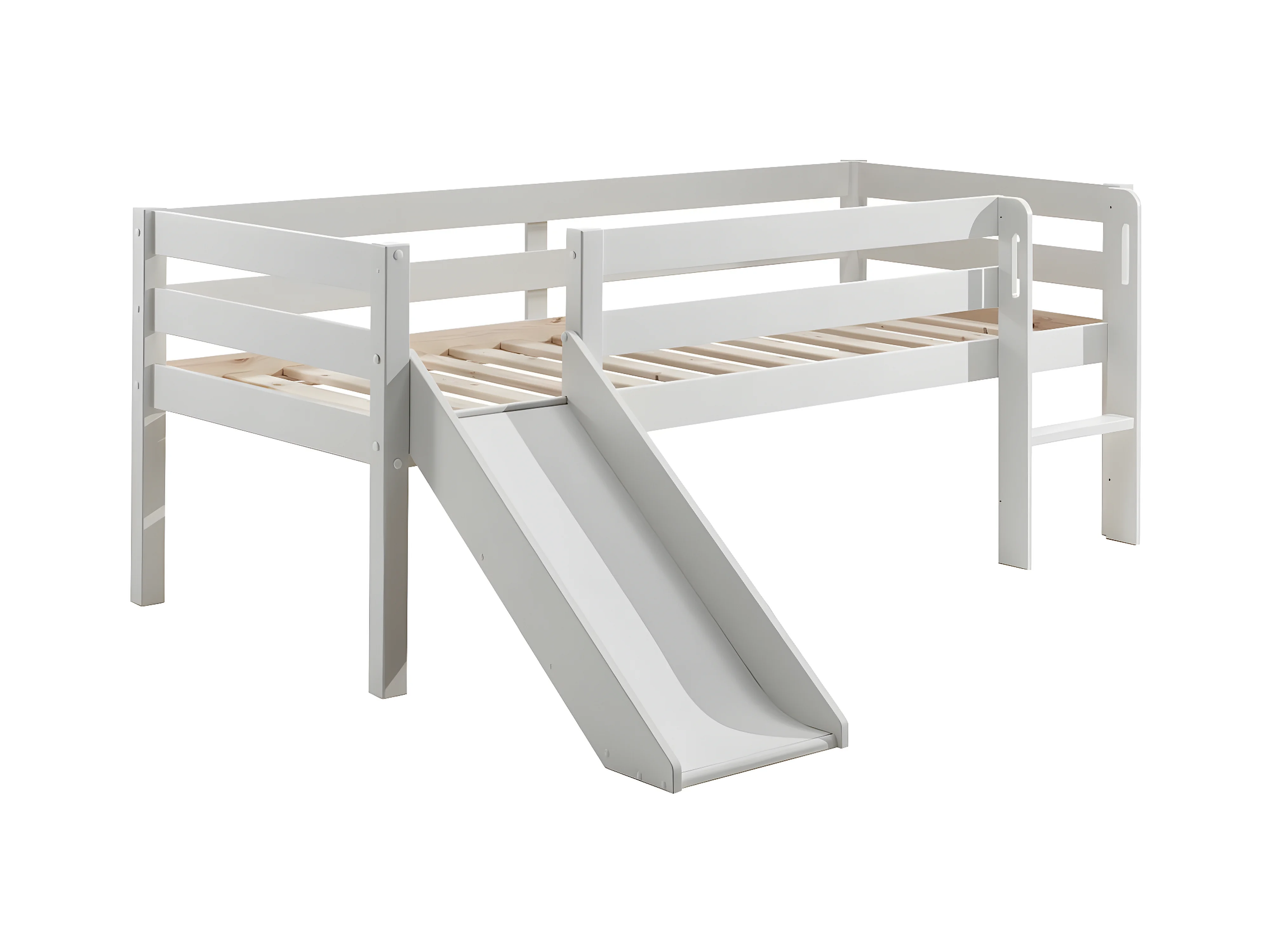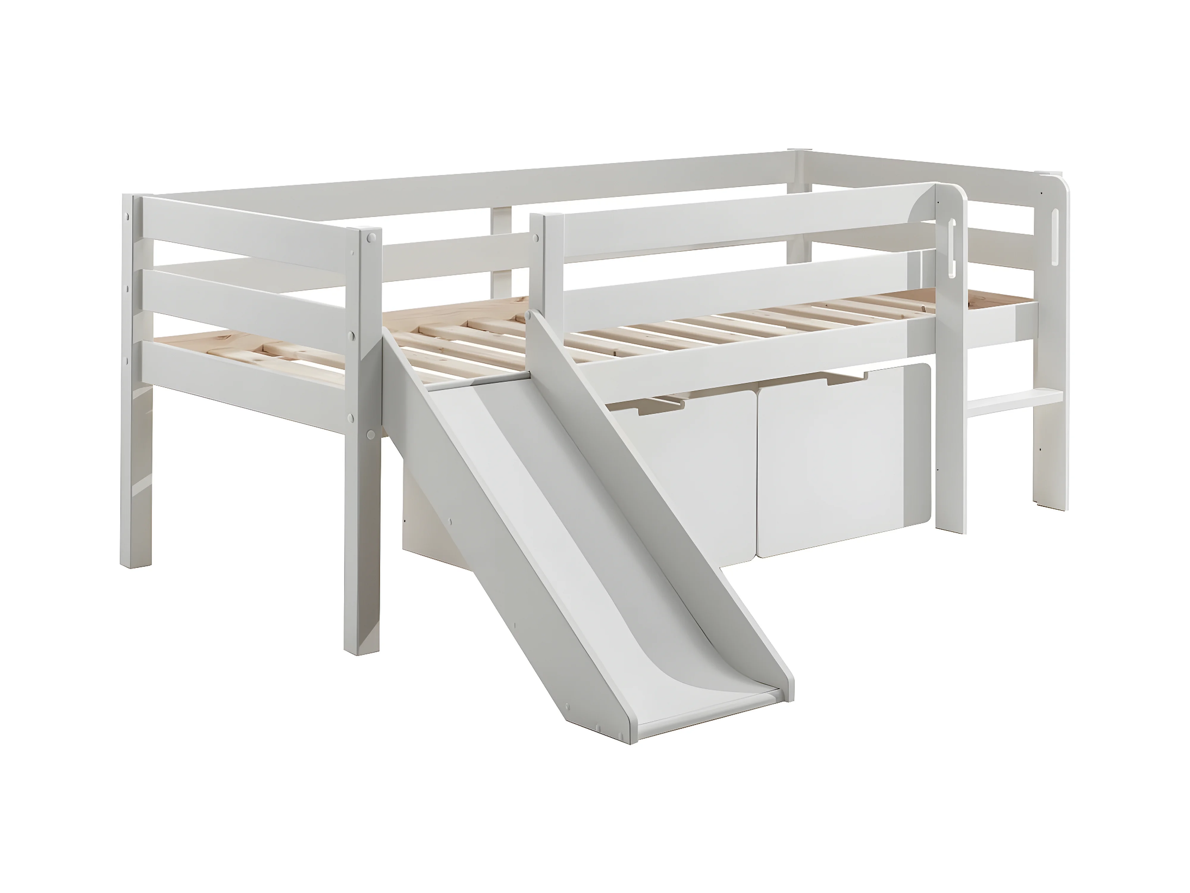 SLEEPY - Lit Surélevé en Pin Laqué Blanc 90x200cm avec Tobogan et 2 Tiroirs