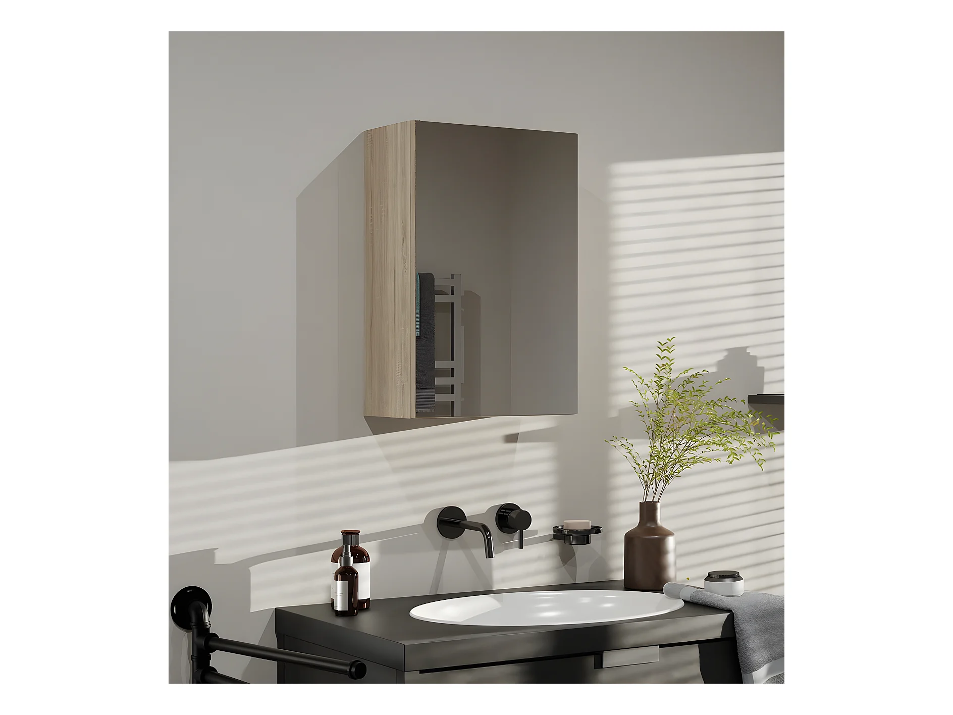 Armoire miroir murale de salle de bain - porte, 2 étagères, 3 niches, porte-serviette - aspect bois clair