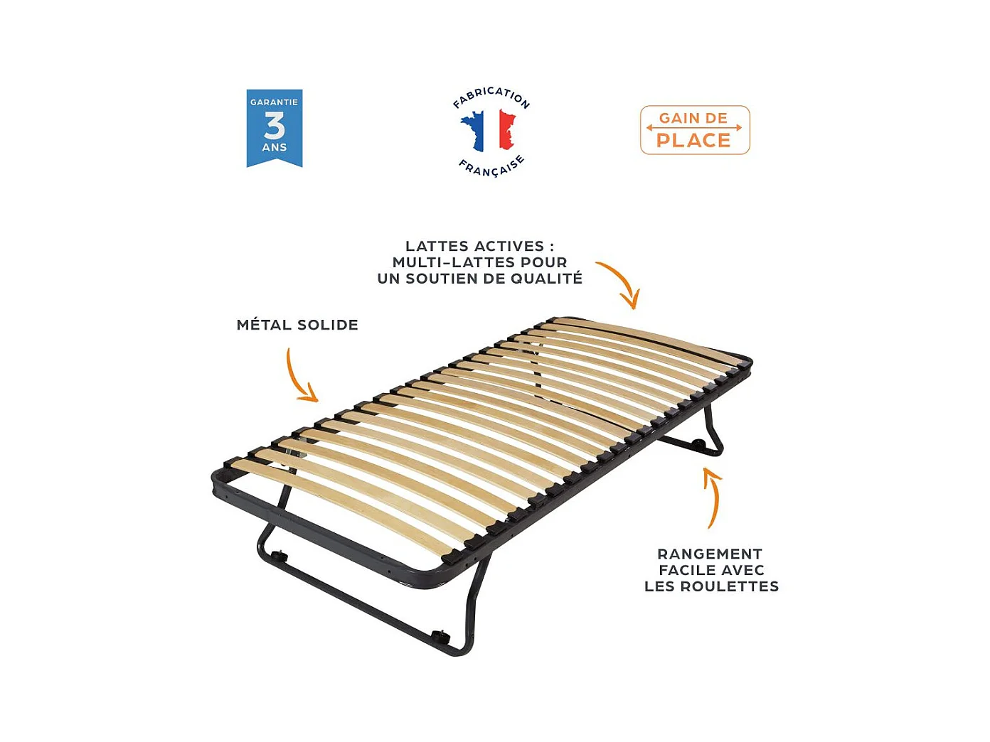 Sommier en métal gigogne 90x190 - 20 lattes bois - Gain de place - Made in France