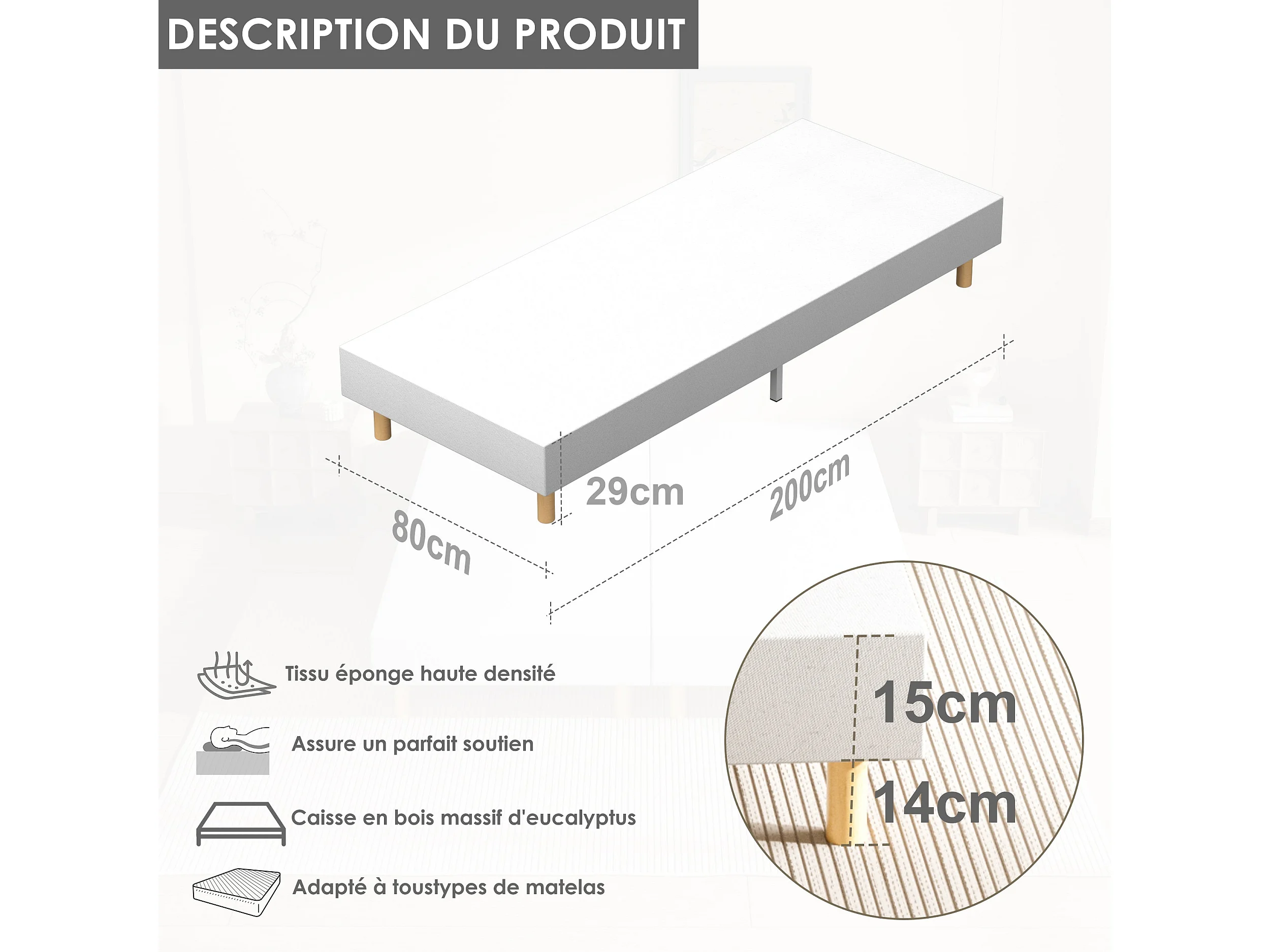Sommier Tapissier à Lattes 80x200cm Blanc, 6 pieds