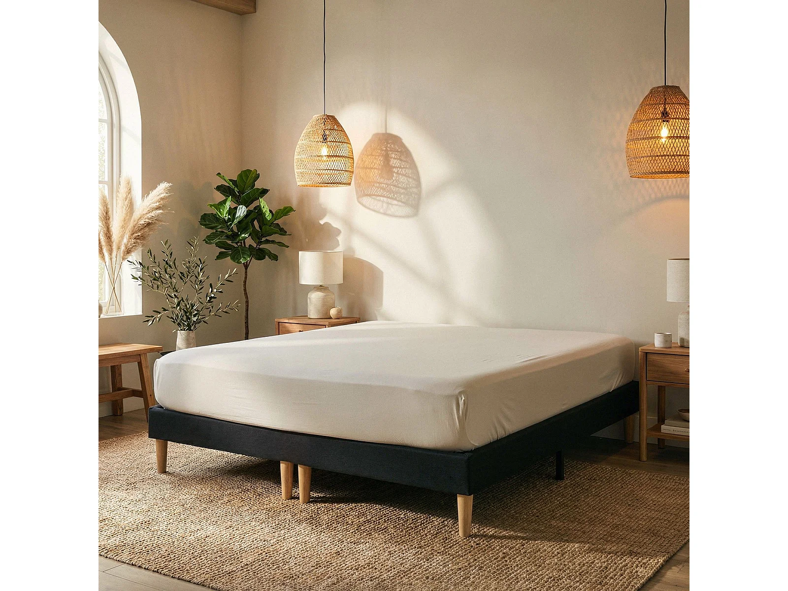 Sommier tapissier RENNES 180 x 200 cm structure en bois et revêtement en tissu noir, cadre de lit avec pieds