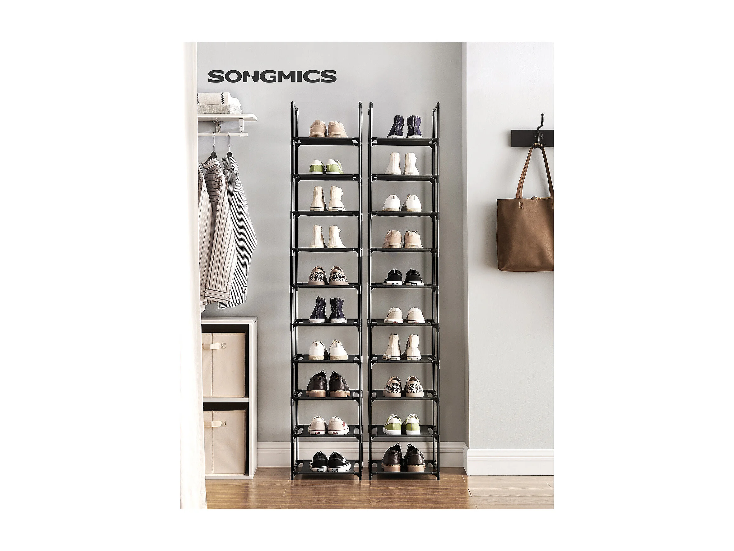 SONGMICS Meuble à chaussures 10 niveaux, porte-chaussures, rangement gain de place, 33 x 33 x 173 cm, cadre en métal, étagères en tissu intissé, pour entrée,