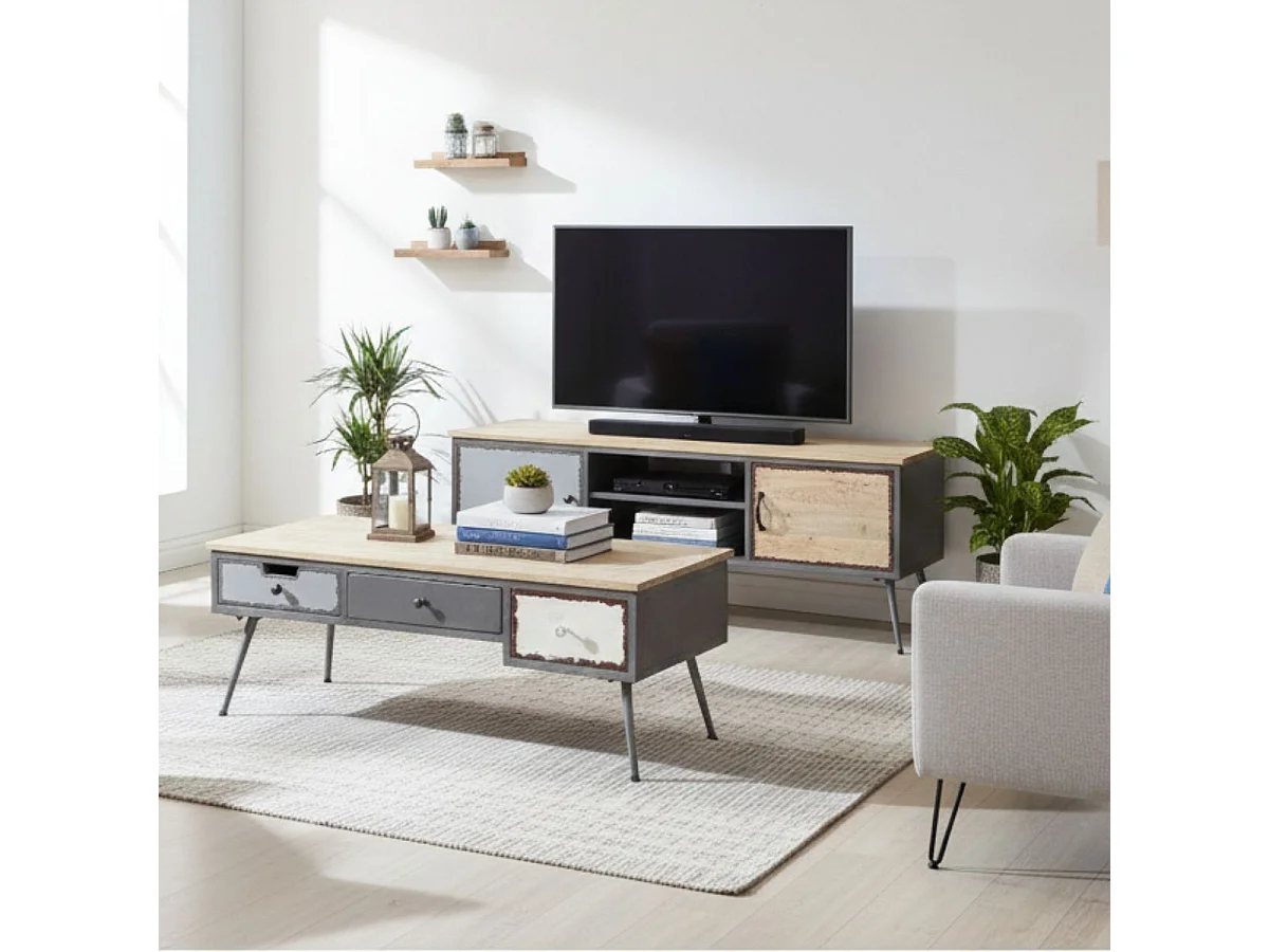 STAHL - Table Basse 3 Tiroirs Structure en Métal Plateau en Bois