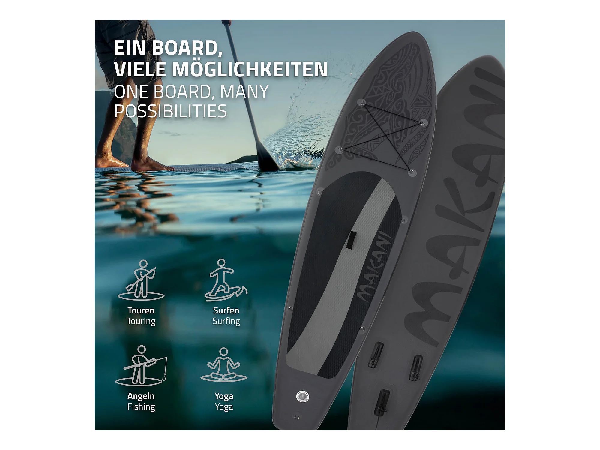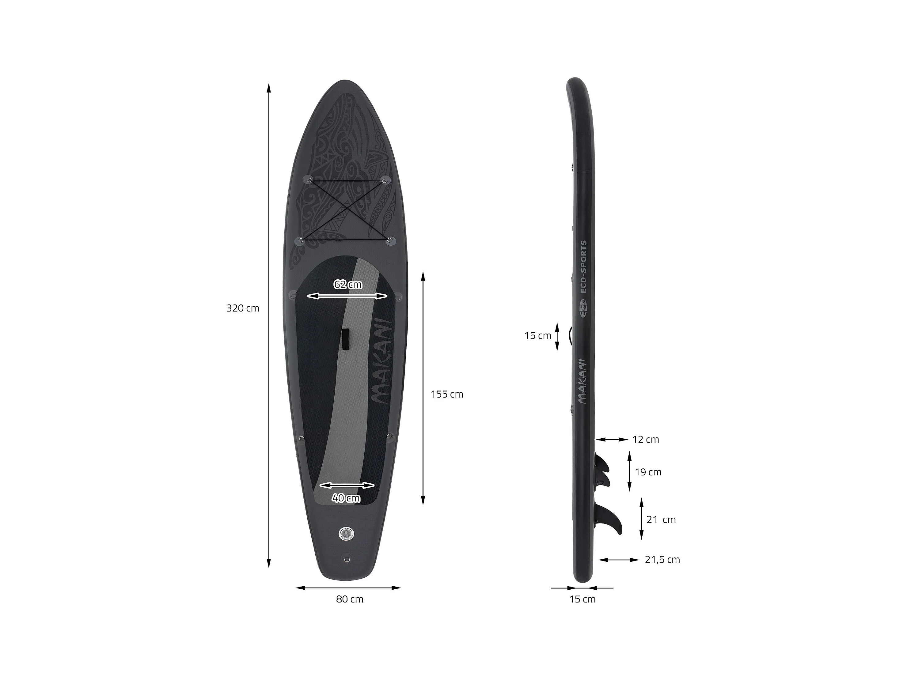 Planche stand up Makani 320x80x15 cm noir PVC gonflable jusqu'à 120 kg revêtement antidérapant avec pompe sac de transport kit de réparation pagaie