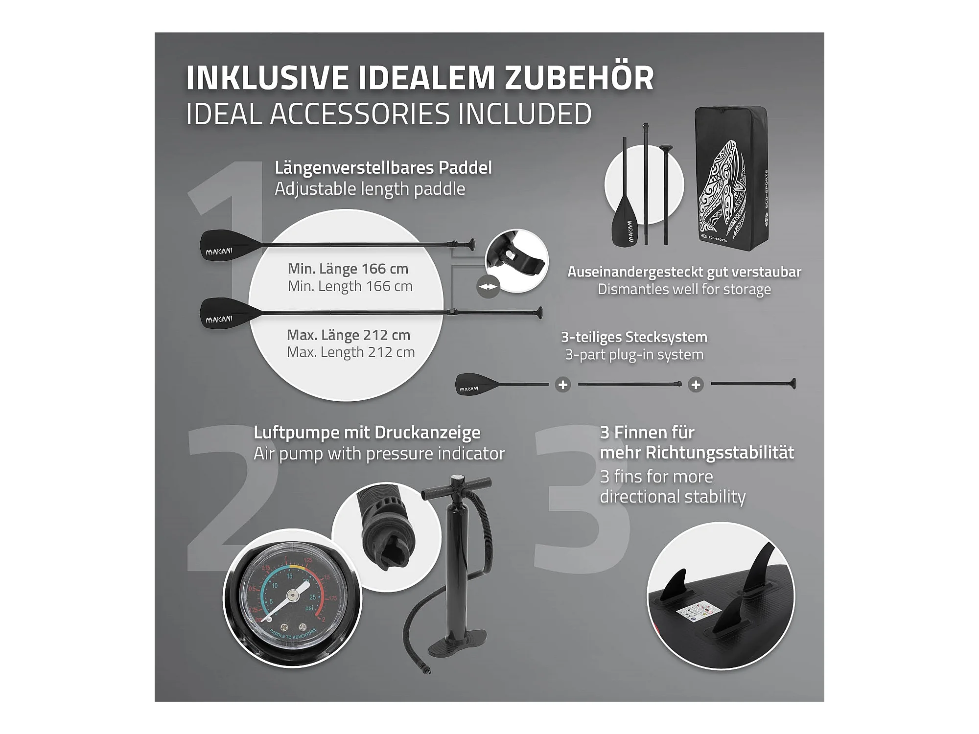 Planche stand up Makani 320x80x15 cm noir-rouge PVC gonflable jusqu'à 120 kg revêtement antidérapant avec pompe sac de transport kit réparation pagaie