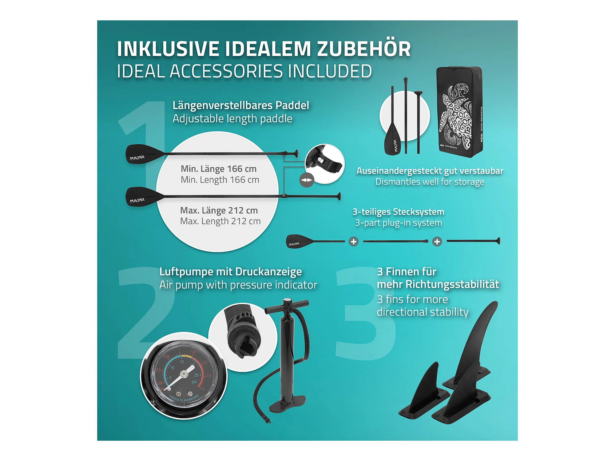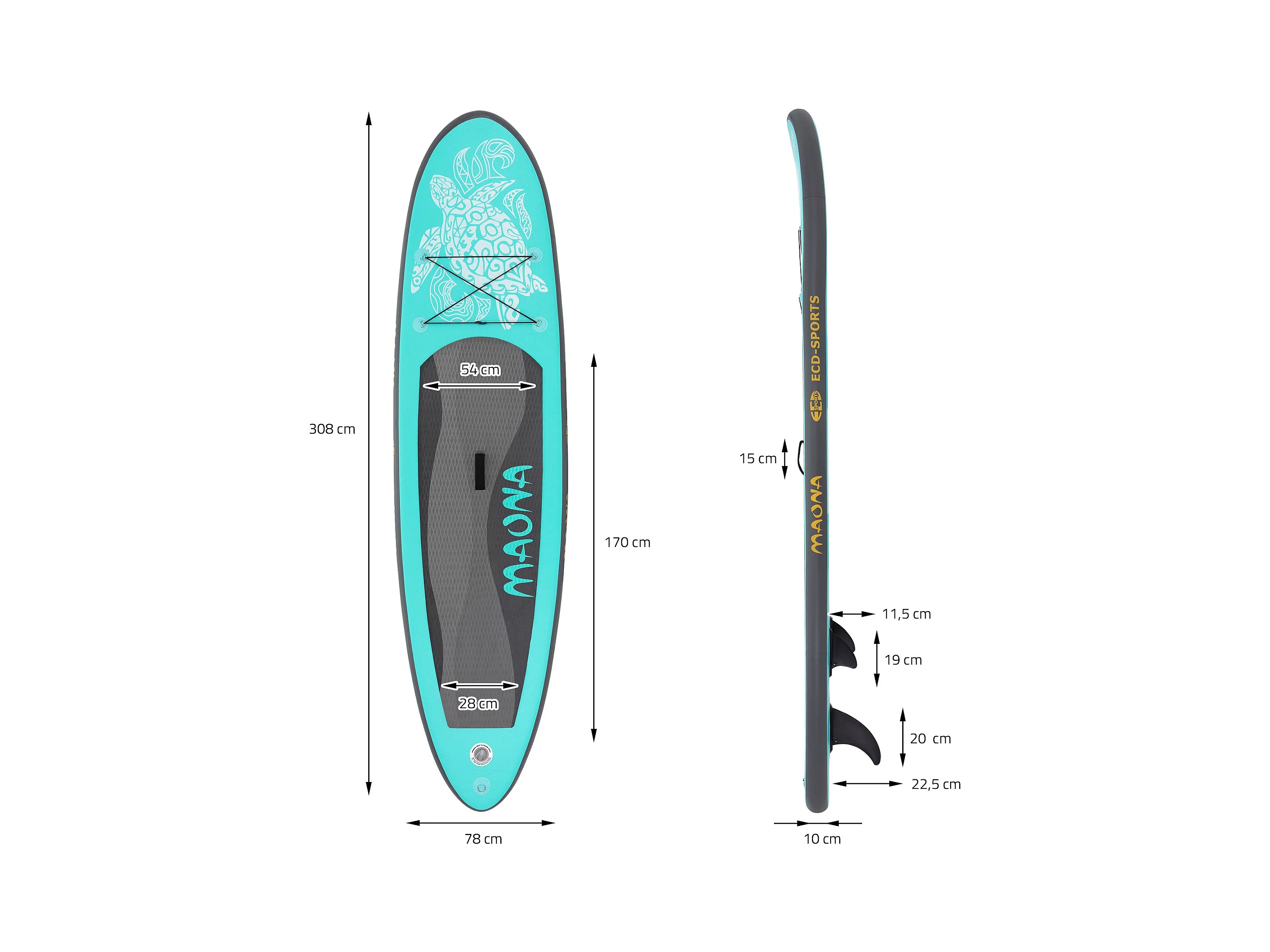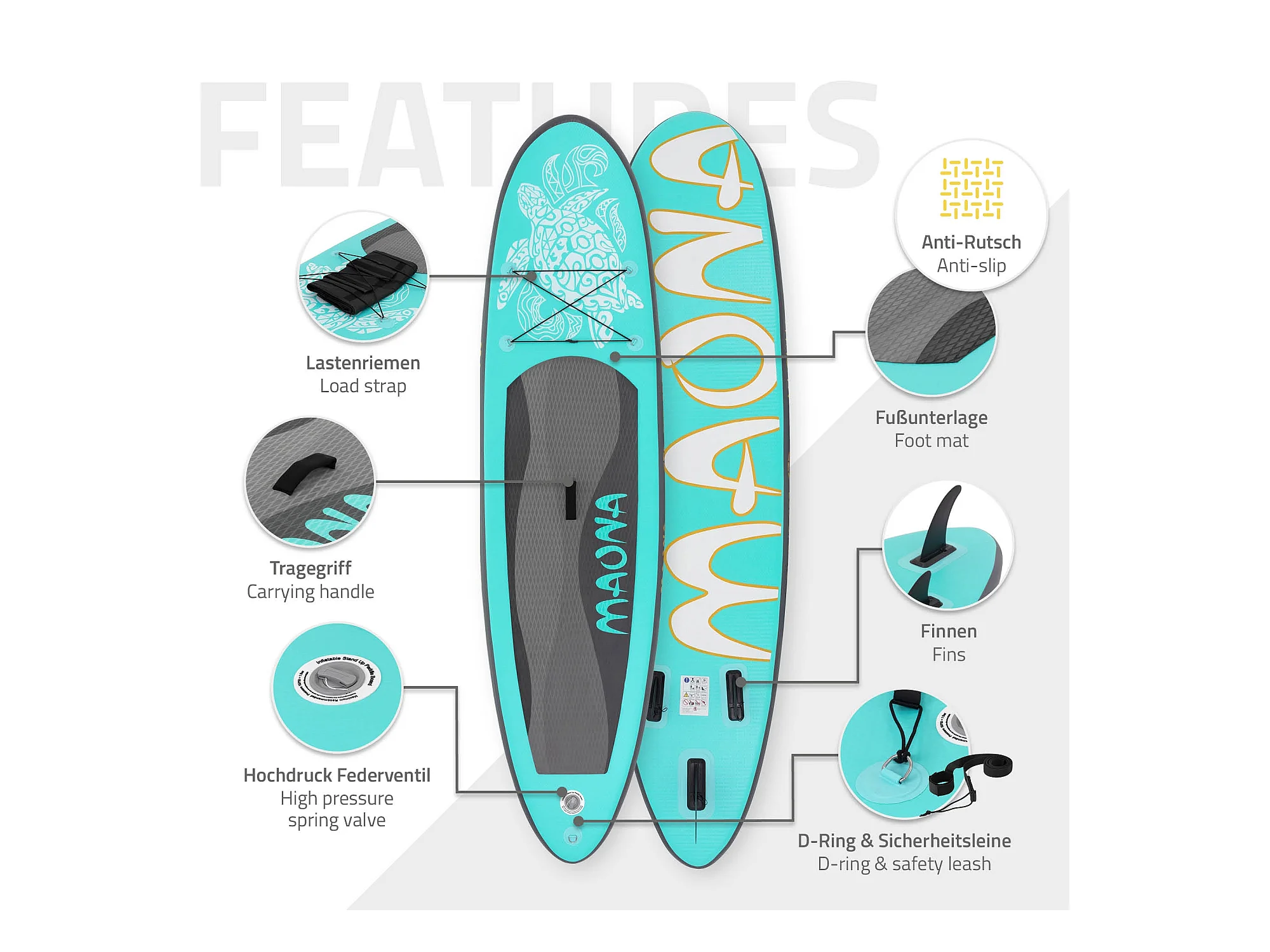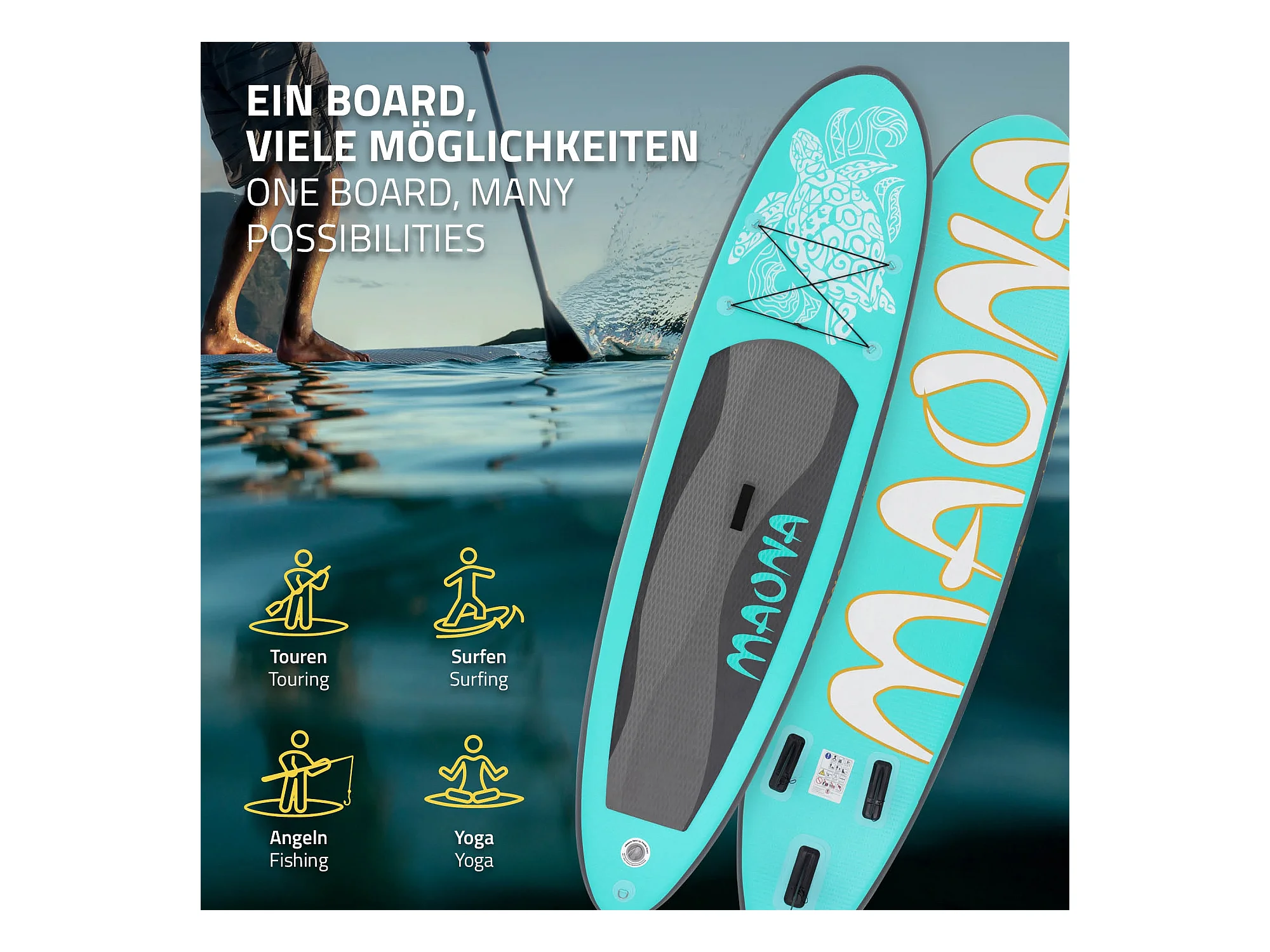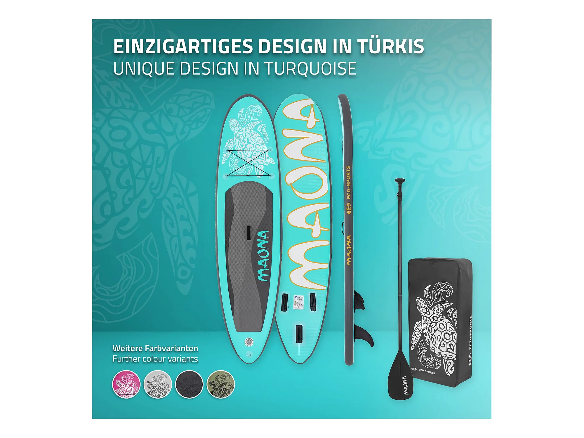 Planche stand up Maona 308x78x10 cm turquoise PVC gonflable jusqu'à 120kg revêtement antidérapant avec pompe sac de transport kit de réparation pagaie