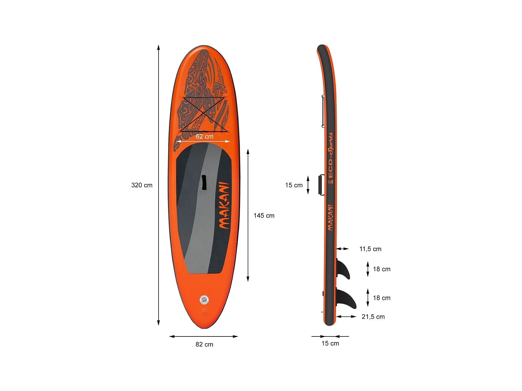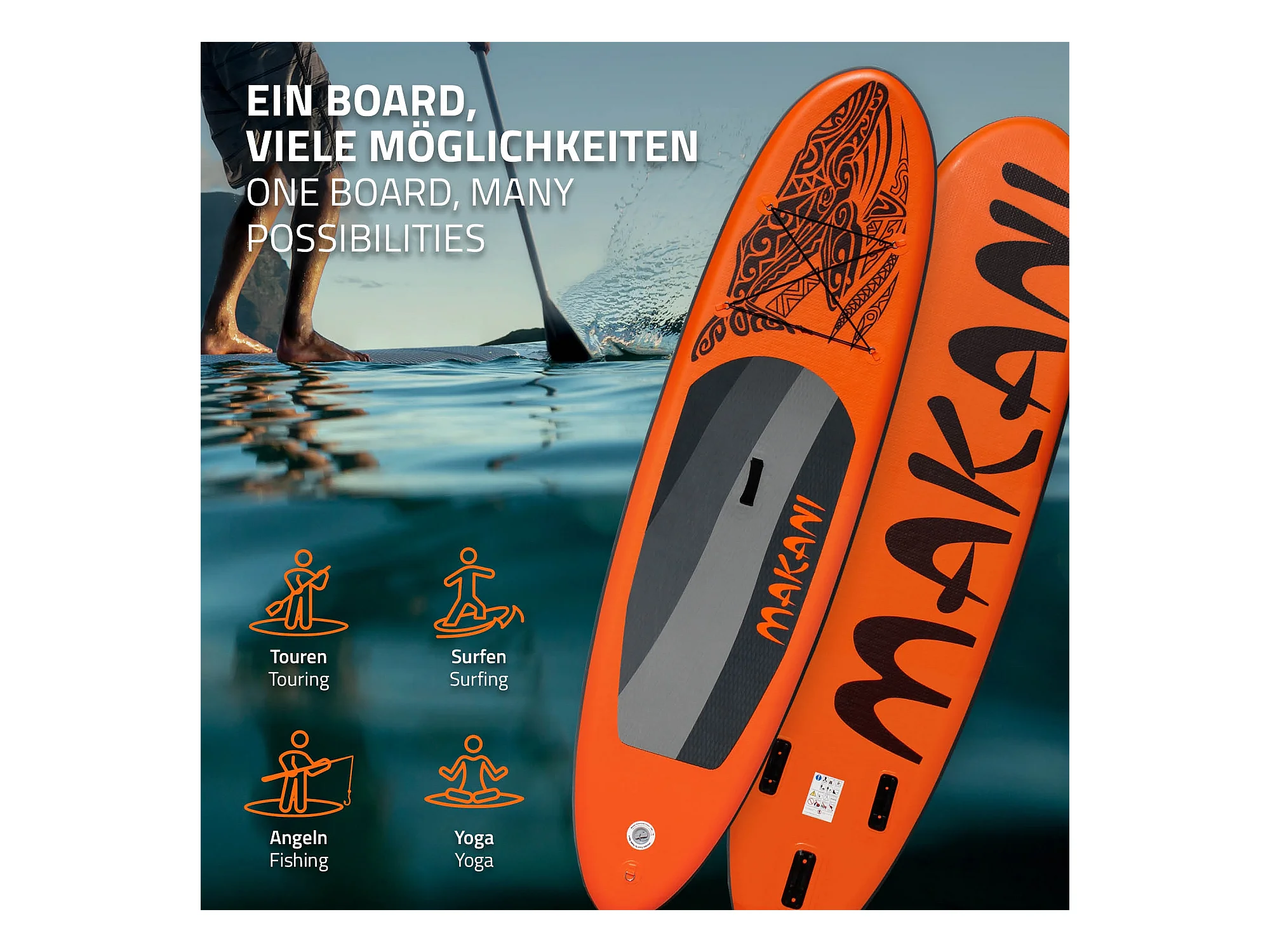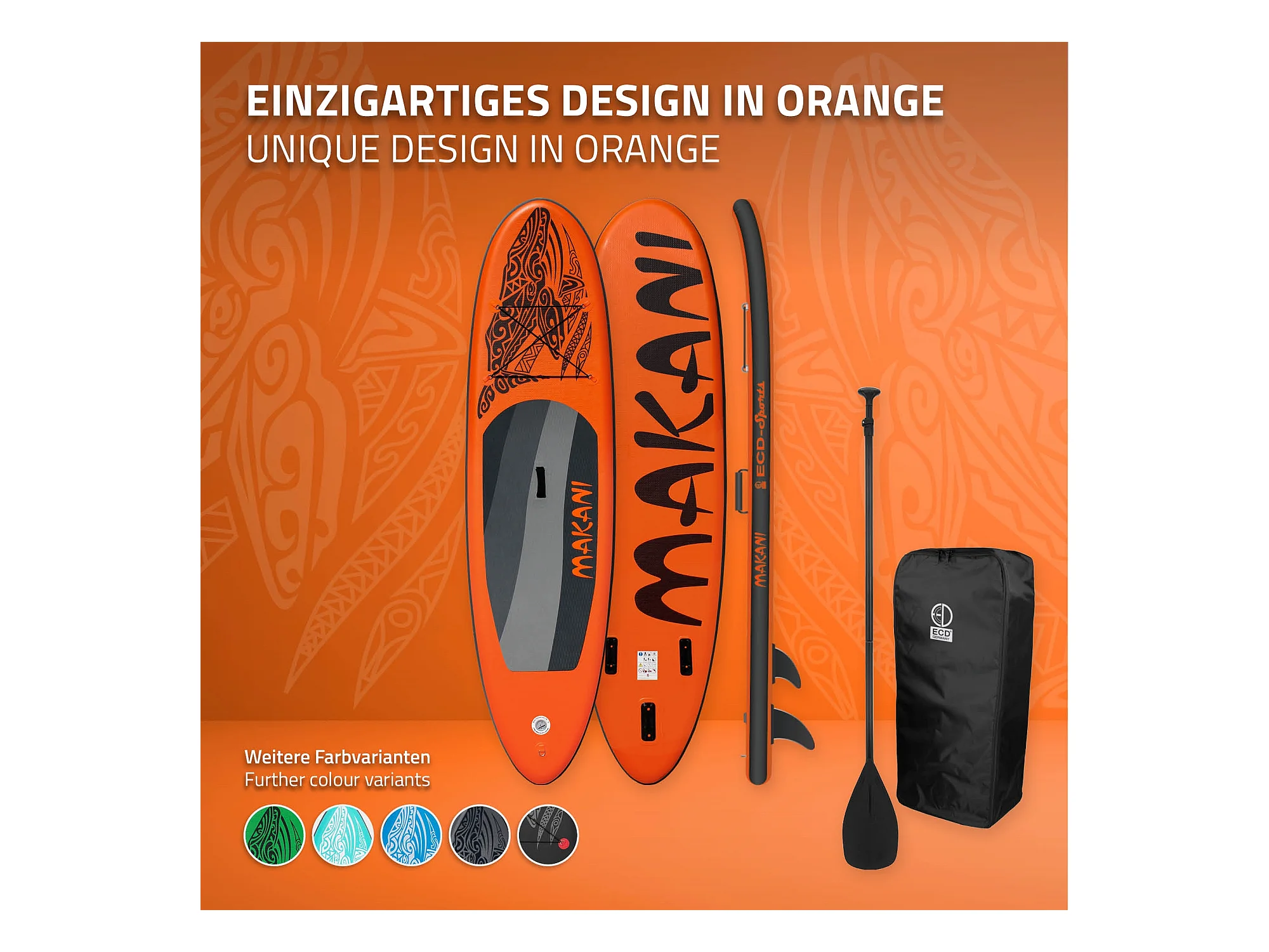 Planche stand up Makani 320x82x15 cm orange PVC gonflable jusqu'à 150 kg revêtement antidérapant avec pompe sac de transport kit de réparation pagaie