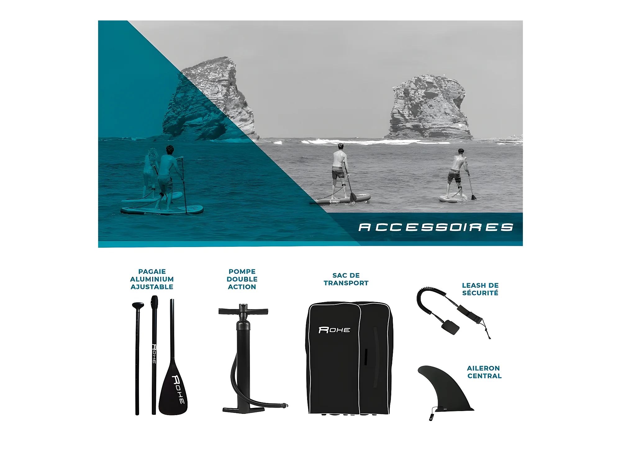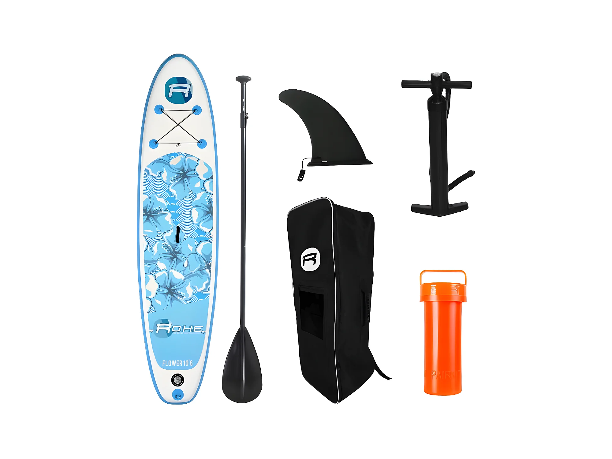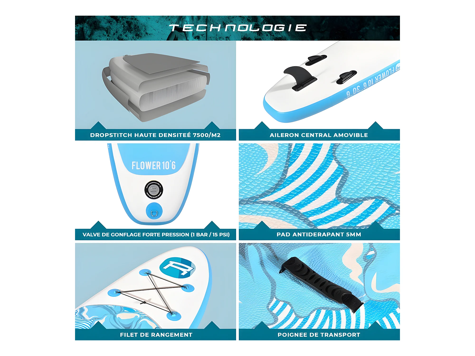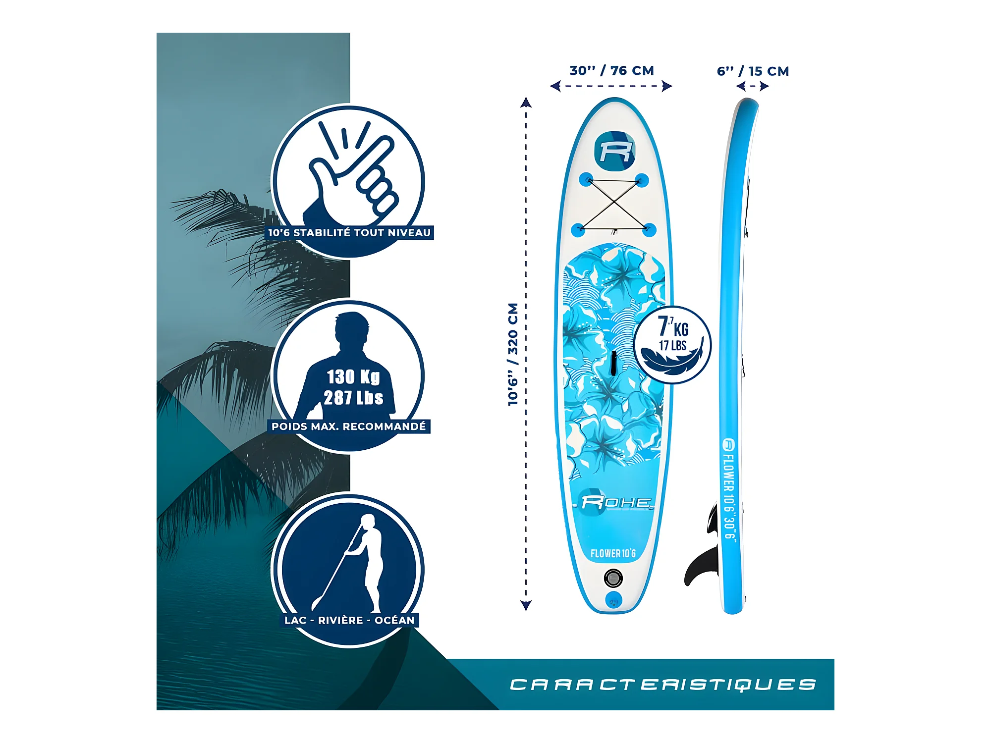 Stand Up Paddle Gonflable FLOWER ROHE - 10'6'' (320cm) 30'' (76cm) 6'' (15cm) avec Pompe, Pagaie, Leash et Sac de transport