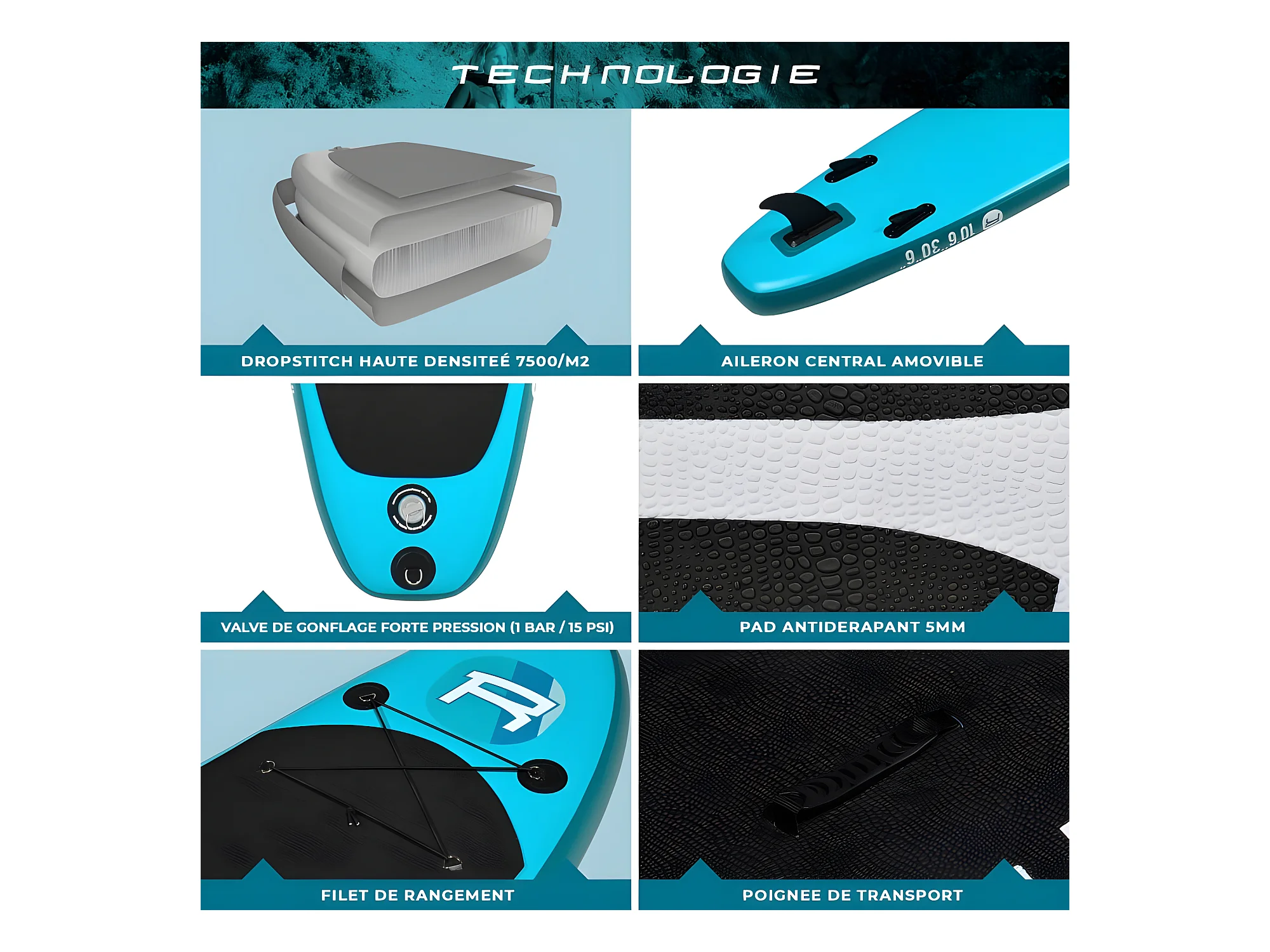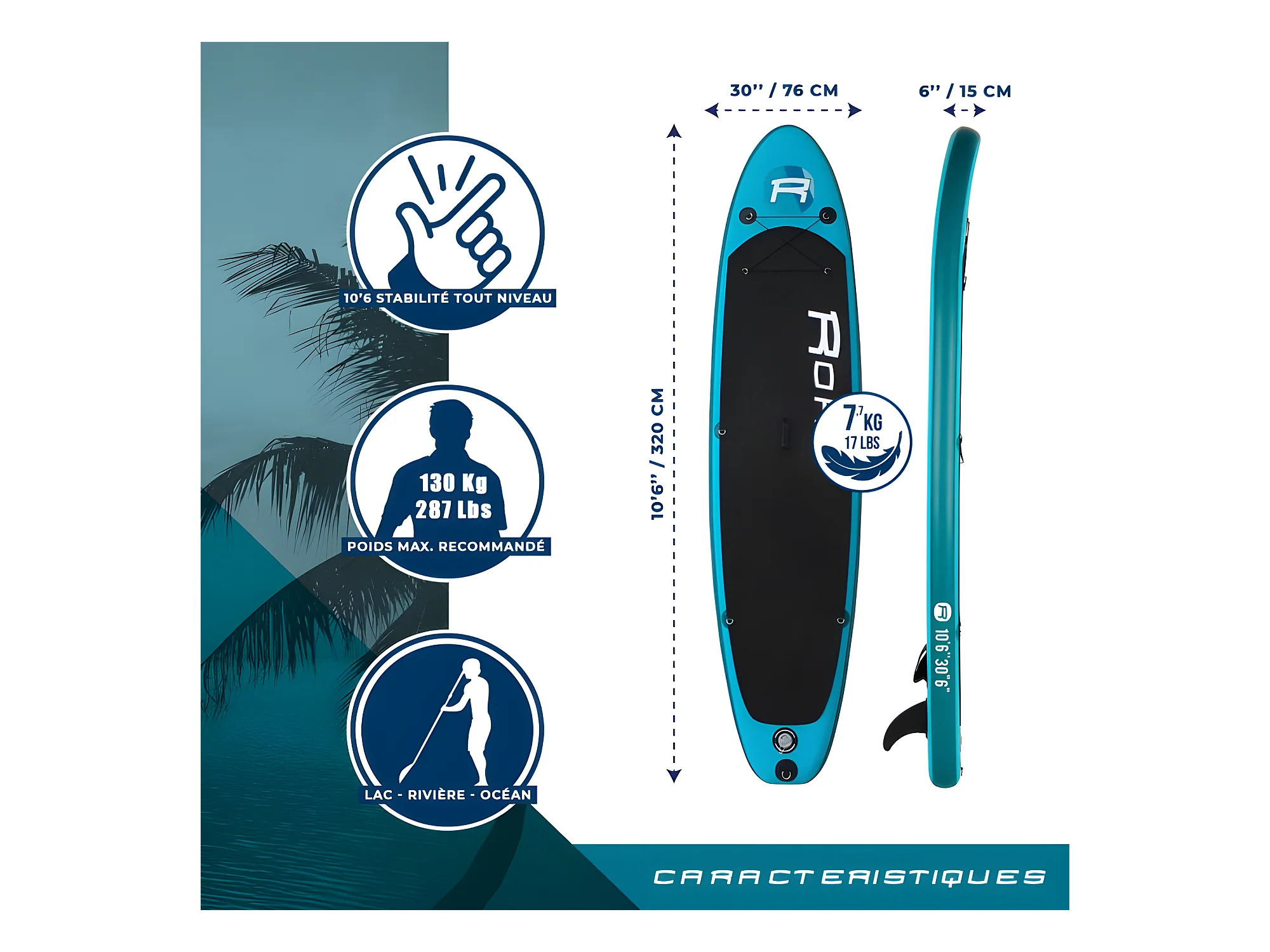 Stand Up Paddle Gonflable PACIFIC ROHE - 10'6'' (320cm) 30'' (76cm) 6'' (15cm) avec Pompe, Pagaie, Leash et Sac de transport