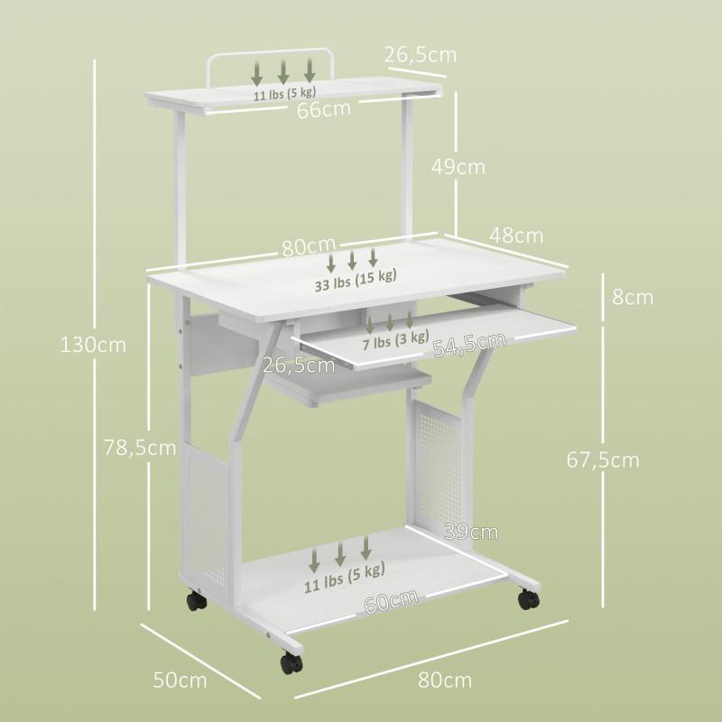 - Charge max. recommandée : 33 kg (total), 15 kg (plateau), 5 kg (chaque étagère), 3 kg (plateau clavier)
