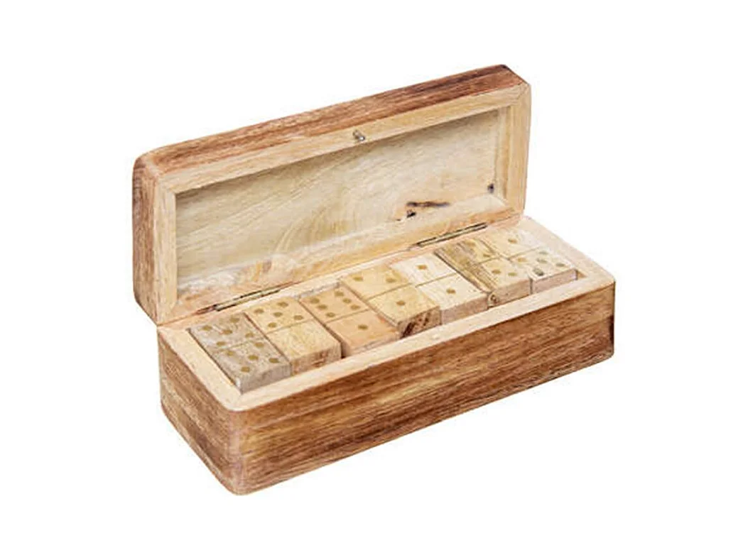 Jeu 3/1 (dés+dominos+cartes) dans une boîte en bois marron 15,5x13x5