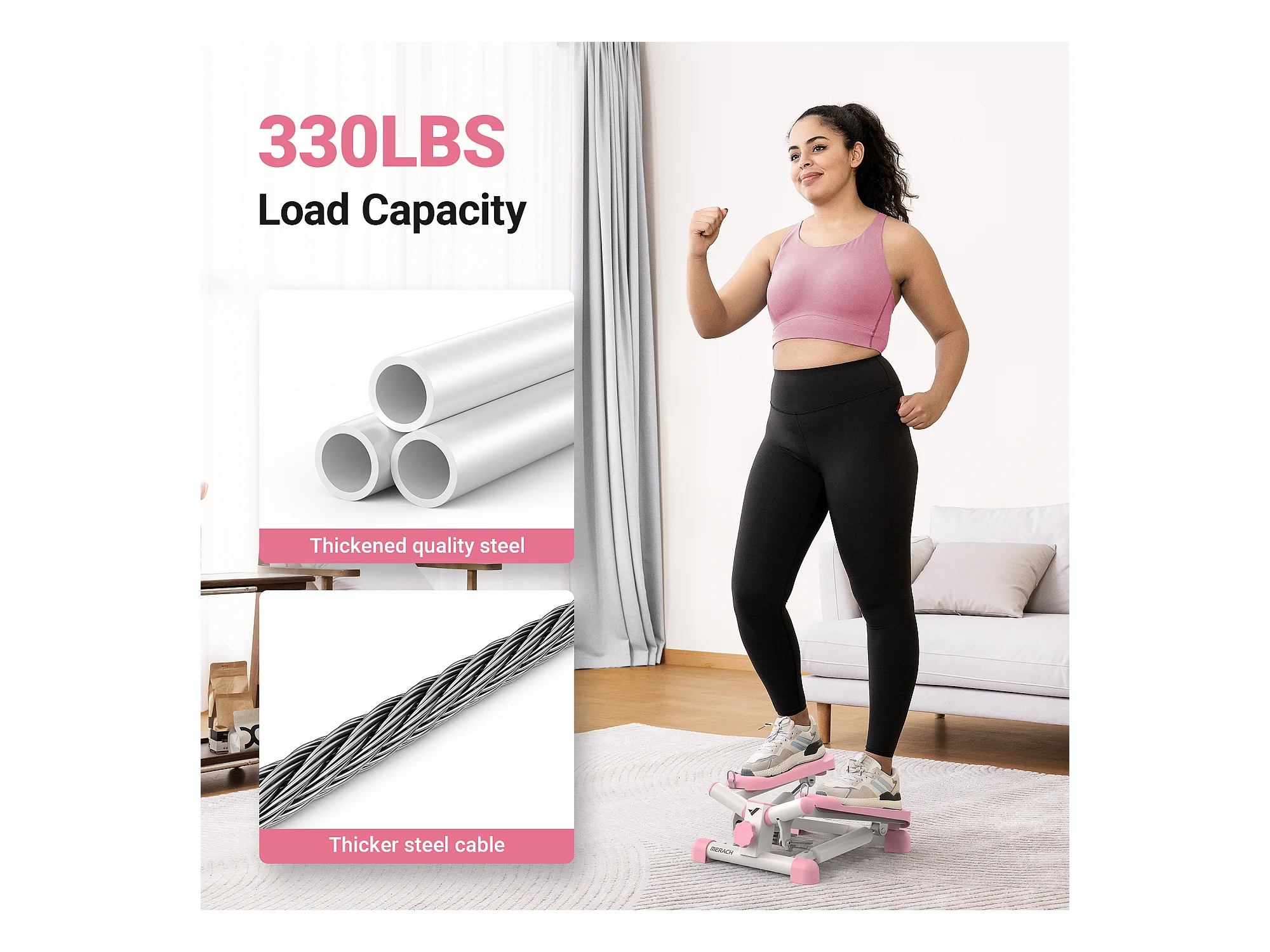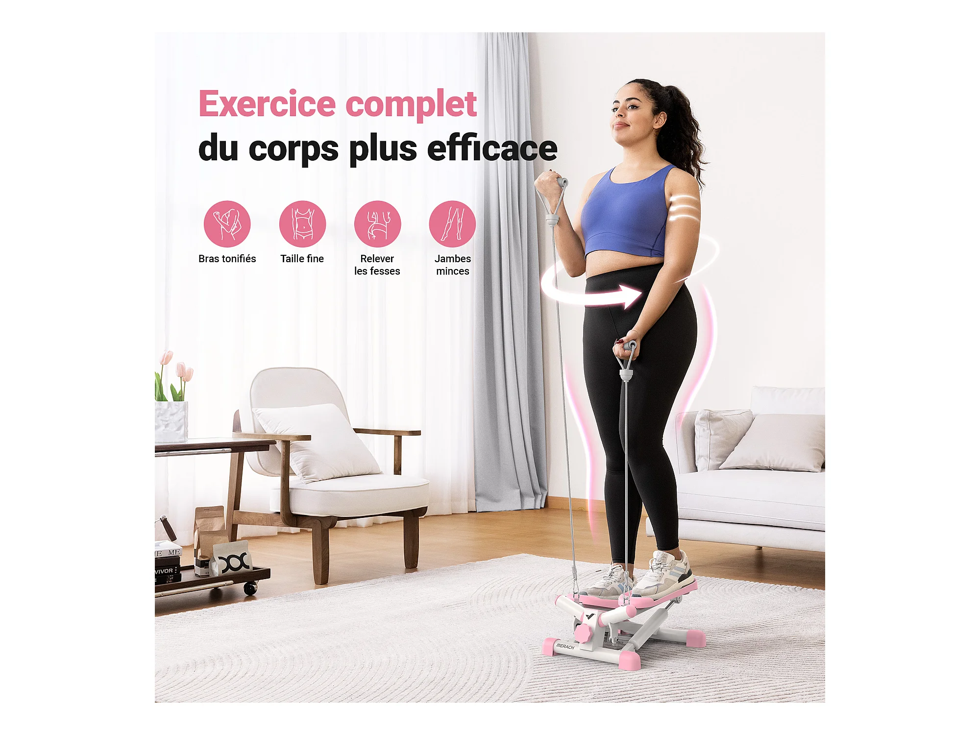 Plateau de torsion MERACH, Twist Board avec 2 cordes élastiques 2×10kg, tonifie corps et abdos, compact, charge 136kg, rose