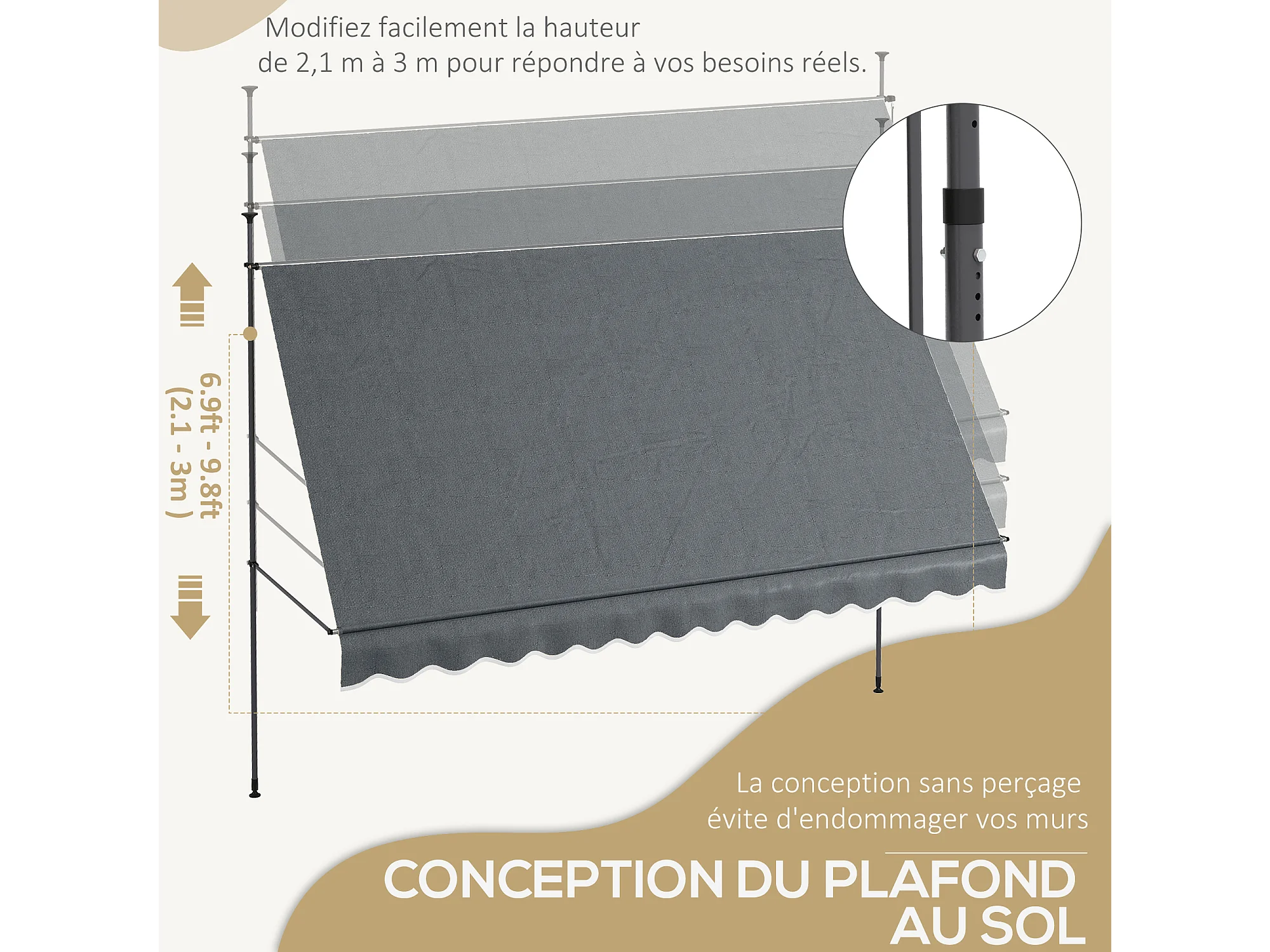 Store banne autoportant manuel rétractable 3,5L x 1,2l x 2,1-3H m inclinaison réglable métal alu polyester gris