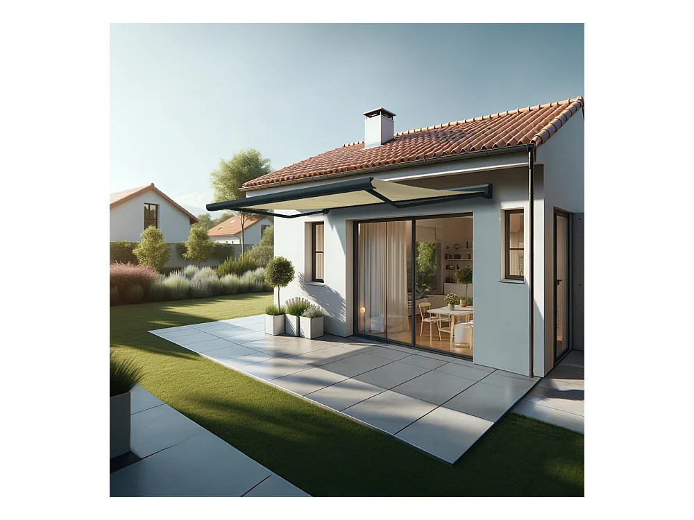 Store banne coffre CELESTE 4,00x3,00 m Motorisé Secours à Télécommande + LED - Gris - Écru