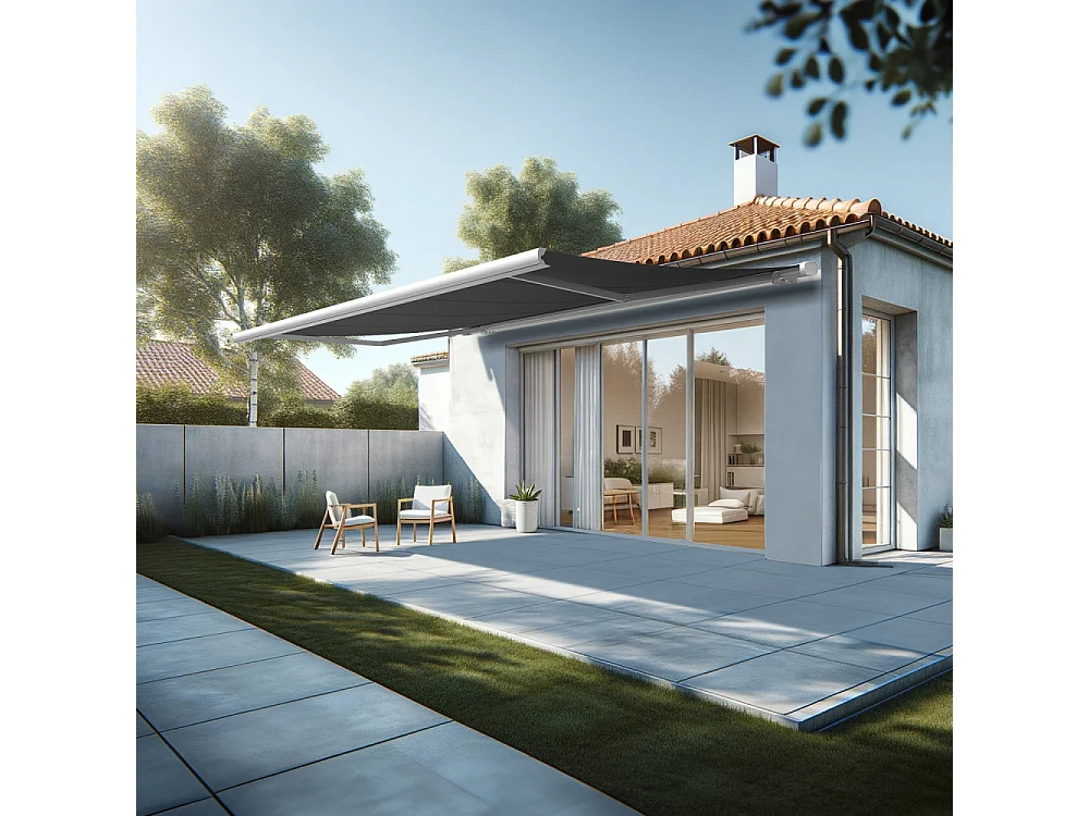 Store banne coffre MEEL 5,00x3,00m (Motorisé à télécommande + manœuvre de secours - Gris Graphite - Blanc)