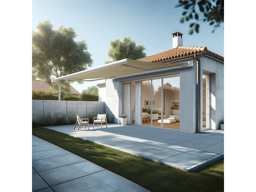 Store banne coffre MEEL 5,00x3,00m (Motorisé Secours à Télécommande + LED - Ecru - Blanc)
