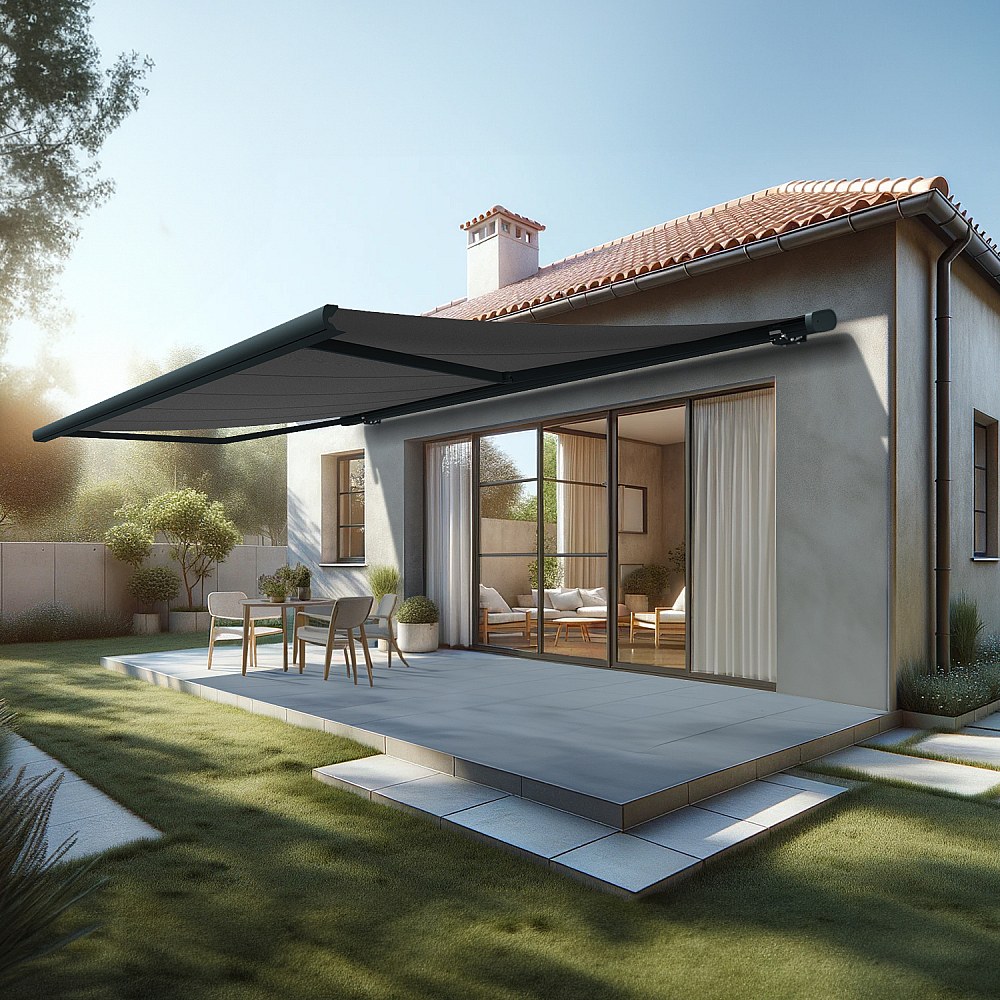 Store banne coffre MEEL 6,00x3,00m (Motorisé à télécommande + manœuvre de secours - Gris Graphite - Gris anthracite)