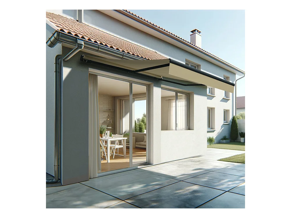 Store banne monobloc ESPAI 4,00x3,00m (Motorisé à télécommande + manœuvre de secours - Ecru - Gris anthracite)