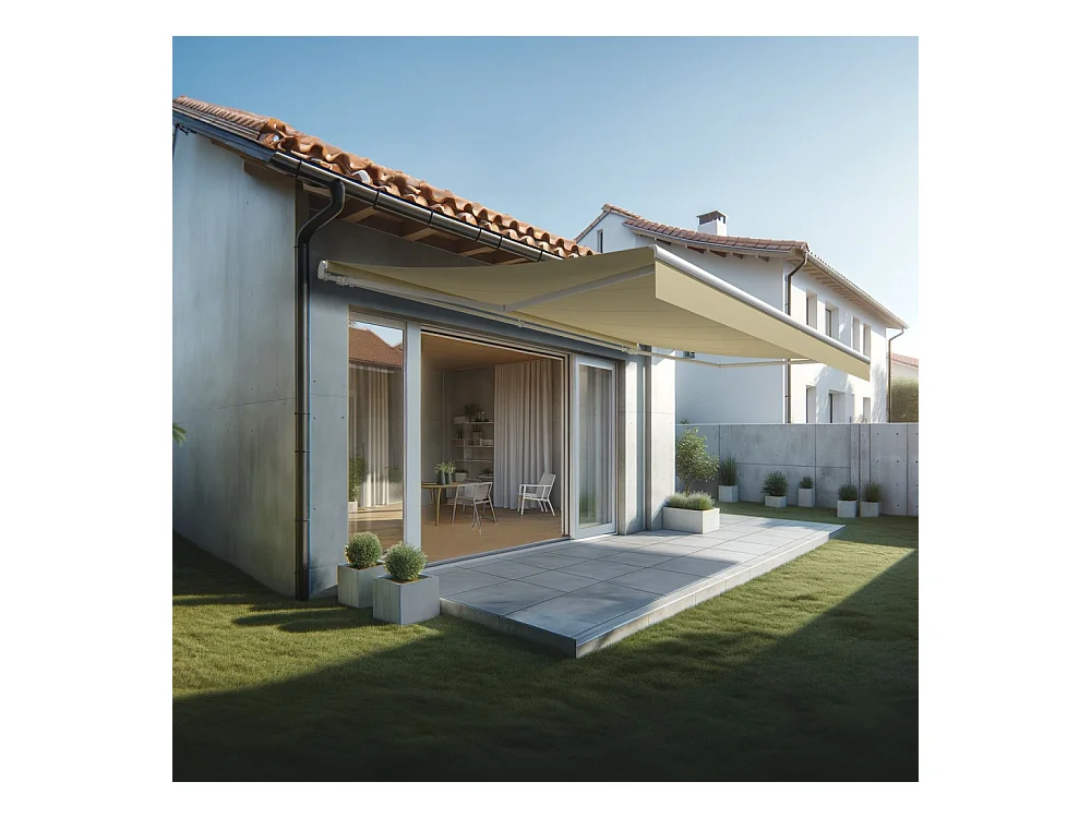 Store banne monobloc ESPAI 6,00x3,50m (Motorisé à télécommande + manœuvre de secours - Ecru - Blanc)