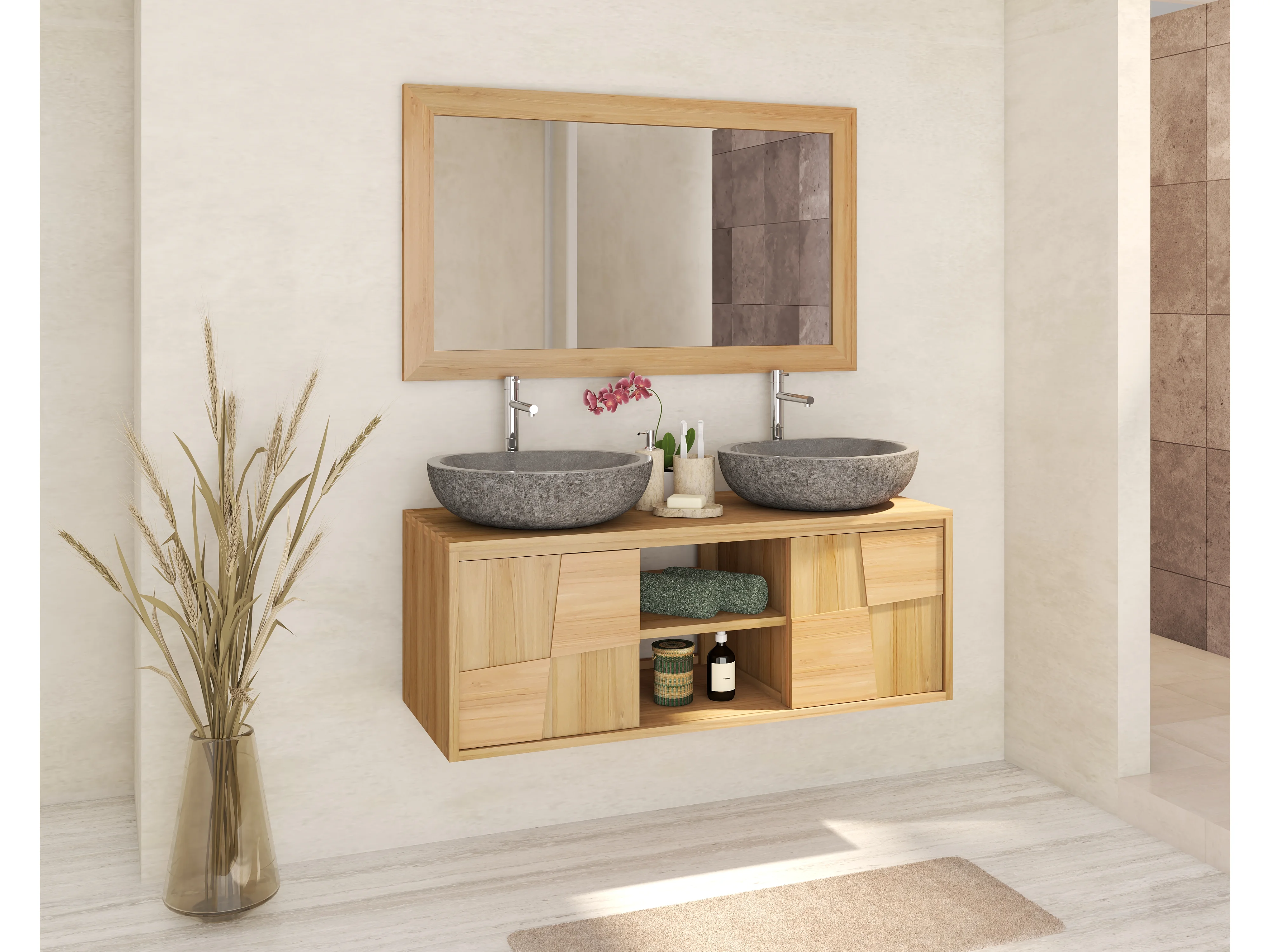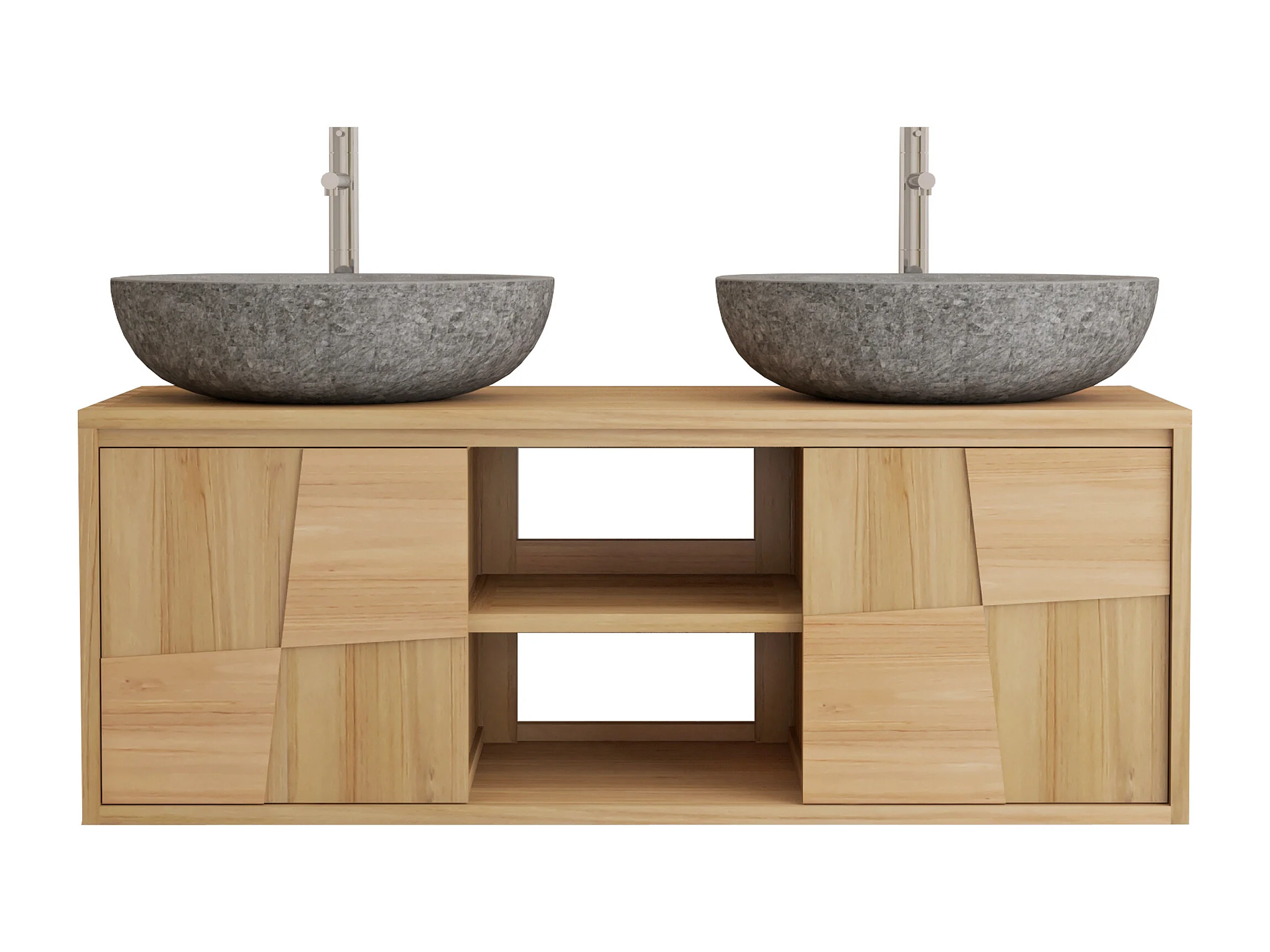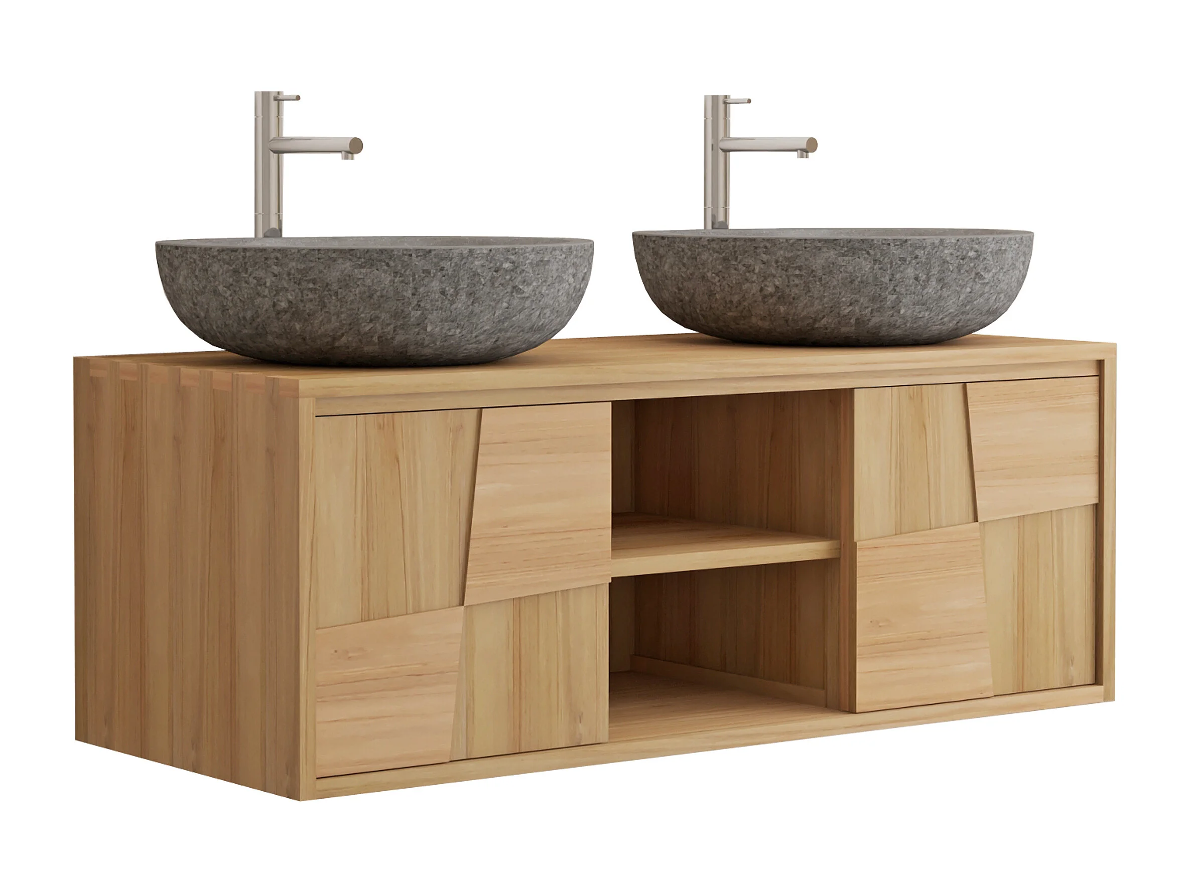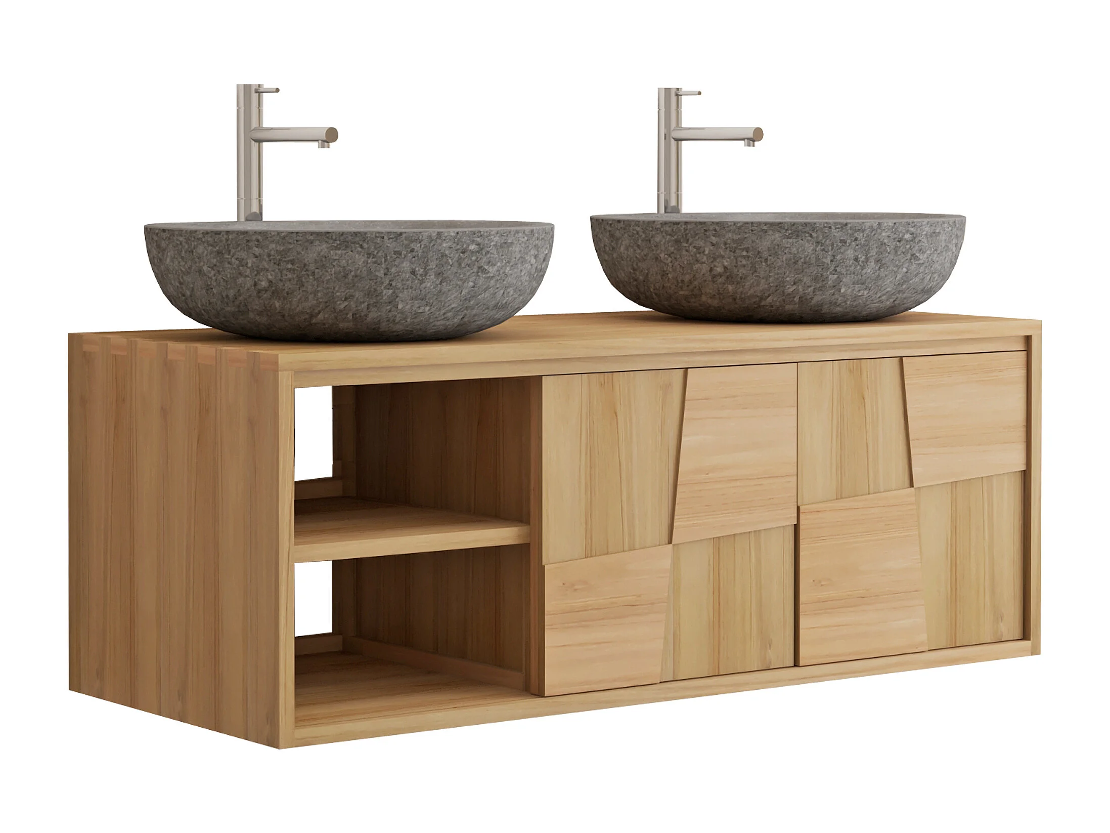Meuble de salle de bain suspendu en teck avec double vasque à poser ronde en pierre de rivière grise - L120 cm - SUMBAWA