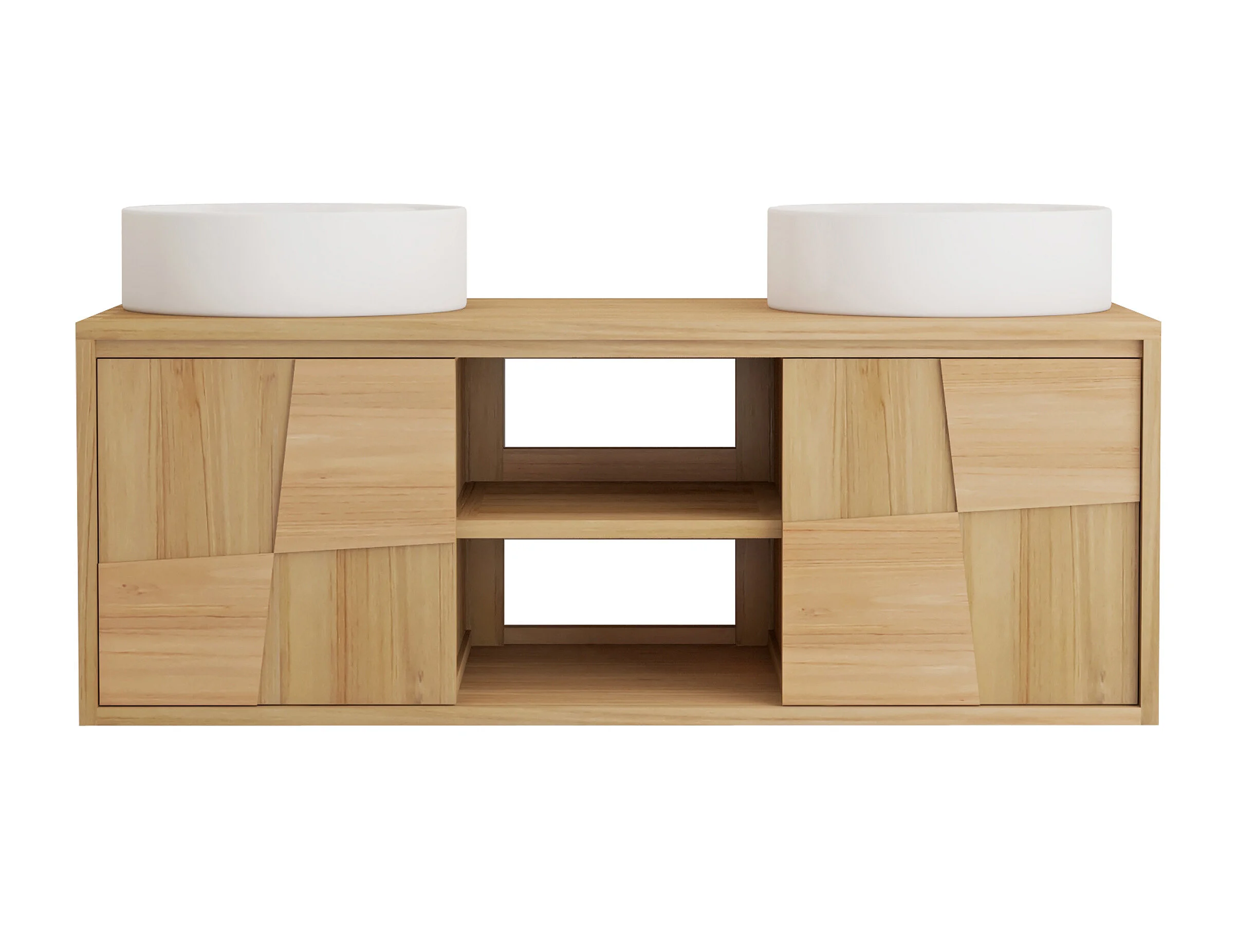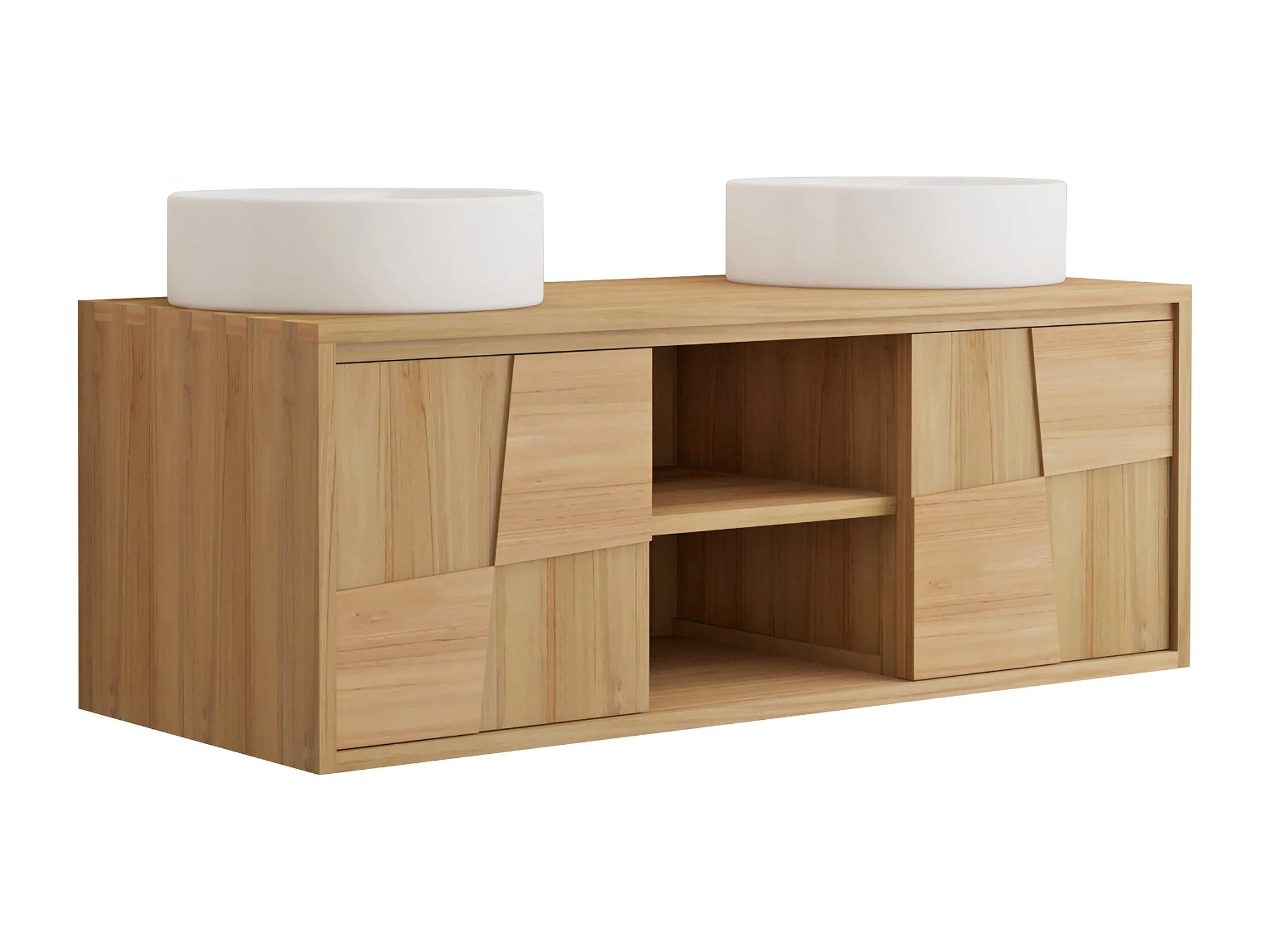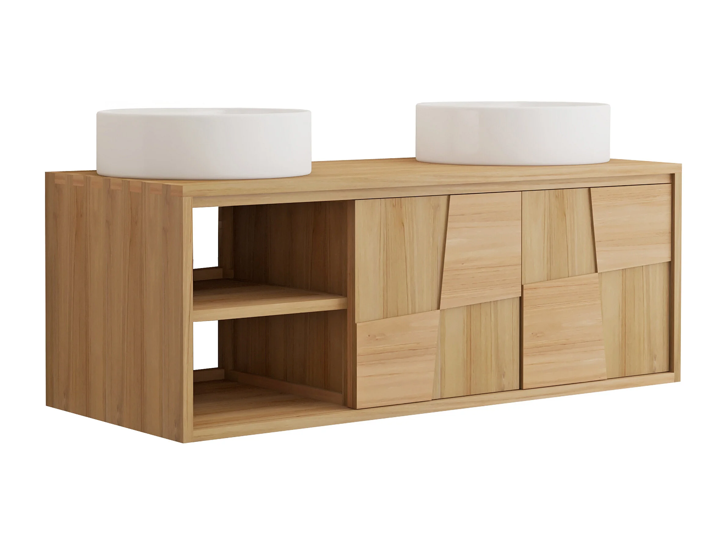 Meuble de salle de bain suspendu en teck avec vasque à poser ronde en céramique - L120 cm - SUMBAWA