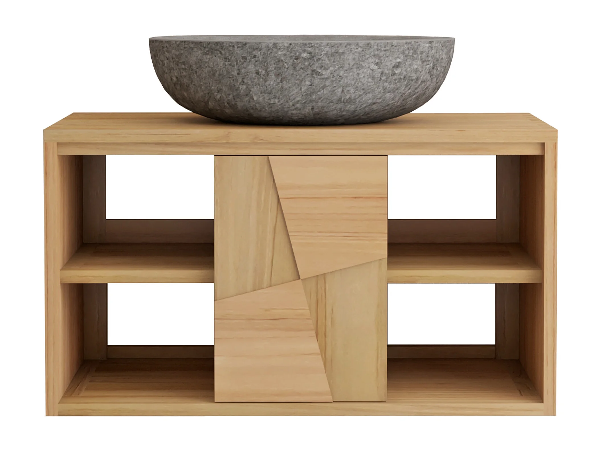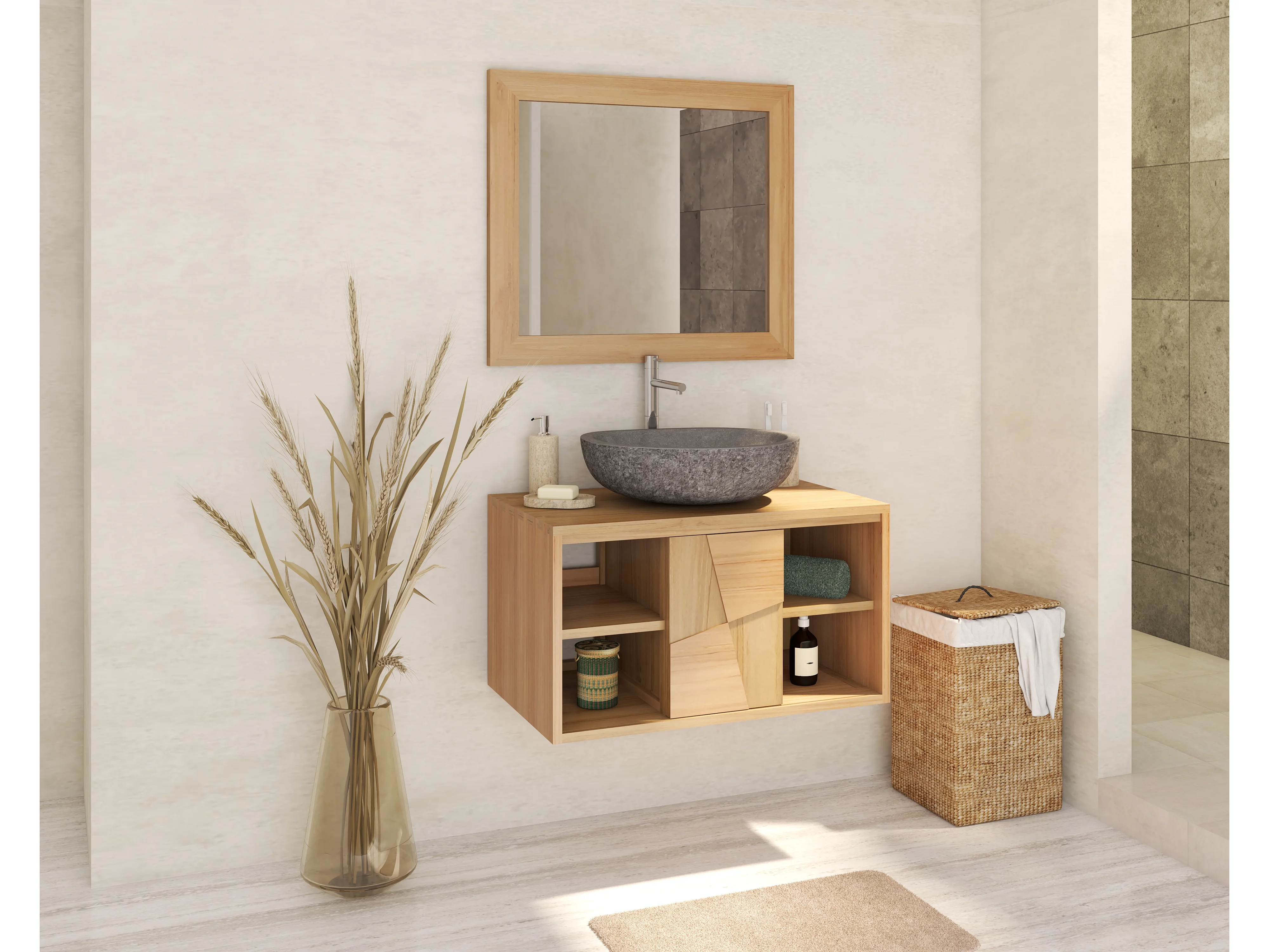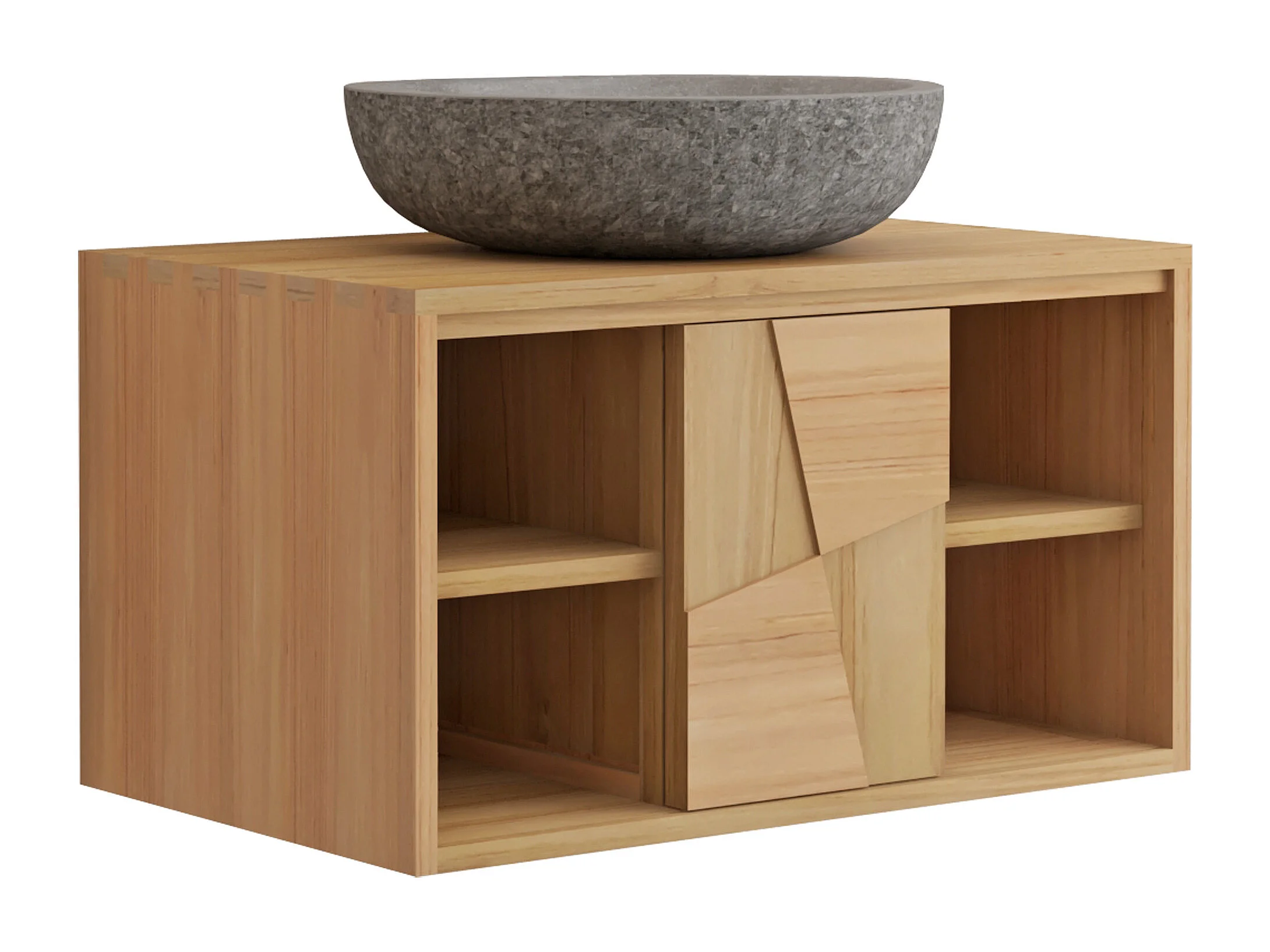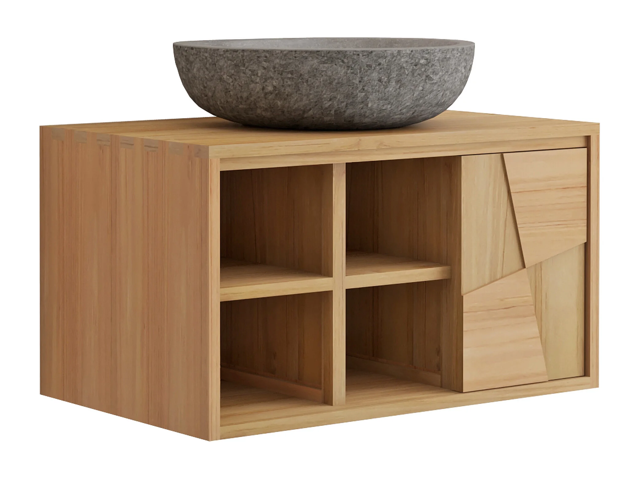 Meuble de salle de bain suspendu en teck avec vasque à poser ronde en pierre de rivière grise - L80 cm - SUMBAWA