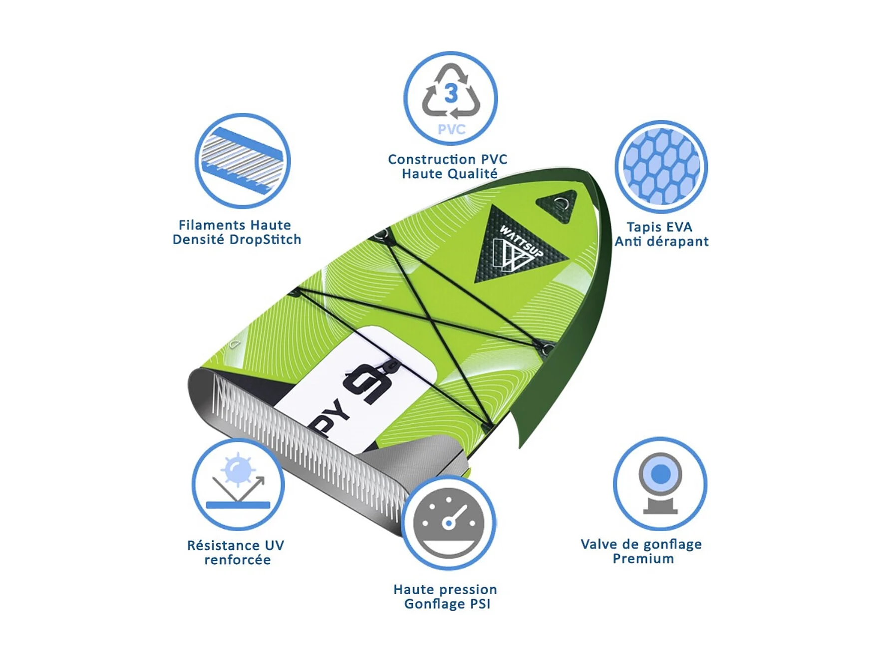 SUP Paddle Gonflable Vert Guppy 9' Wattsup Dropstitch Pack complet - Jusqu'à 80kg - 175l - 275x76x13cm (9'x30''x5'')
