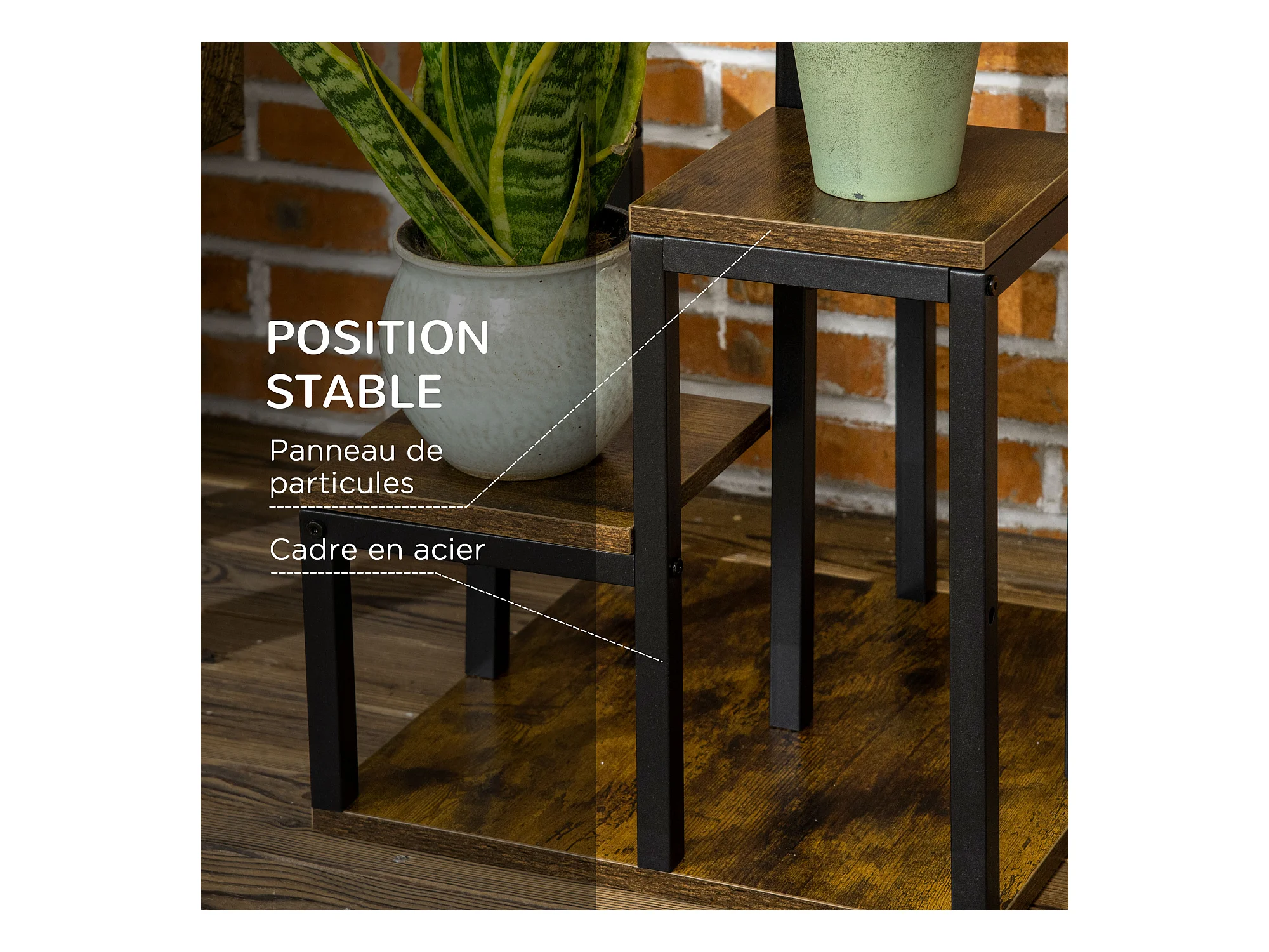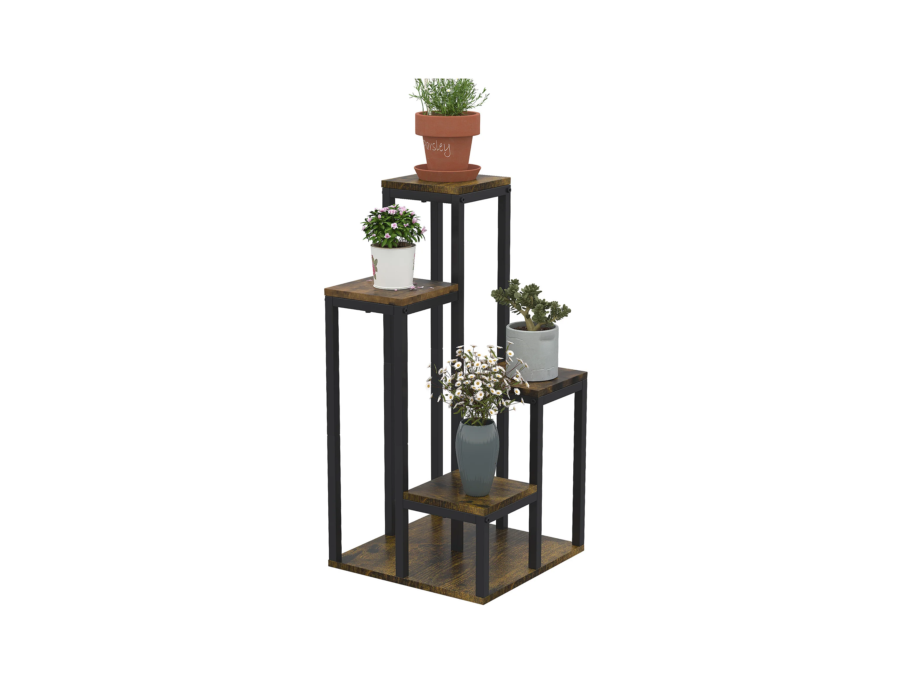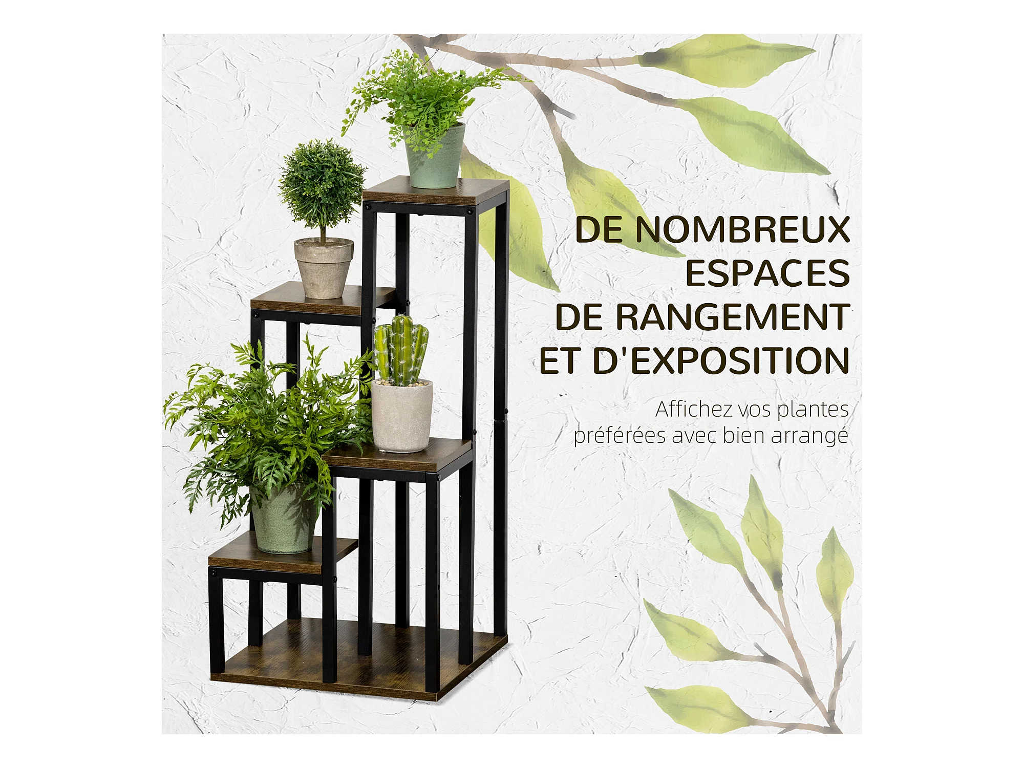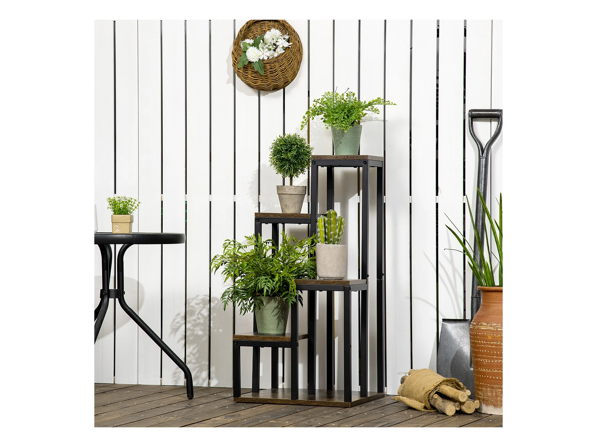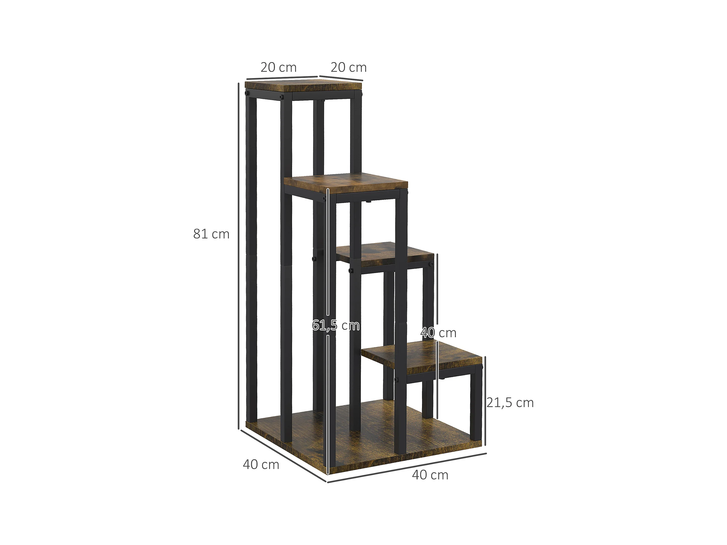 Support à fleurs style industriel 5 niveaux - porte plante 4 étagères - acier époxy noir aspect bois foncé