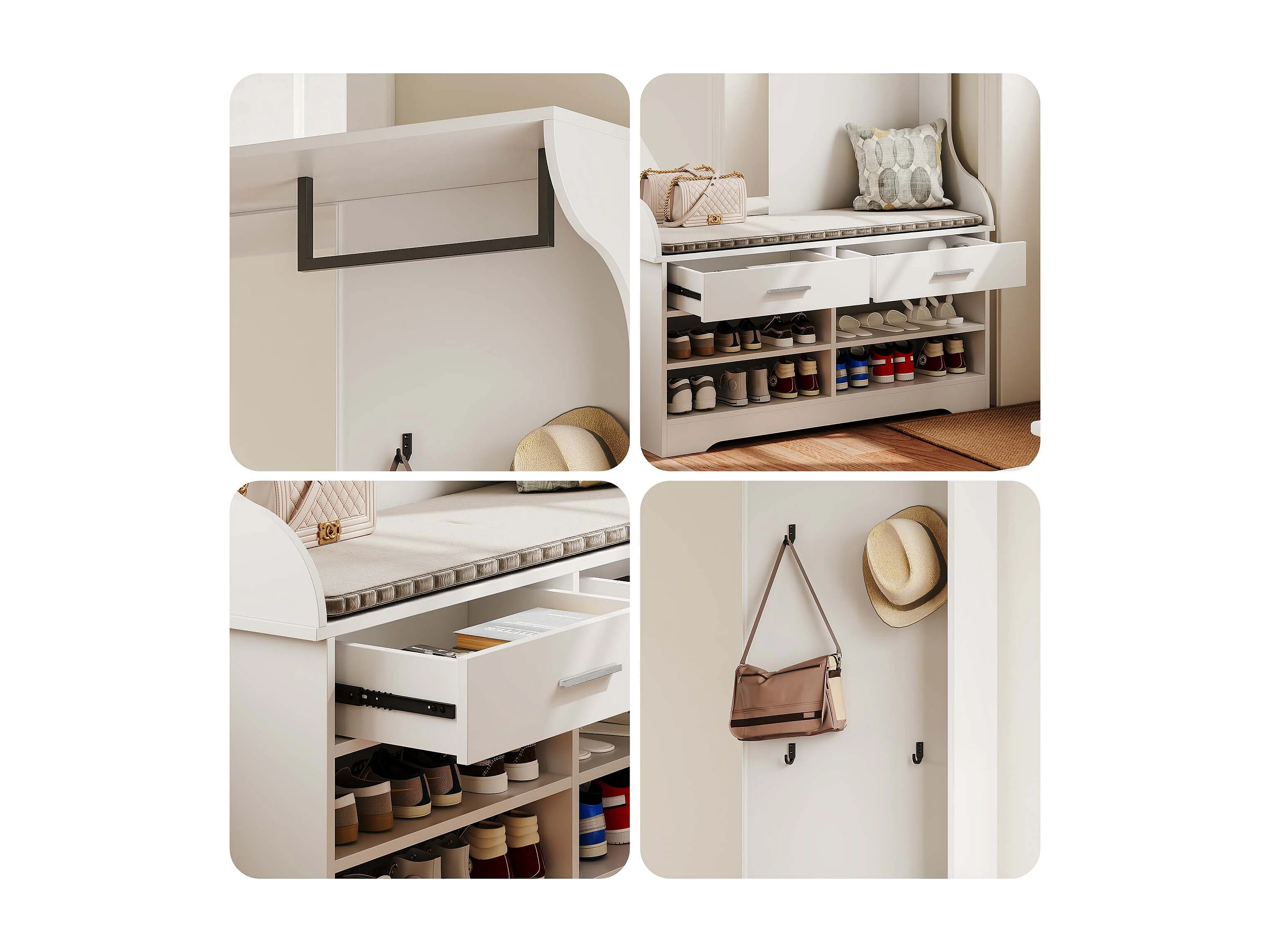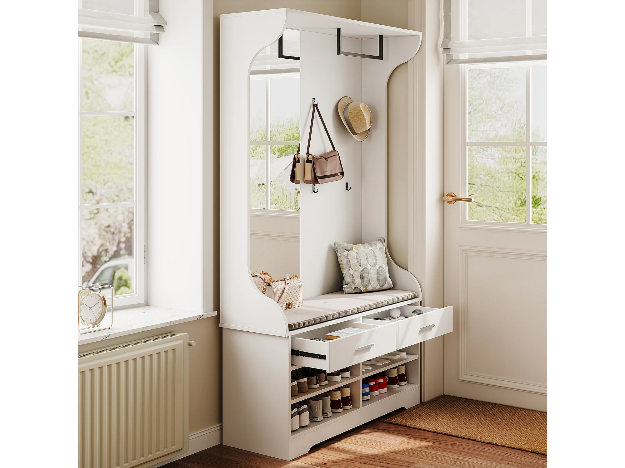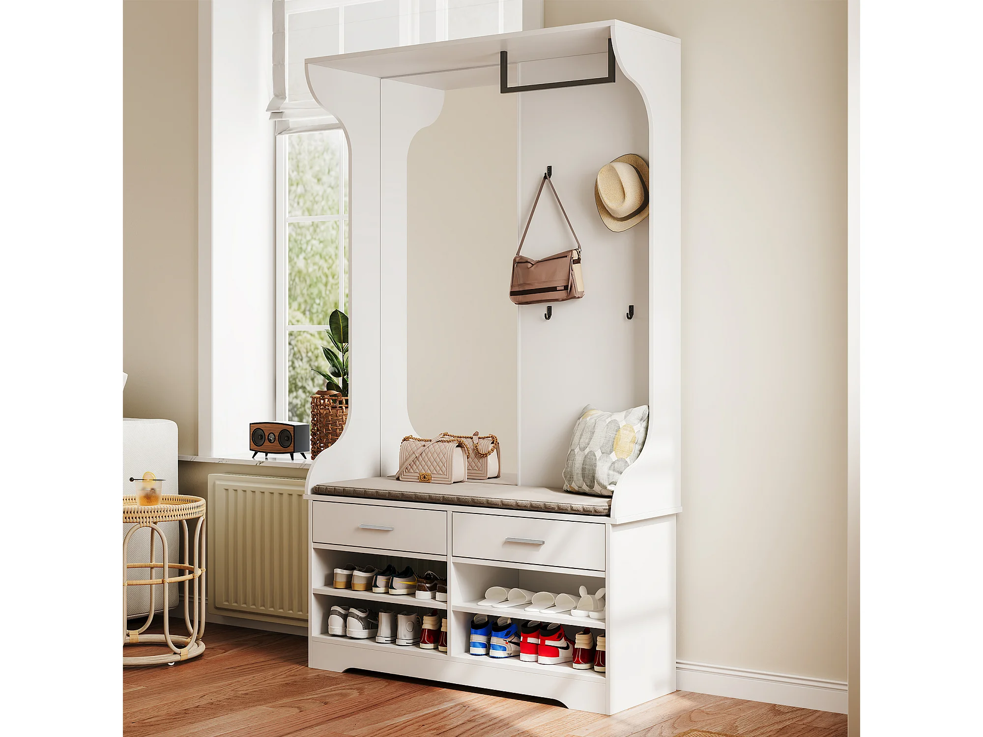 Support de manteau avec banc de chaussures et stockage de chaussures, porte-manteaux multifonctionnel avec miroir et crochet de manteau 4 et tige suspendue et 2 tir